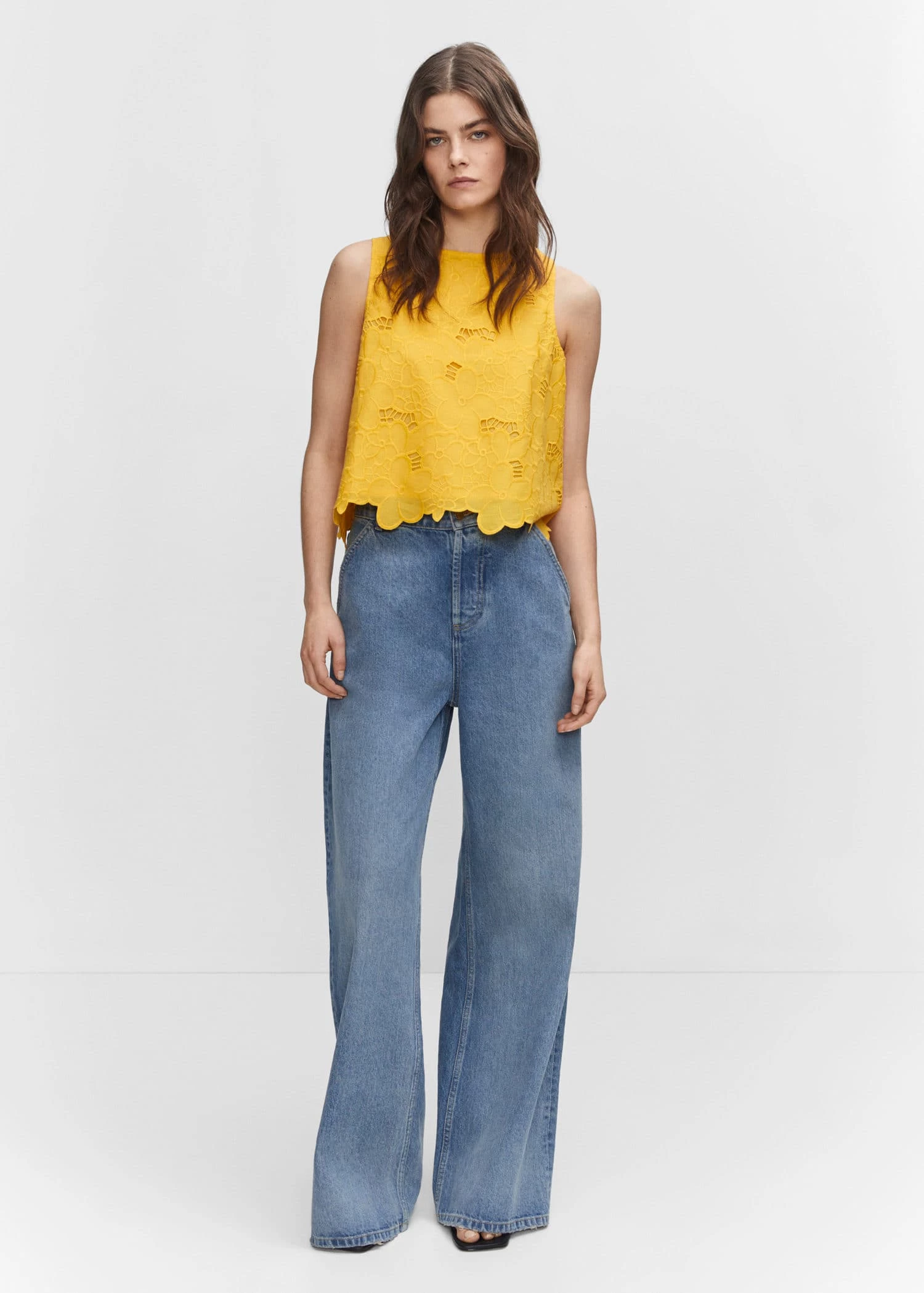 tissu 100 % coton, coupe droite, style crop, motifs floraux, col rond, bretelles larges, col boutonne, bas festonne, details brodes, details ajoures, la couleur bleue est une exclusivite en ligneComposition: 100% coton