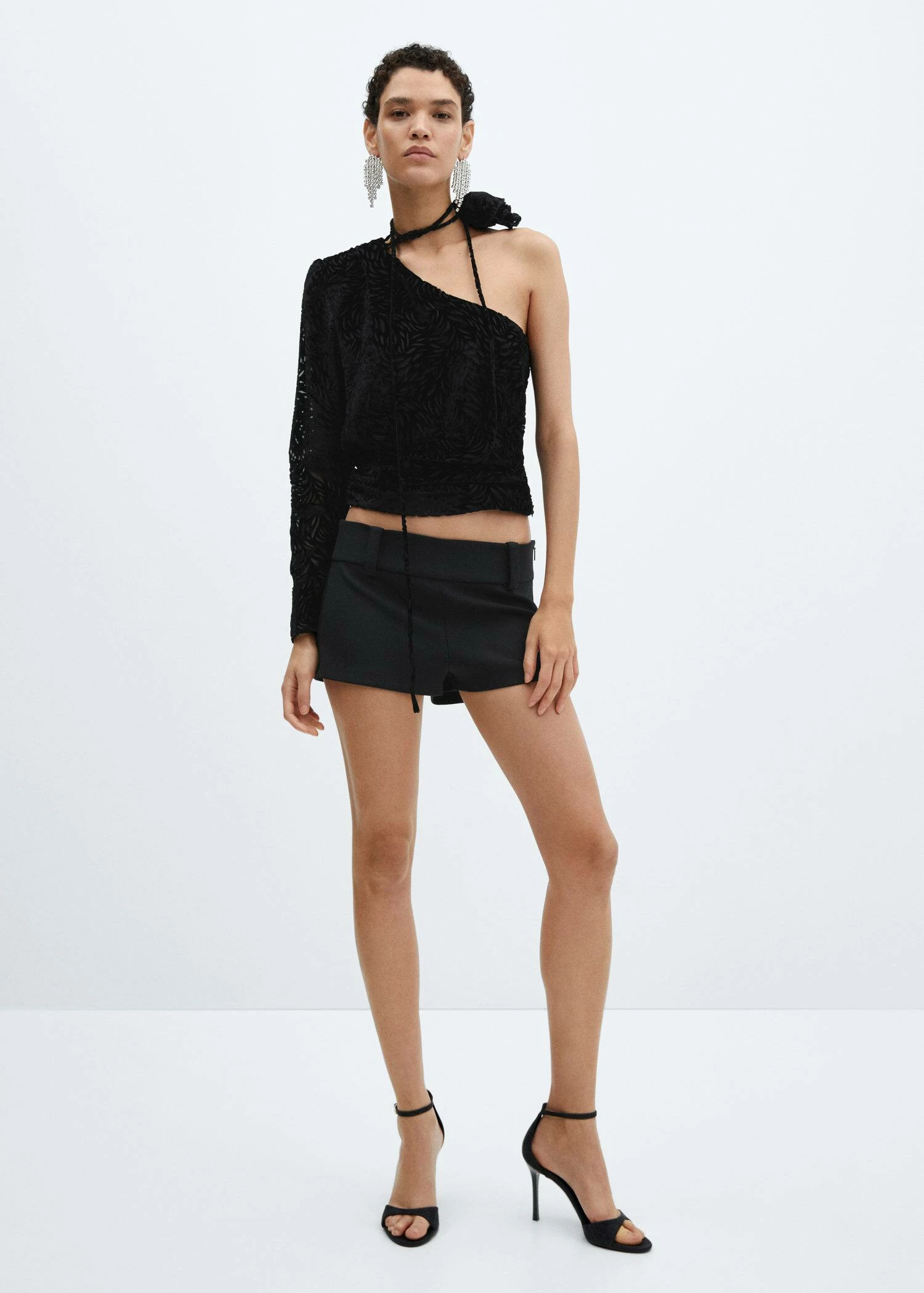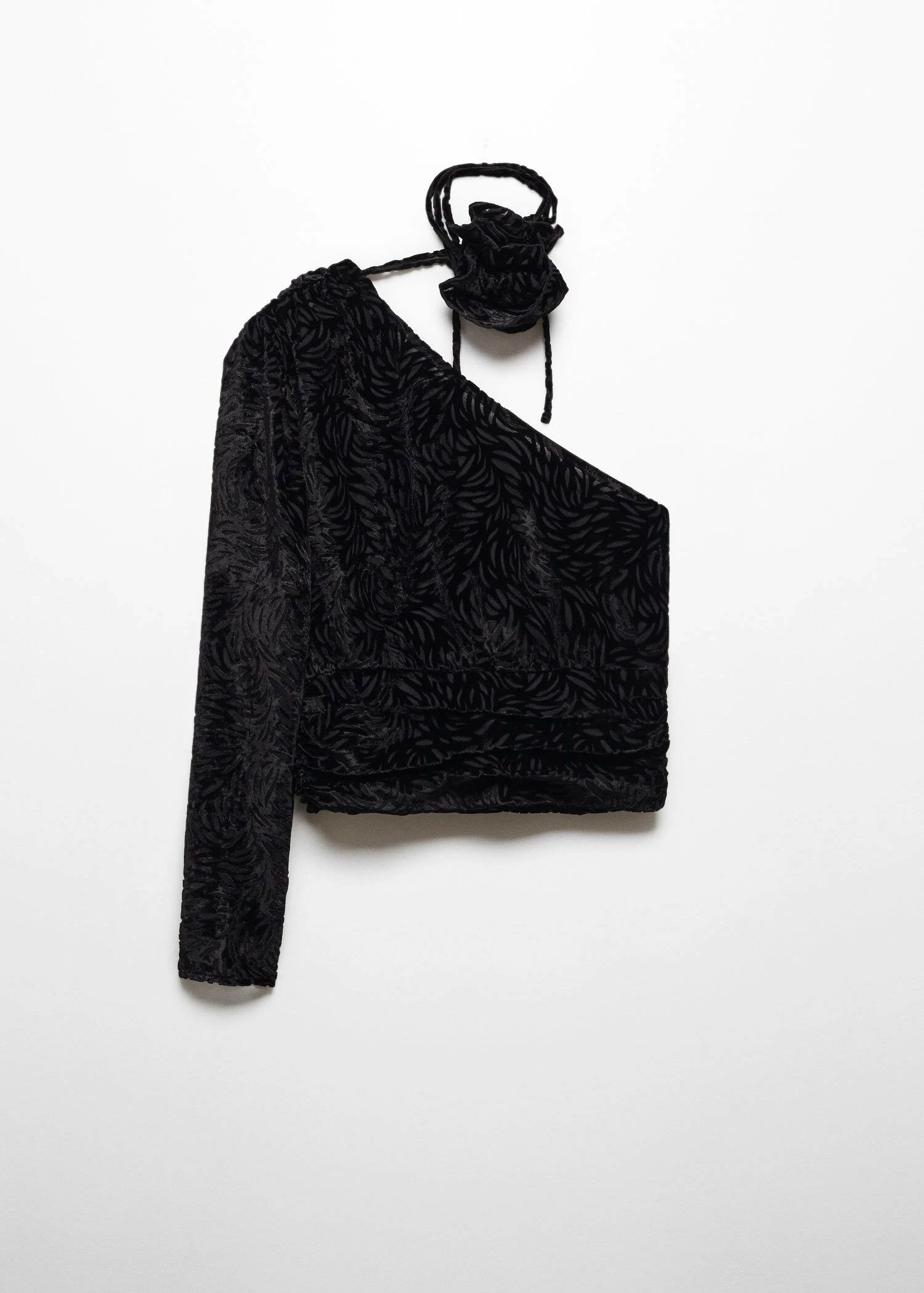 tissu en velours, coupe courte, droit, asymetrique, imprime floral, epaules denudees, manches longues, fermeture eclair invisible sur le cote, maxifleur, doublure, collection fetes et ceremonies.Composition: 65% viscose,35% polyamide. Doublure: 100% polyester