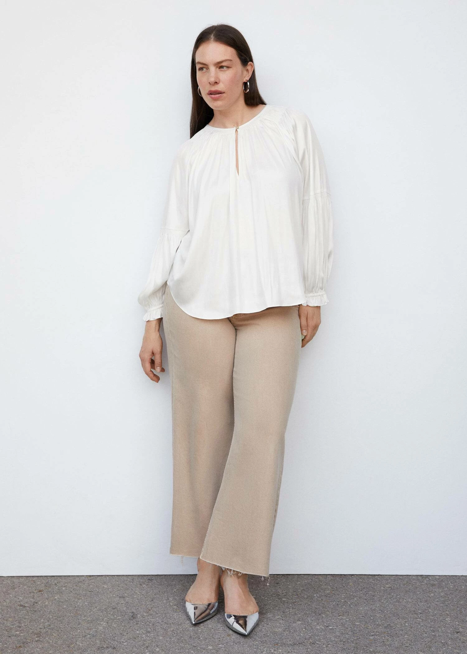 tissu fluide, droit, col rond, manches longues bouffantes, poignets elastiques, fermeture a bouton sur le devant, ouverture sur le devant, details fronces, disponible plus, style bohoComposition: 100% polyester