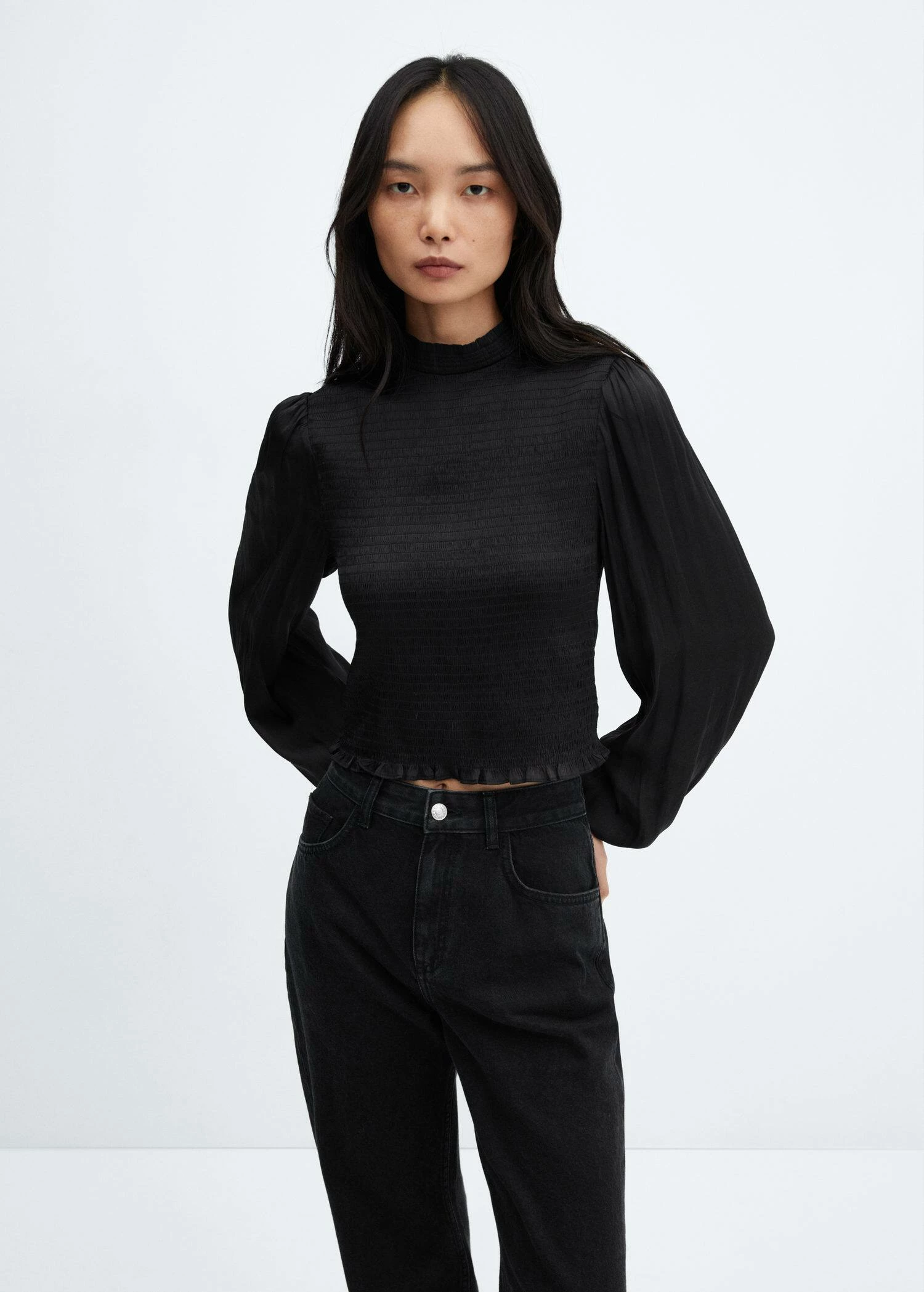 tissu elastique, tissu satine, fronce elastique, coupe cintree, col montant, manches longues bouffantes, poignets boutonnes, ouverture dans le dos avec boutonComposition: 100% polyester
