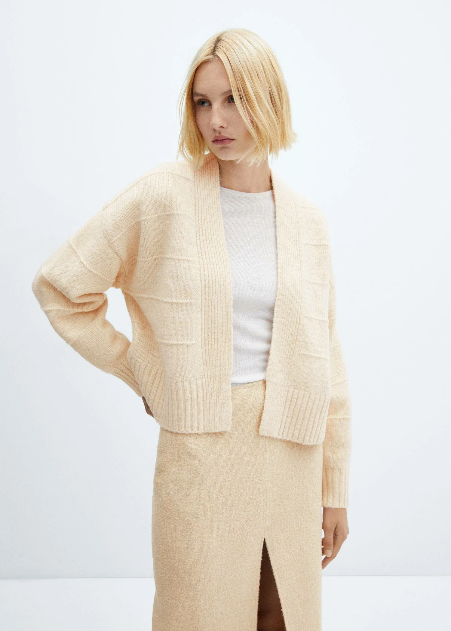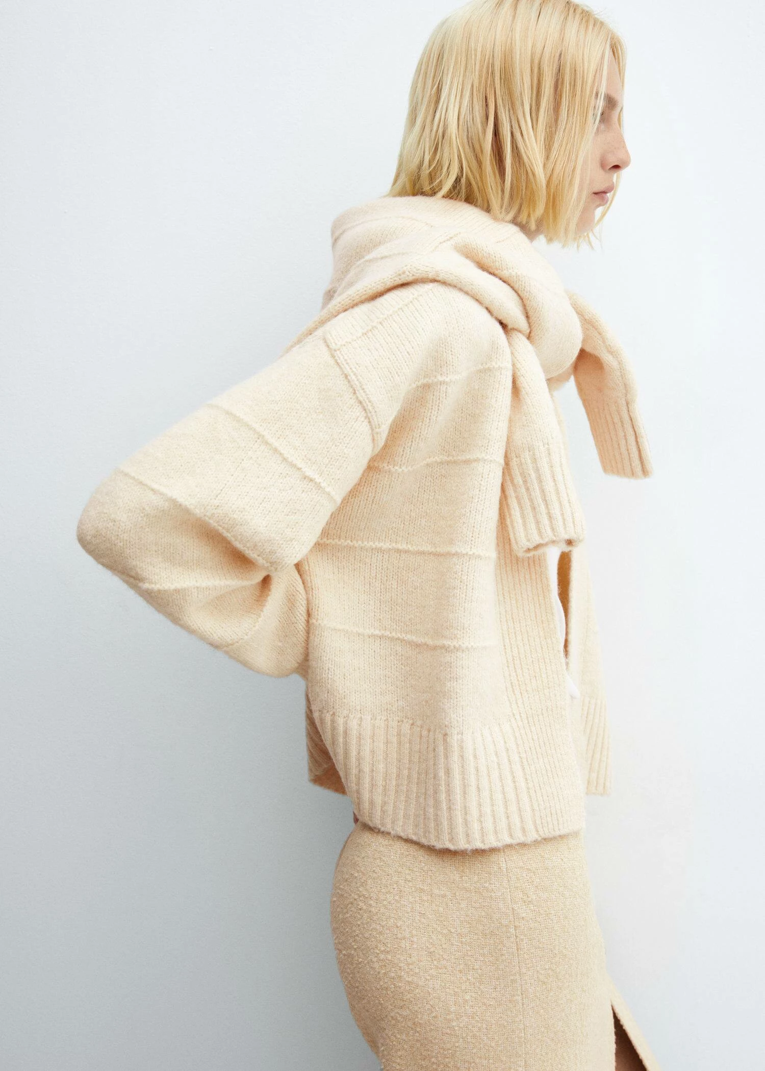 tissu de laine melange, tissu en grosse maille, coupe droite, coupe courte, manches longues, sans fermeture, coutures decoratives, bords cotelesComposition: 80% polyester,13% acrylique,5% laine,2% elasthanne