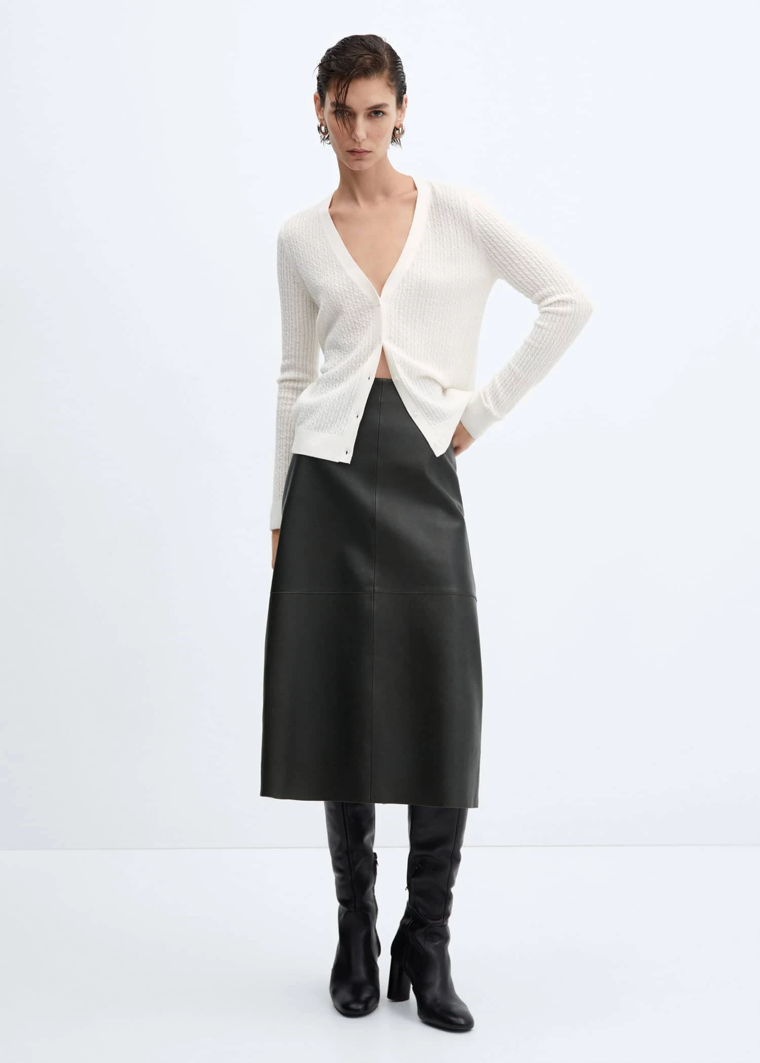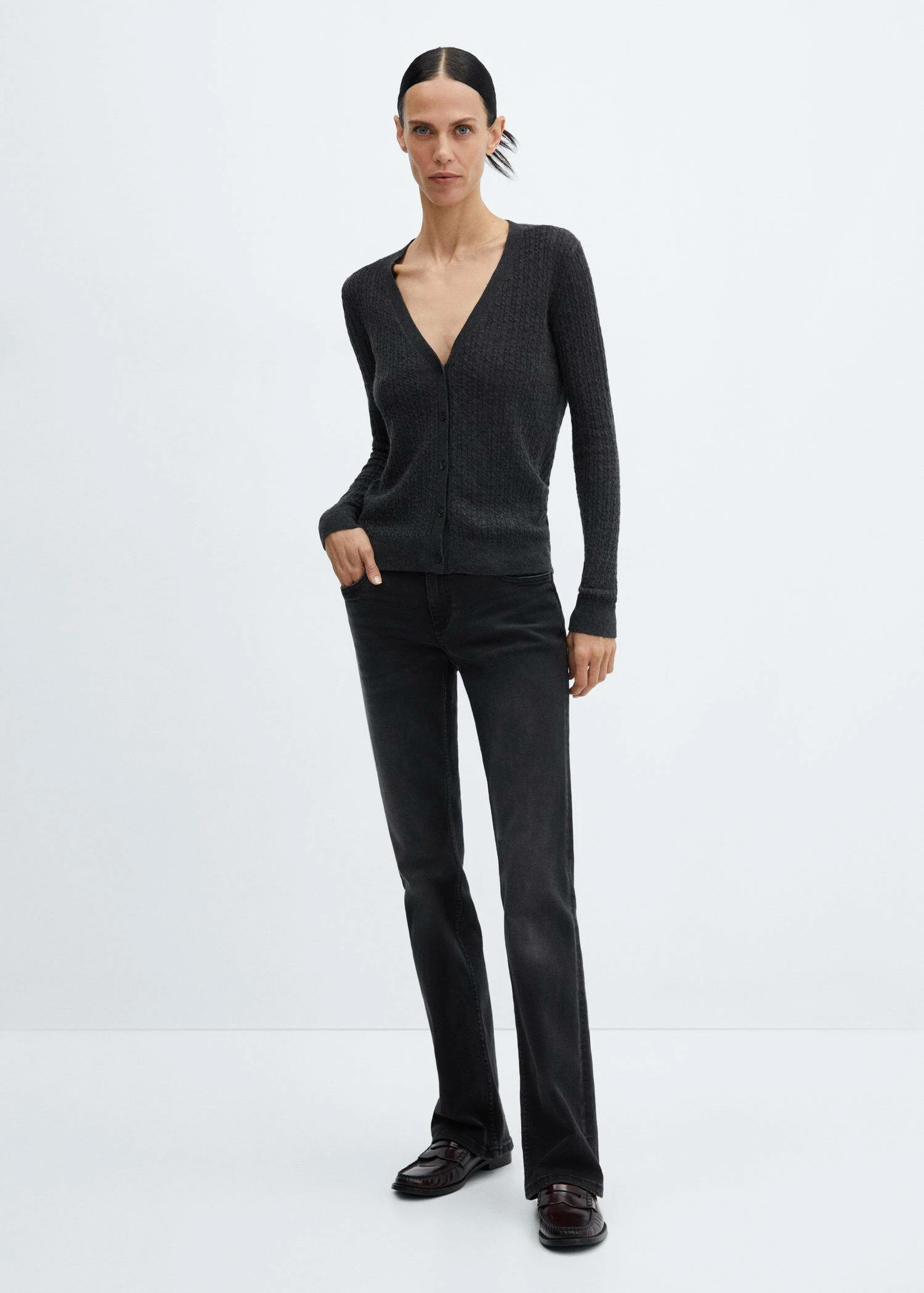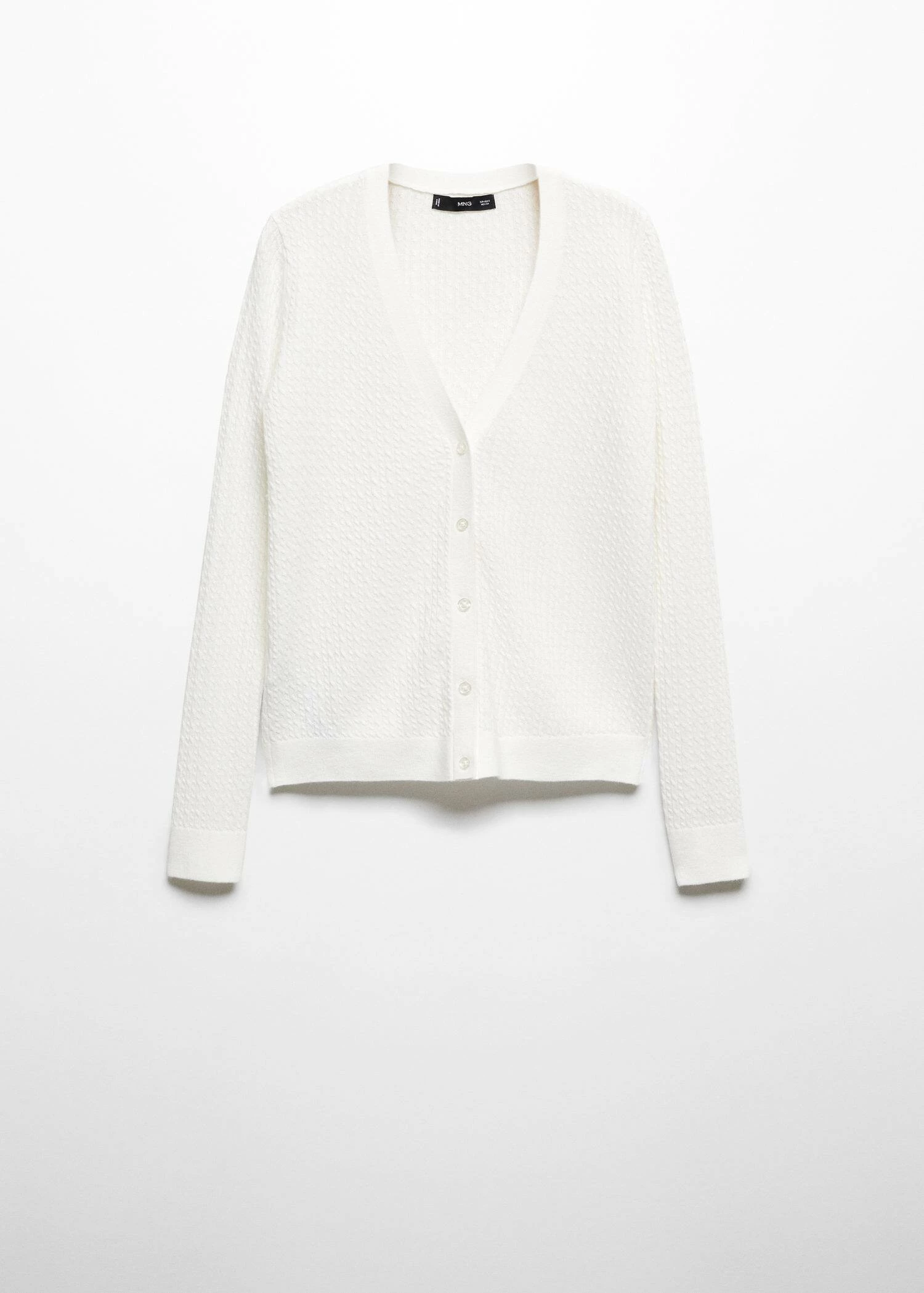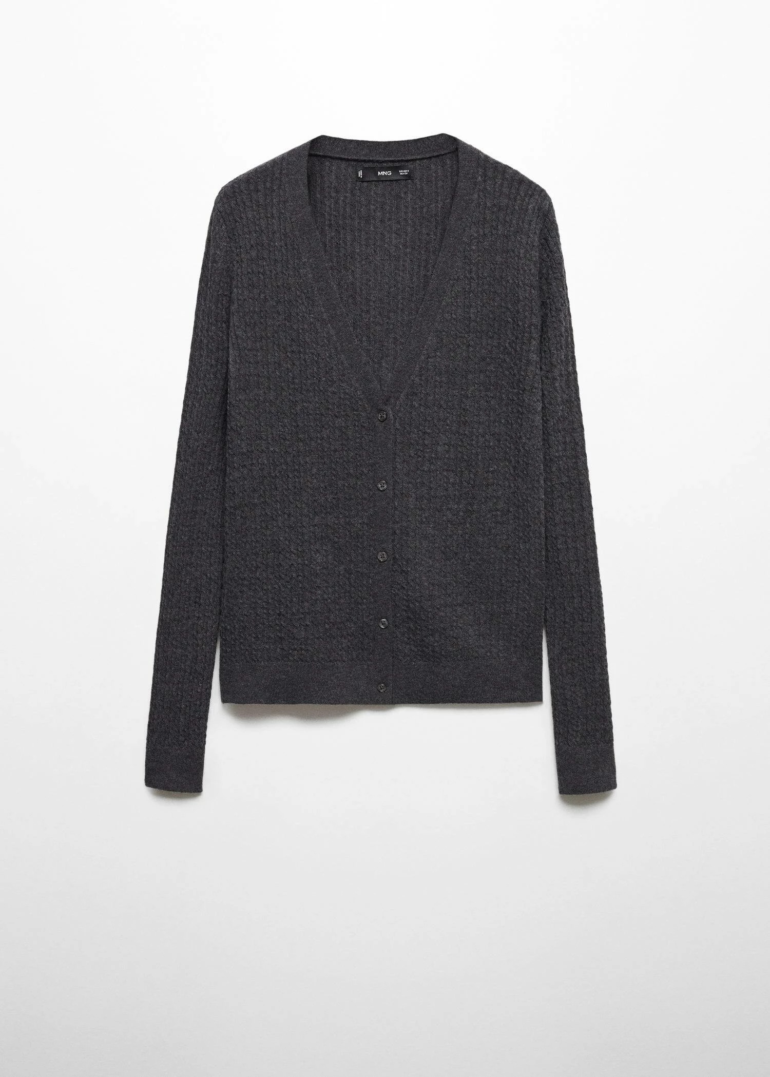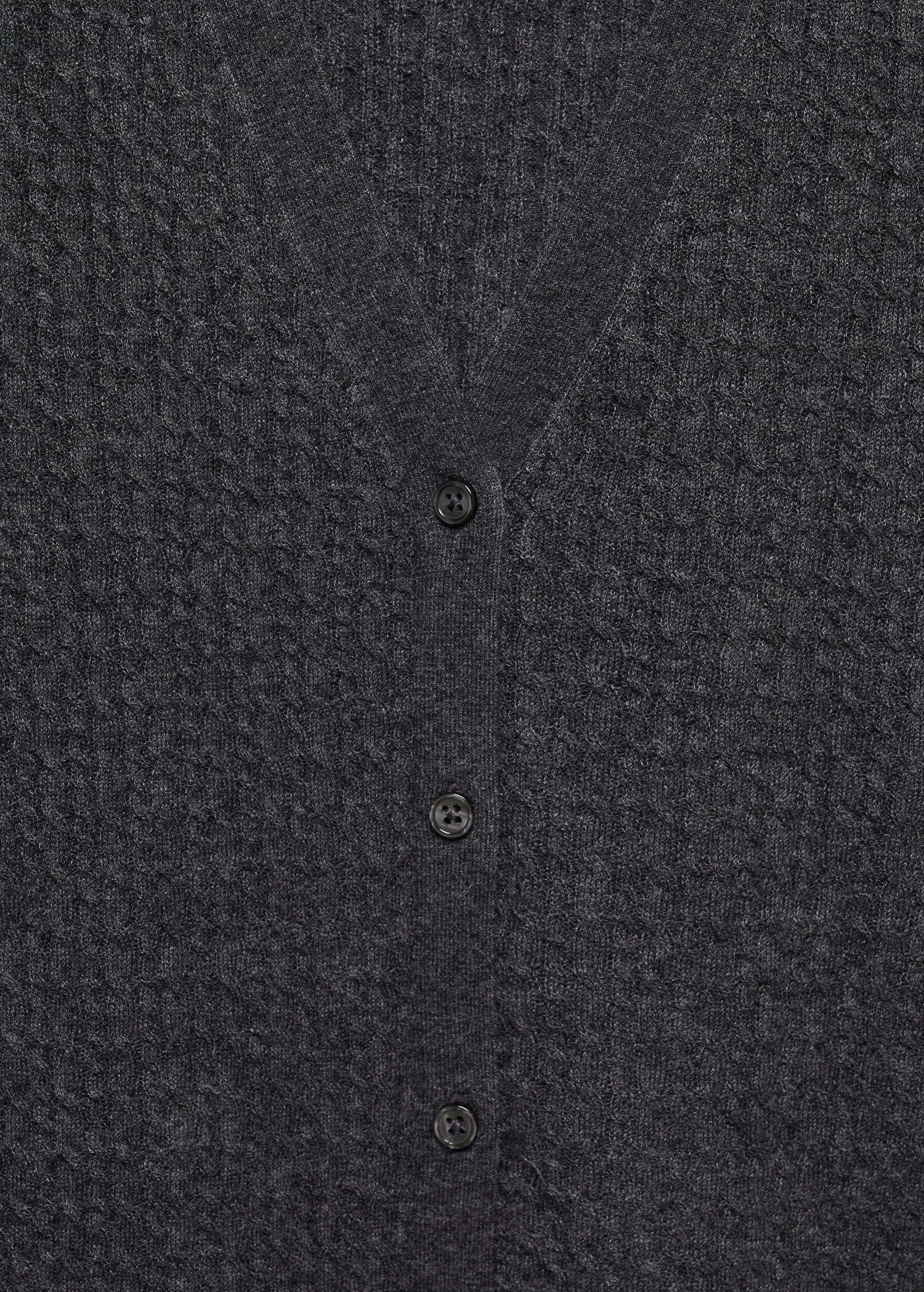 tissu en maille fine, tissu maille torsadee, tissu melange de laine recyclee, coupe cintree, col en v, manches longues, fermeture boutonnee sur le devant, bords cotelesComposition: 45% laine,26% polyamide,23% viscose,6% cashmere