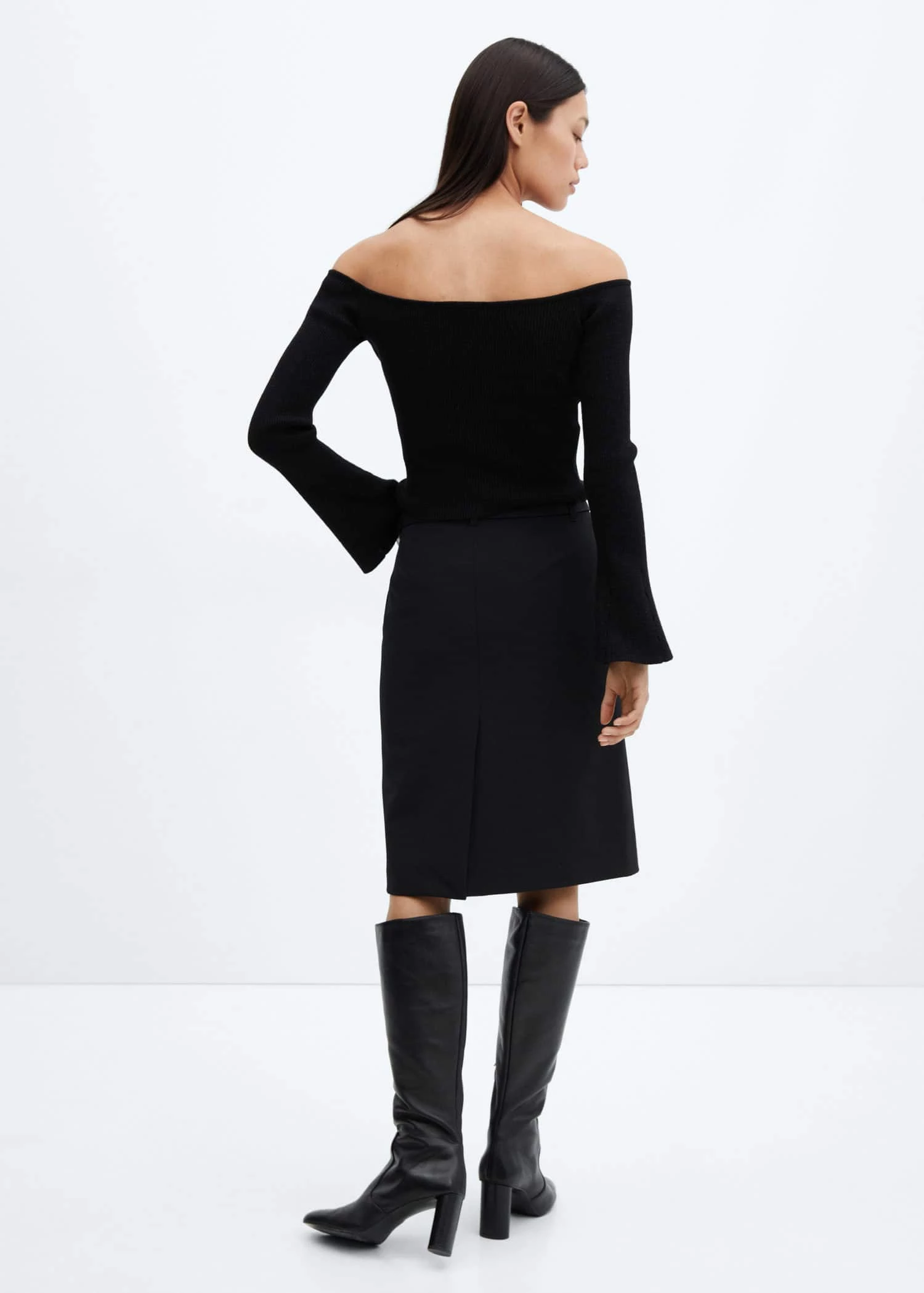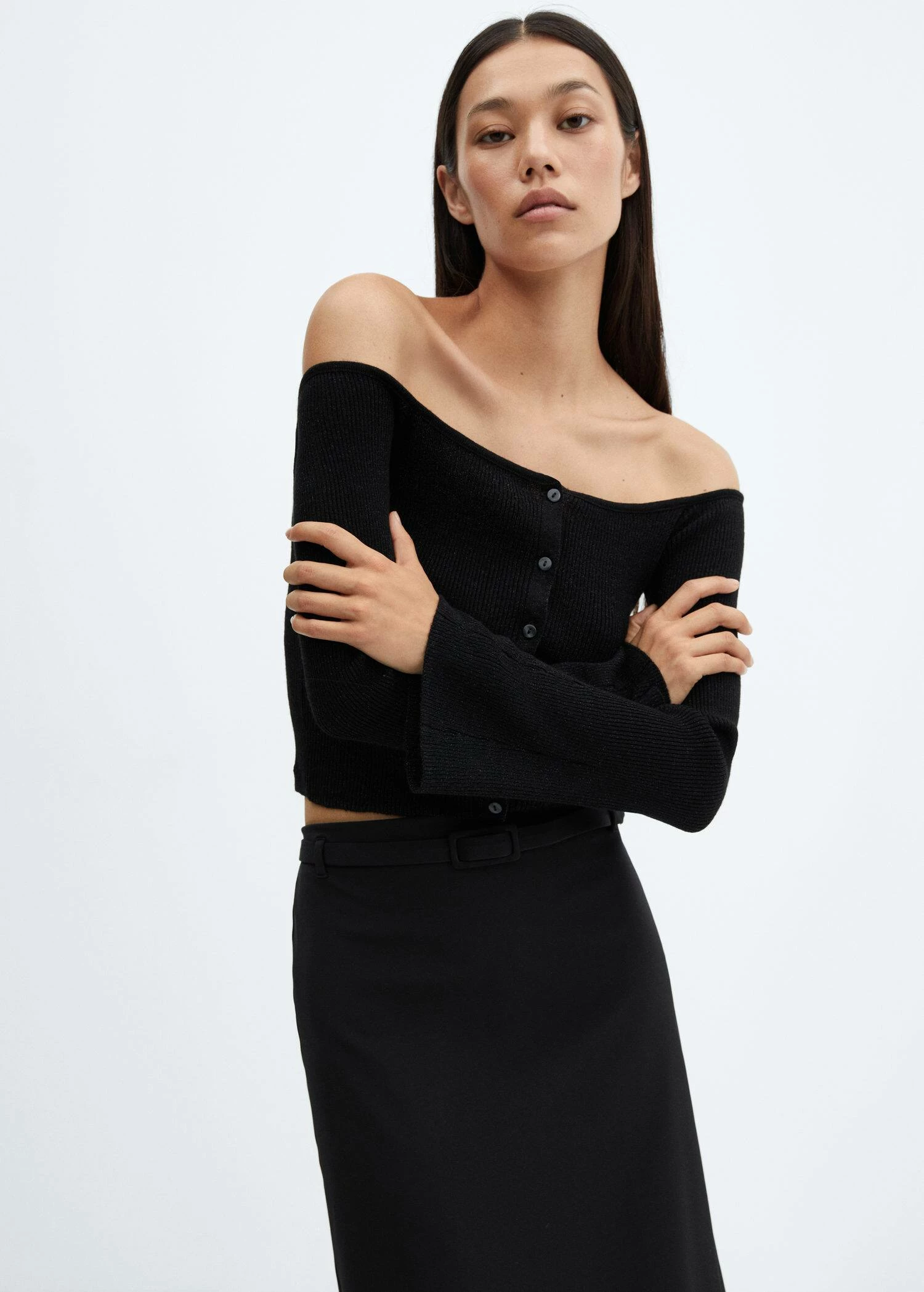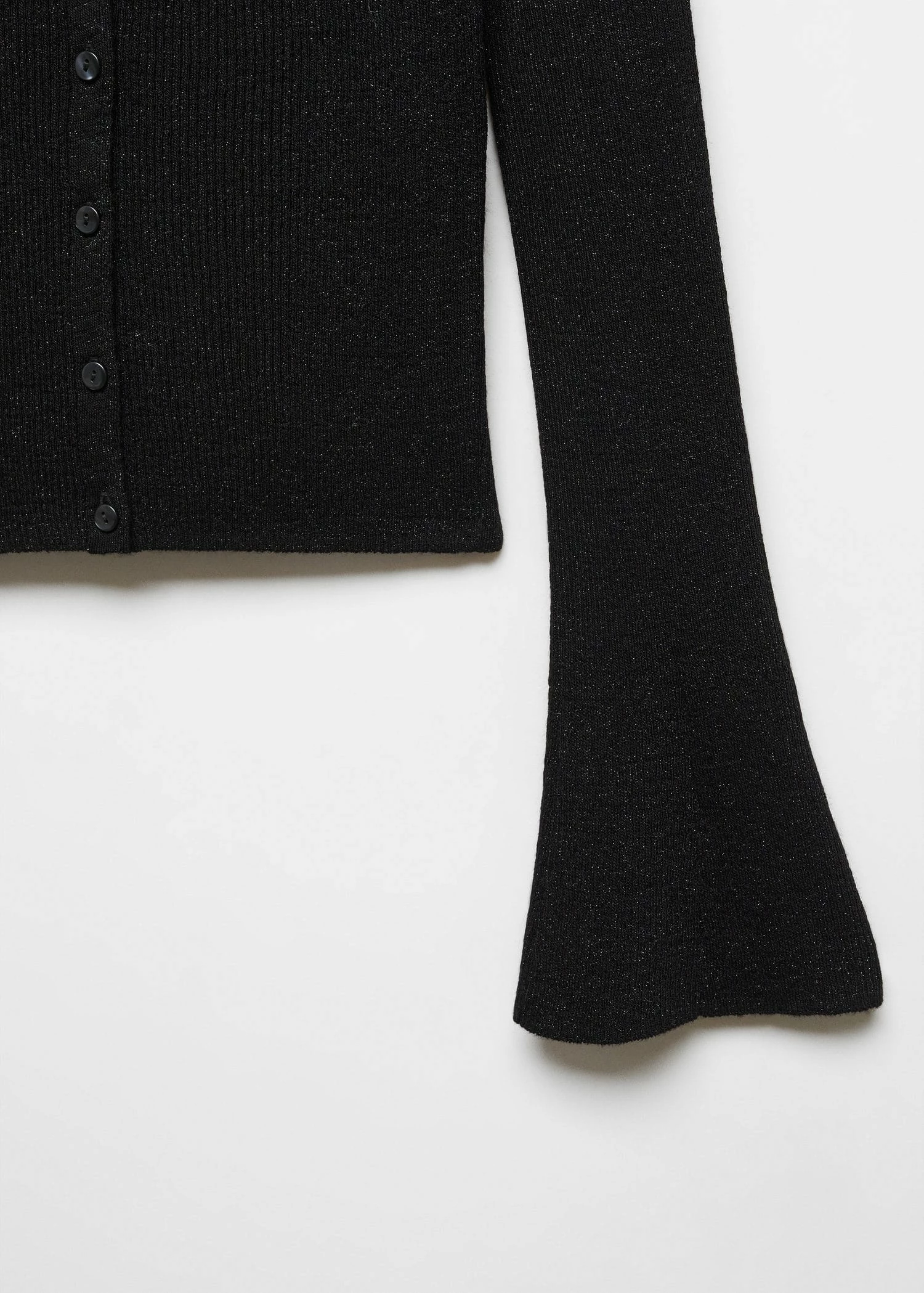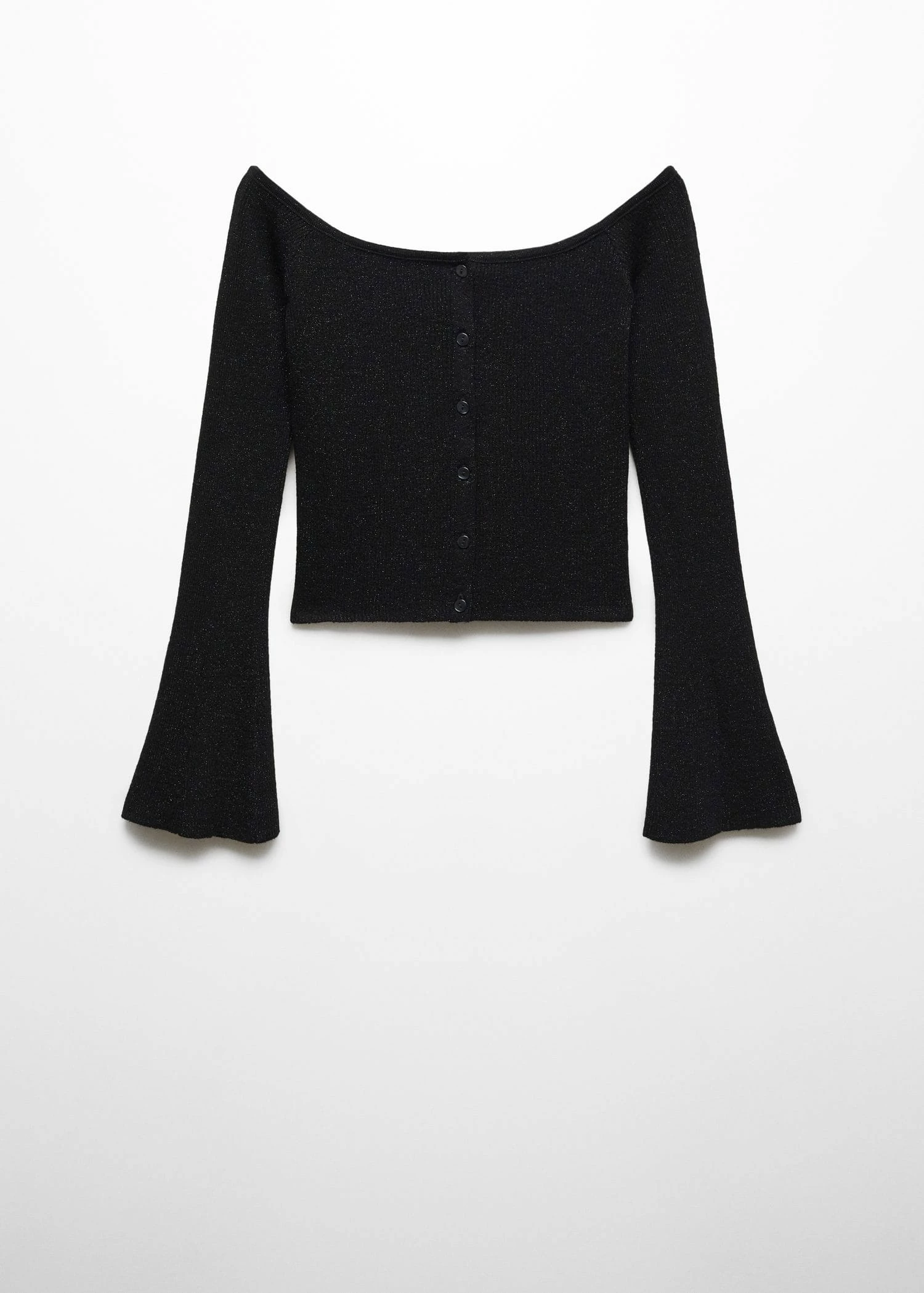 tissu en maille fine, tissu lurex, design epaules denudees, coupe courte, coupe cintree, manches longues cloche, fermeture a boutons sur le devantComposition: 75% acrylique,14% polyester avec revêtement de cuivre,11% polyester
