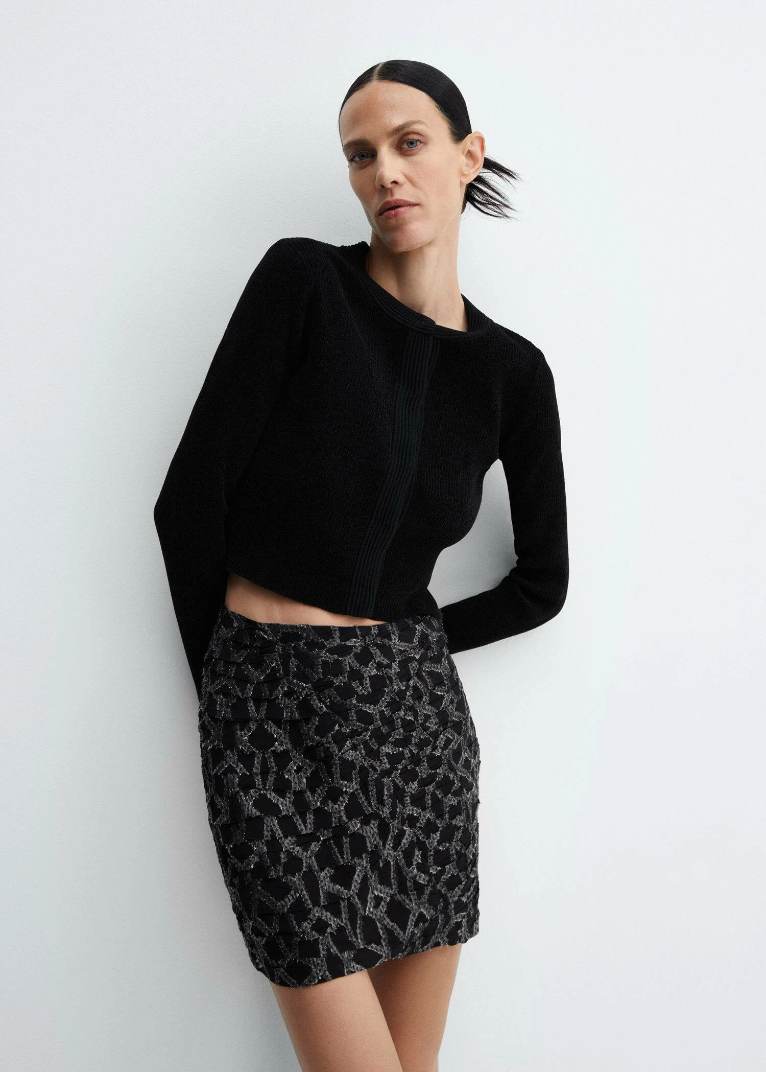 tissu en velours, tissu en maille fine, coupe courte, coupe droite, col rond, manches longues, fermeture a boutons dissimulee sur le devantComposition: 74% polyester,17% polyamide,7% viscose,2% elasthanne