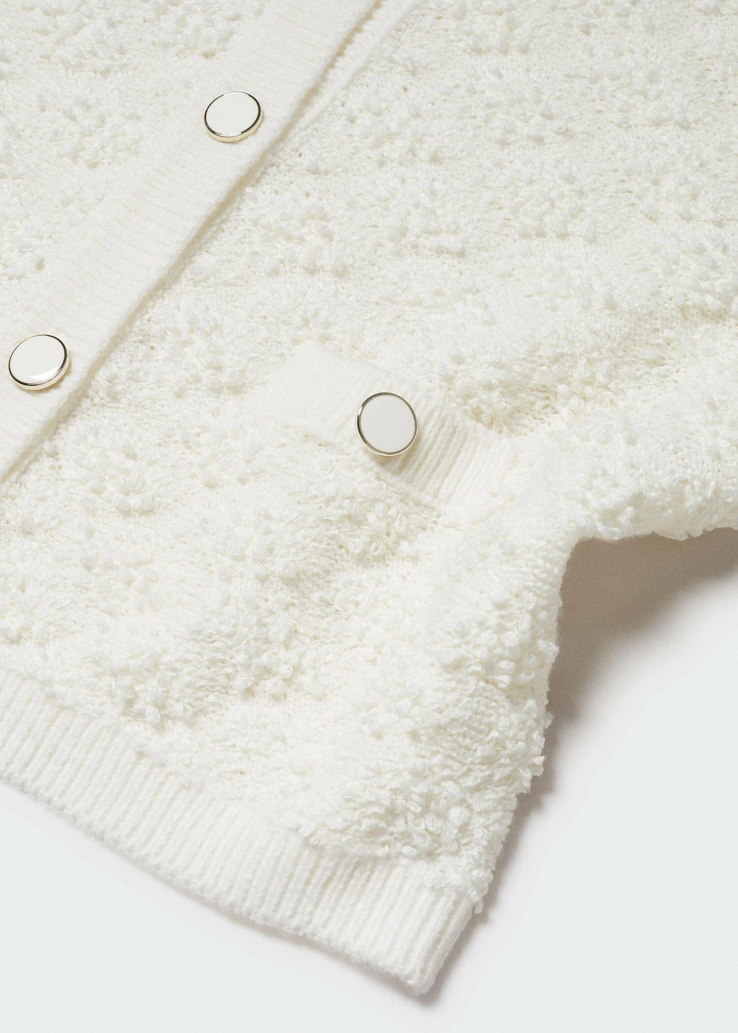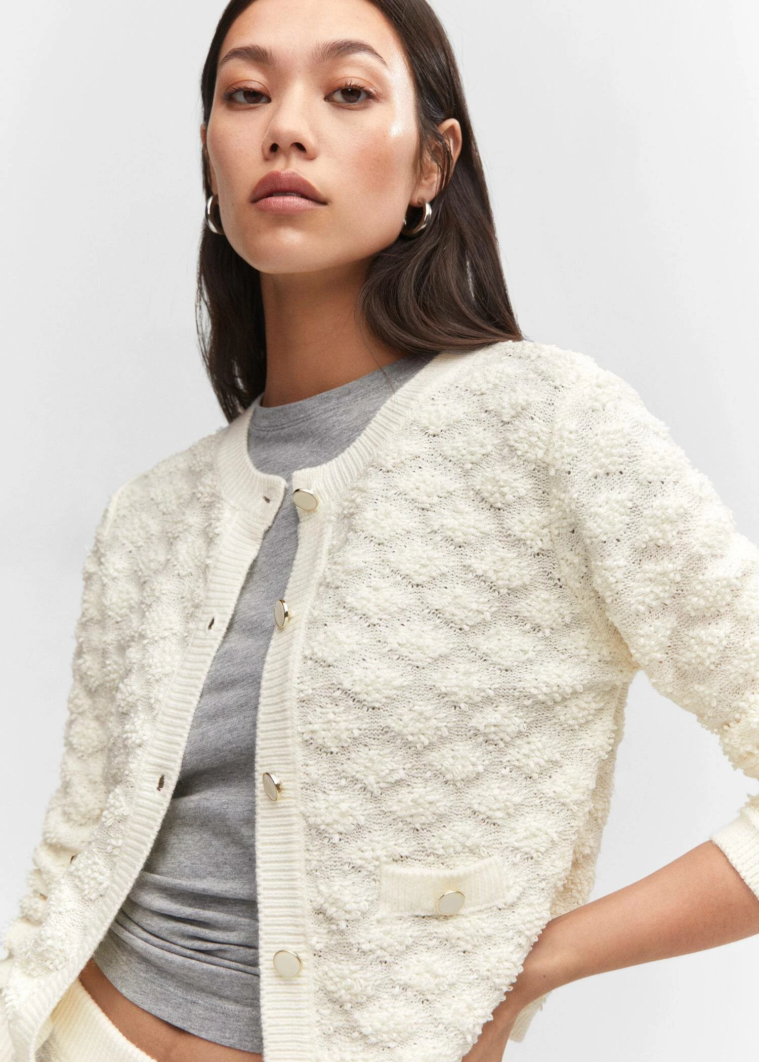 tissu en maille, tissu texture, coupe droite, coupe courte, manches longues, fermeture boutonnee sur le devant, boutons effet bijoux, total lookComposition: 67% acrylique,33% polyamide