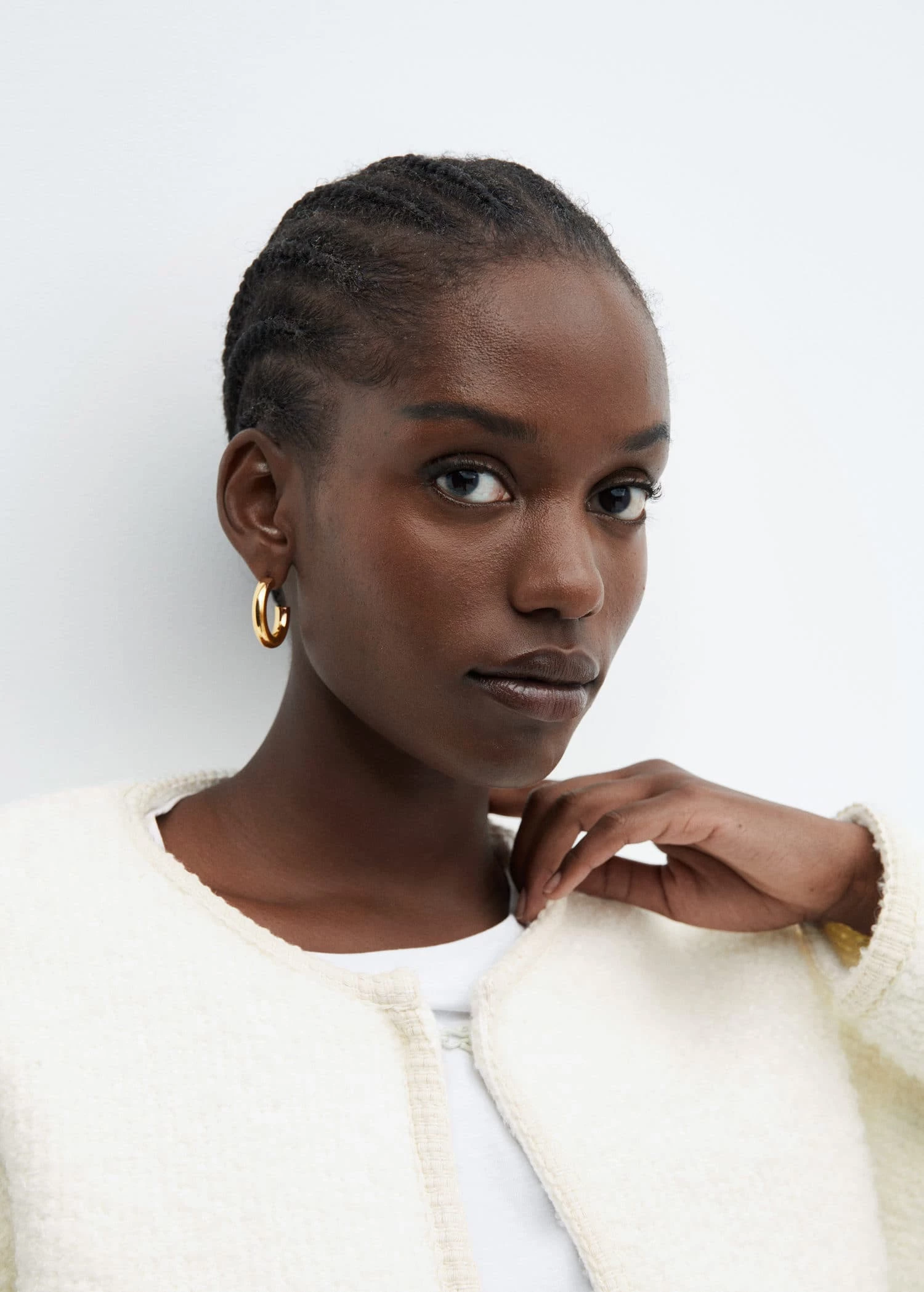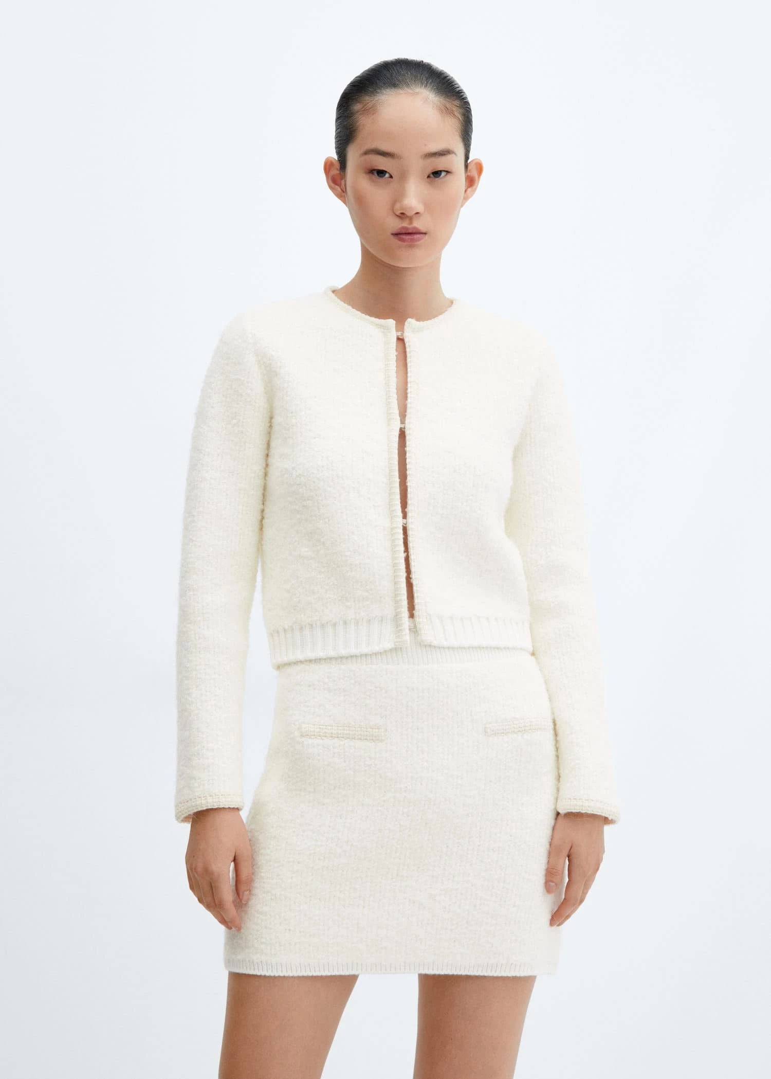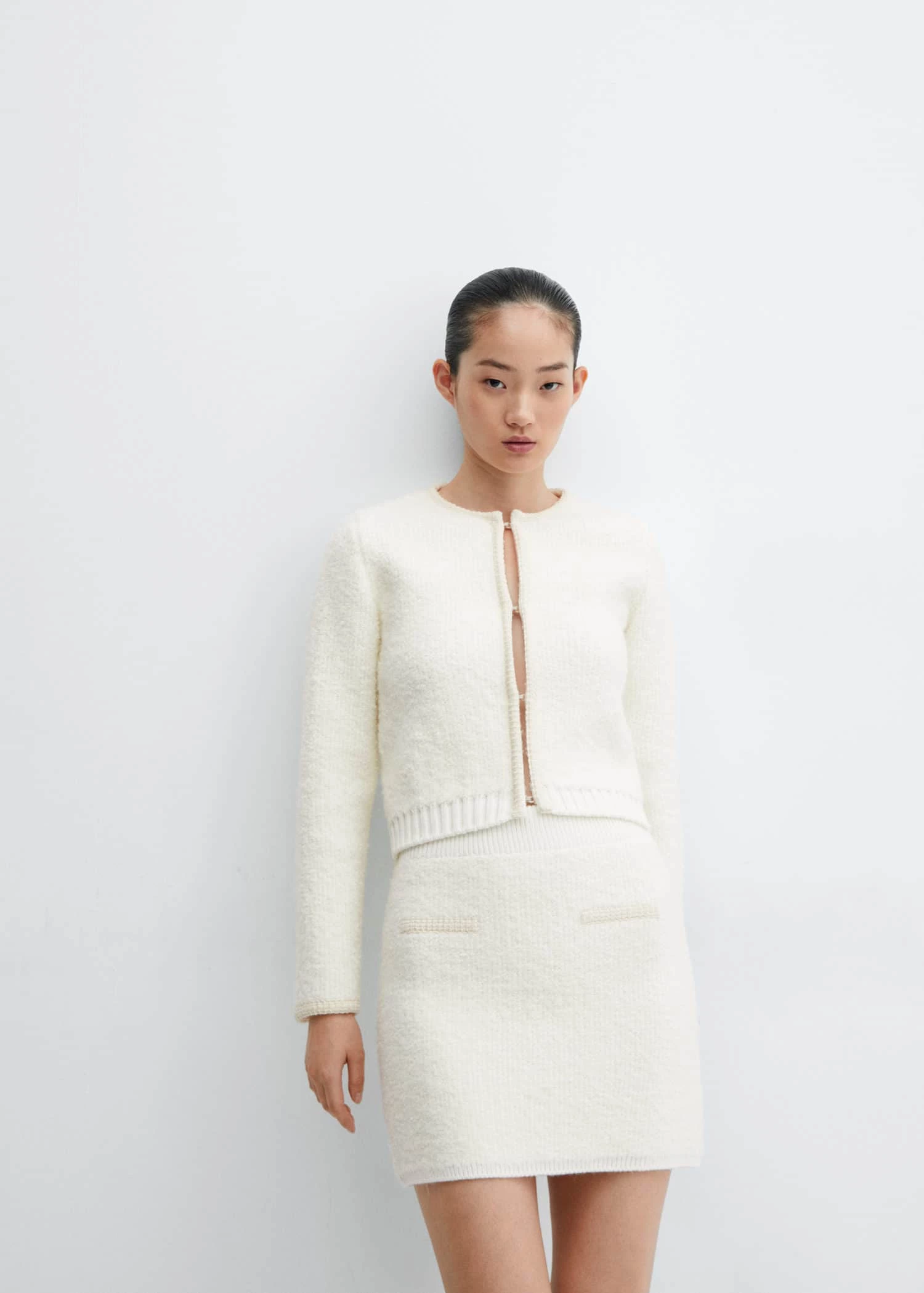 tissu en alpaga melange, tissu tweed, coupe droite, col rond, manches longues, fermeture crochet sur le devant, liseres contrastants, disponible plus, total lookComposition: 78% acrylique,15% polyester,4% polyamide,3% alpaca