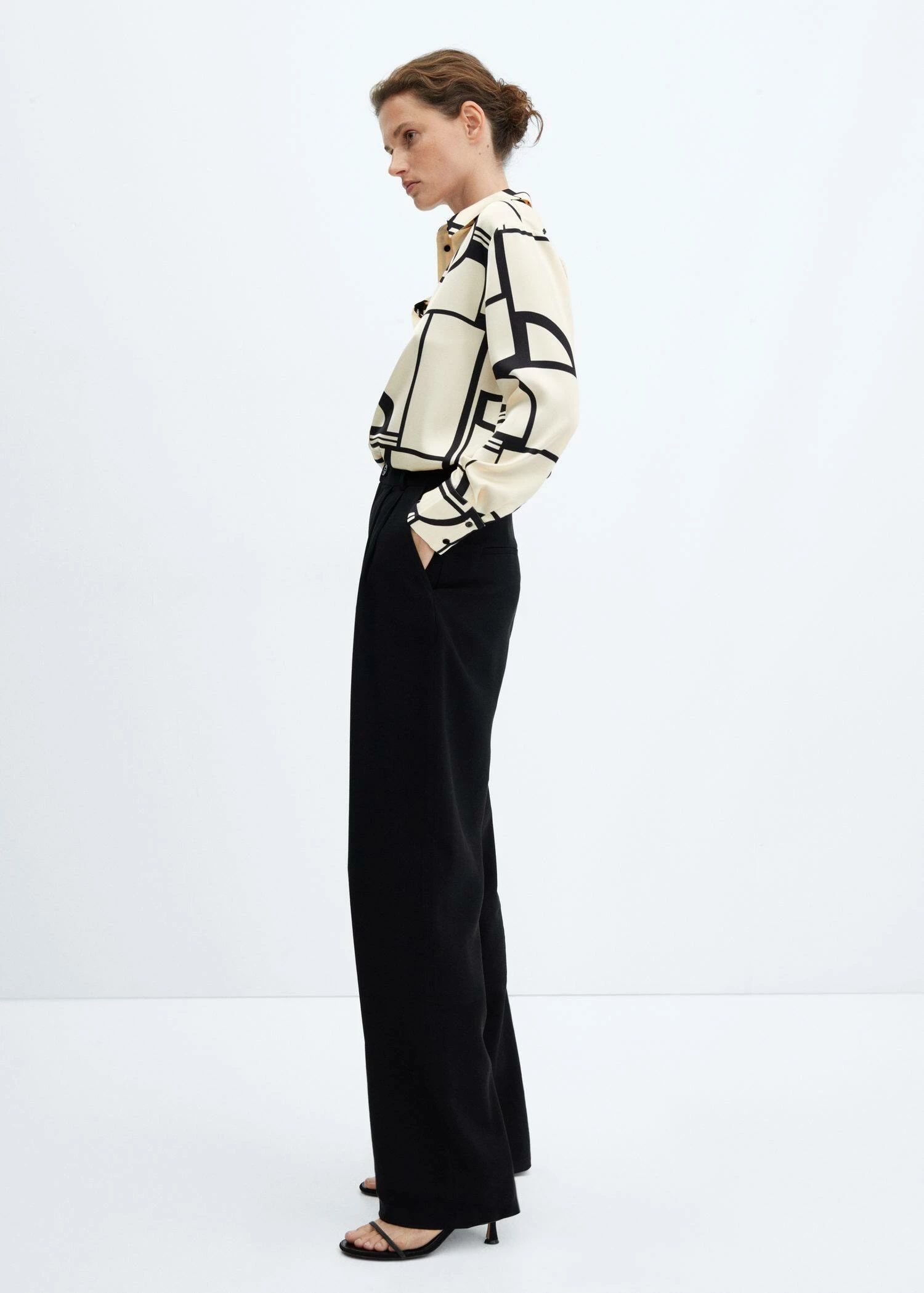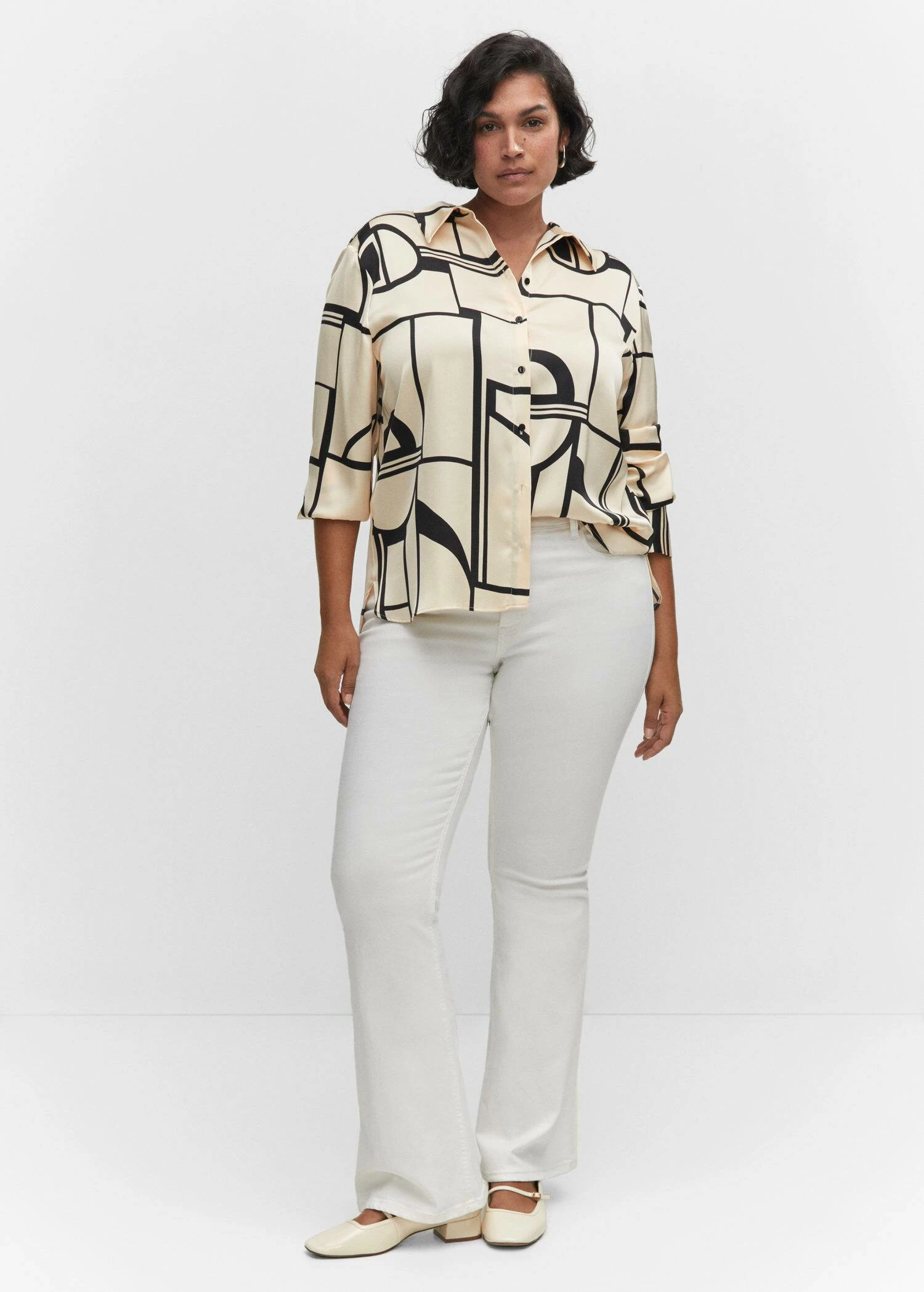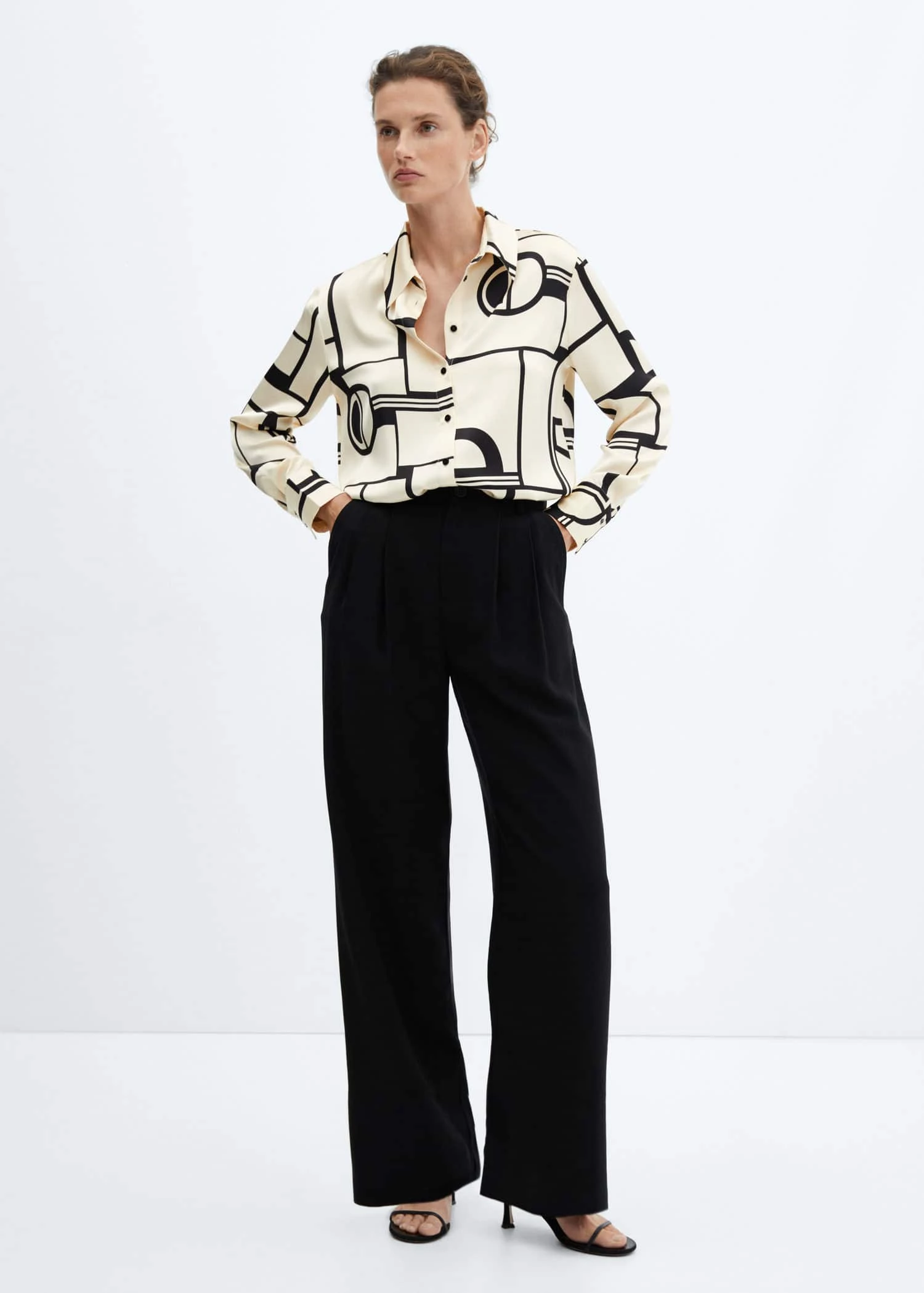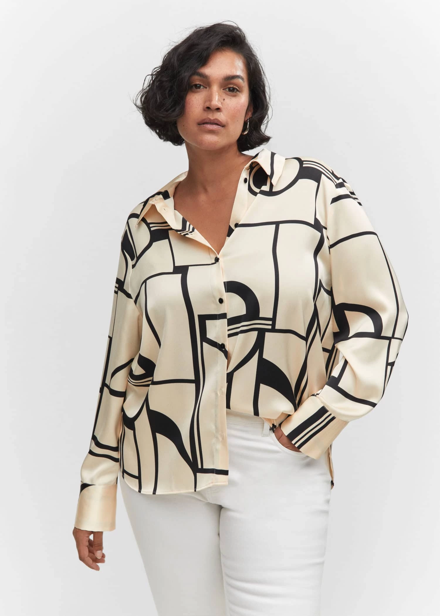 tissu satine, tissu fluide, droit, col chemise, imprime geometrique, manches longues boutonnees, fermeture boutonnee sur le devant, disponible plusComposition: 100% polyester