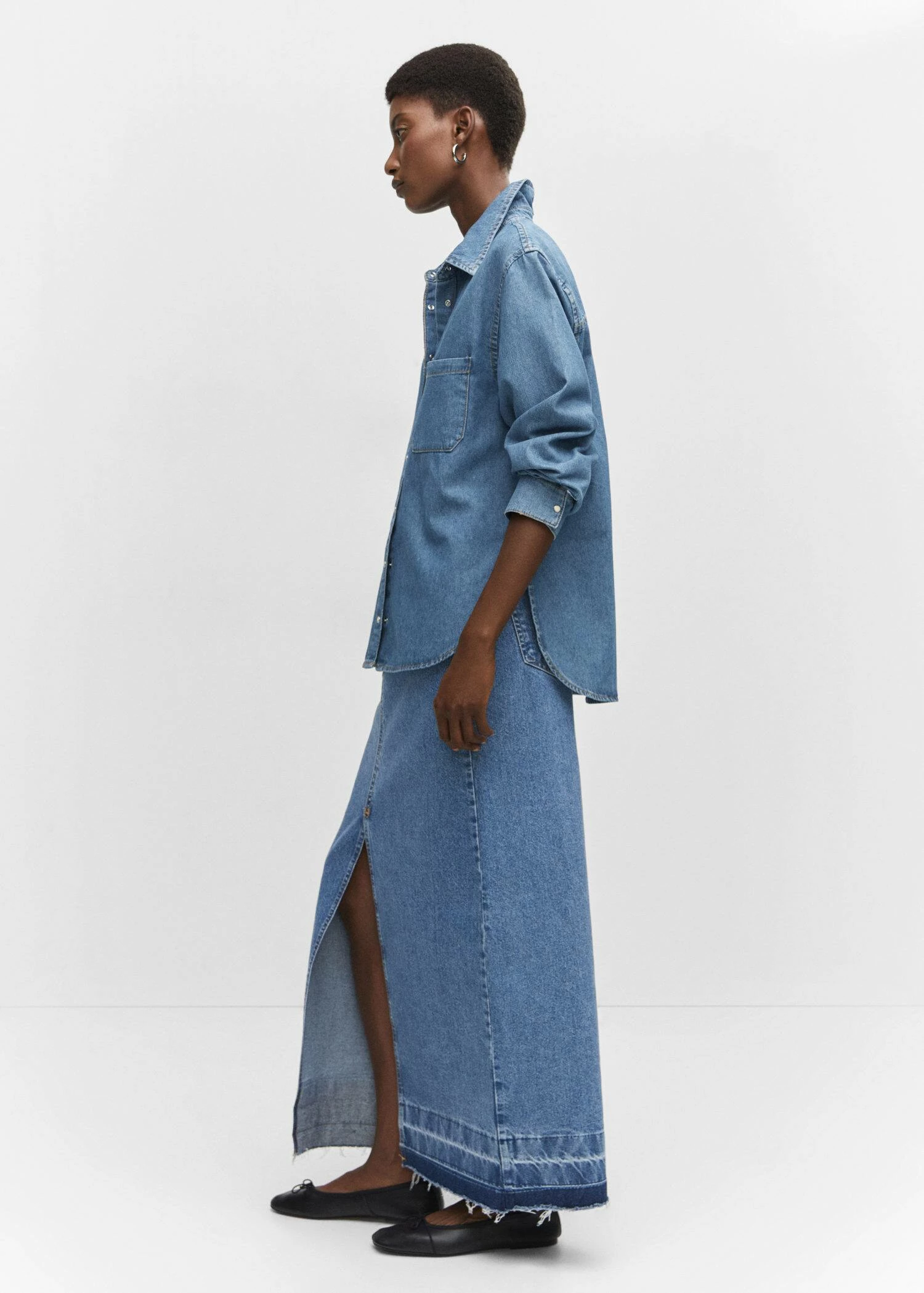 tissu en coton de style jean, droit, col chemise, manches longues avec poignets boutonnes, poche plaquee sur la poitrine, fermeture boutonnee sur le devant, bas arrondi, total lookComposition: 100% coton
