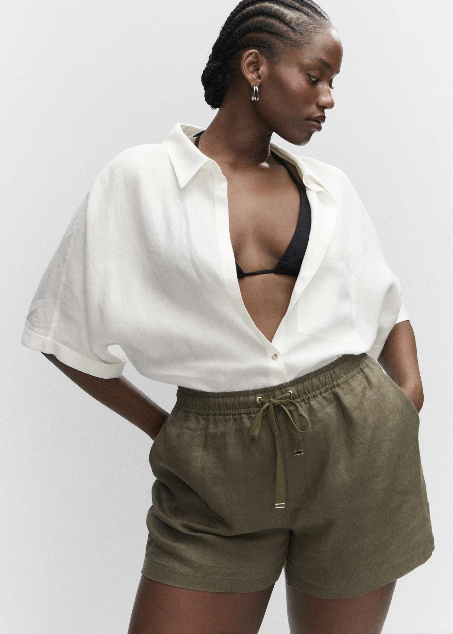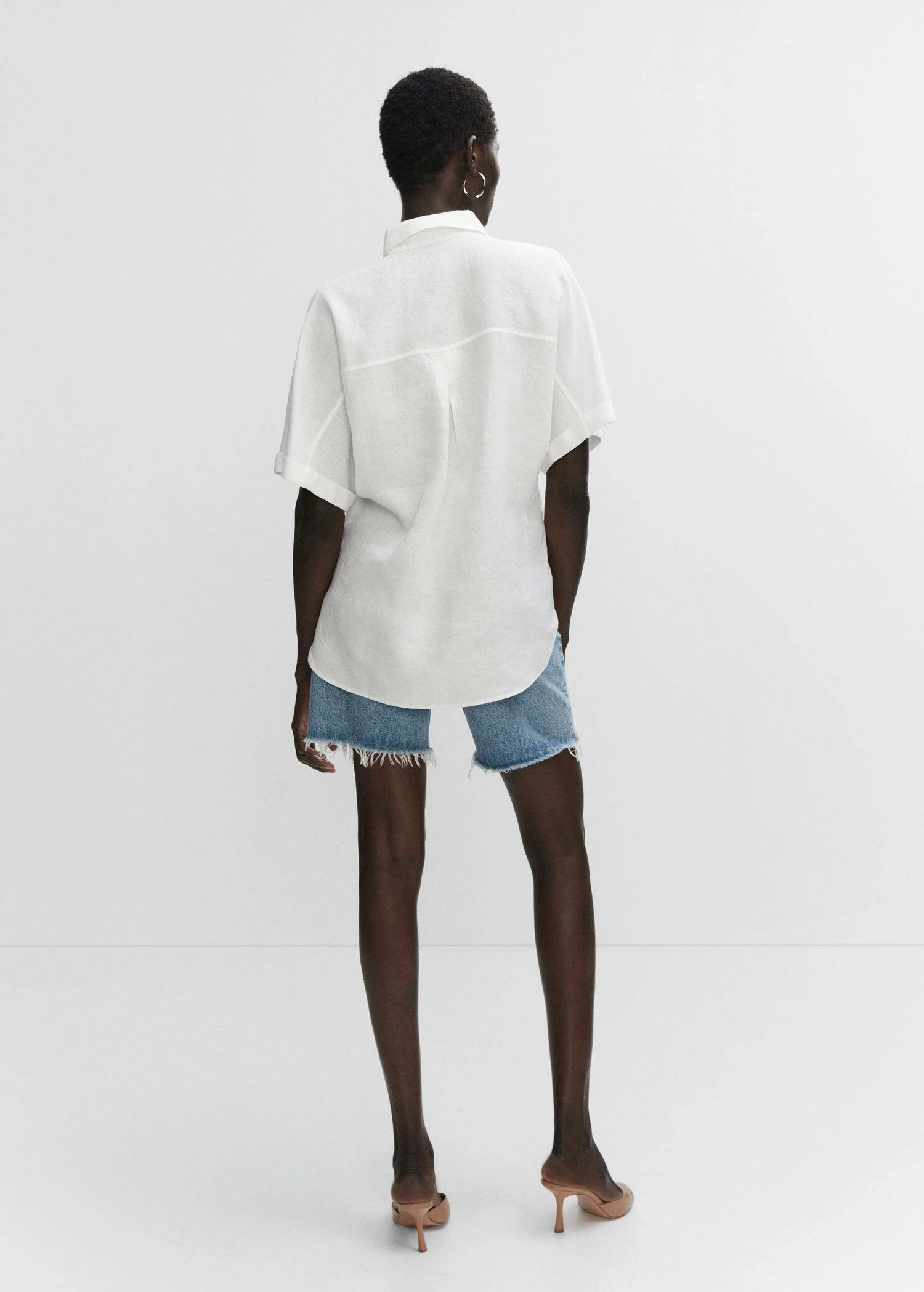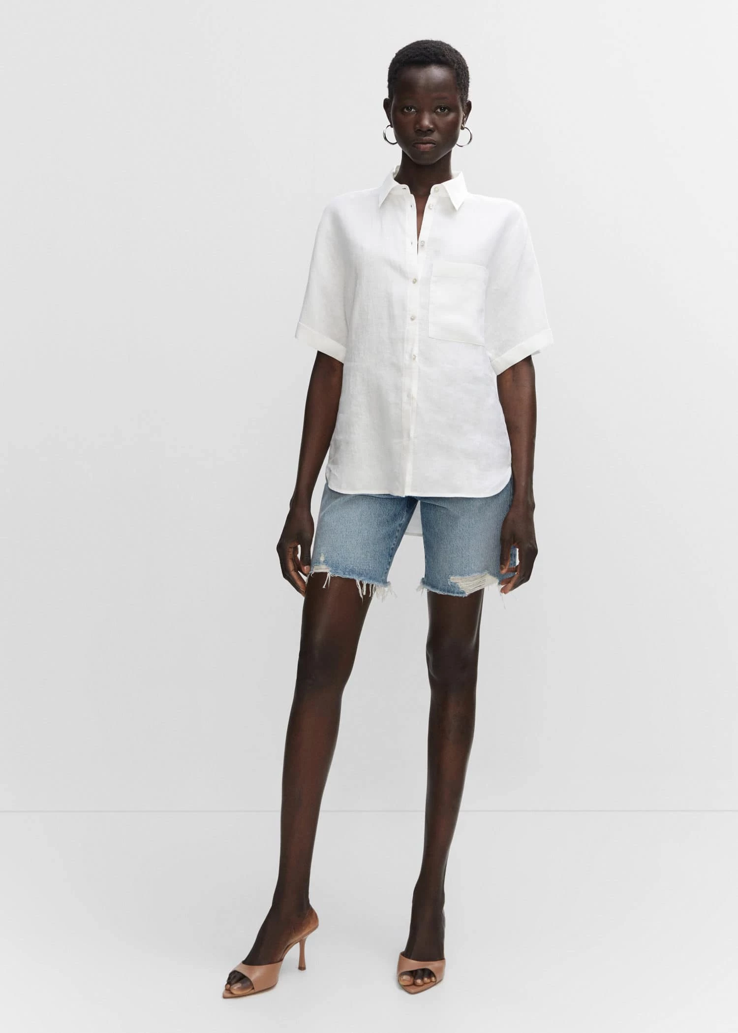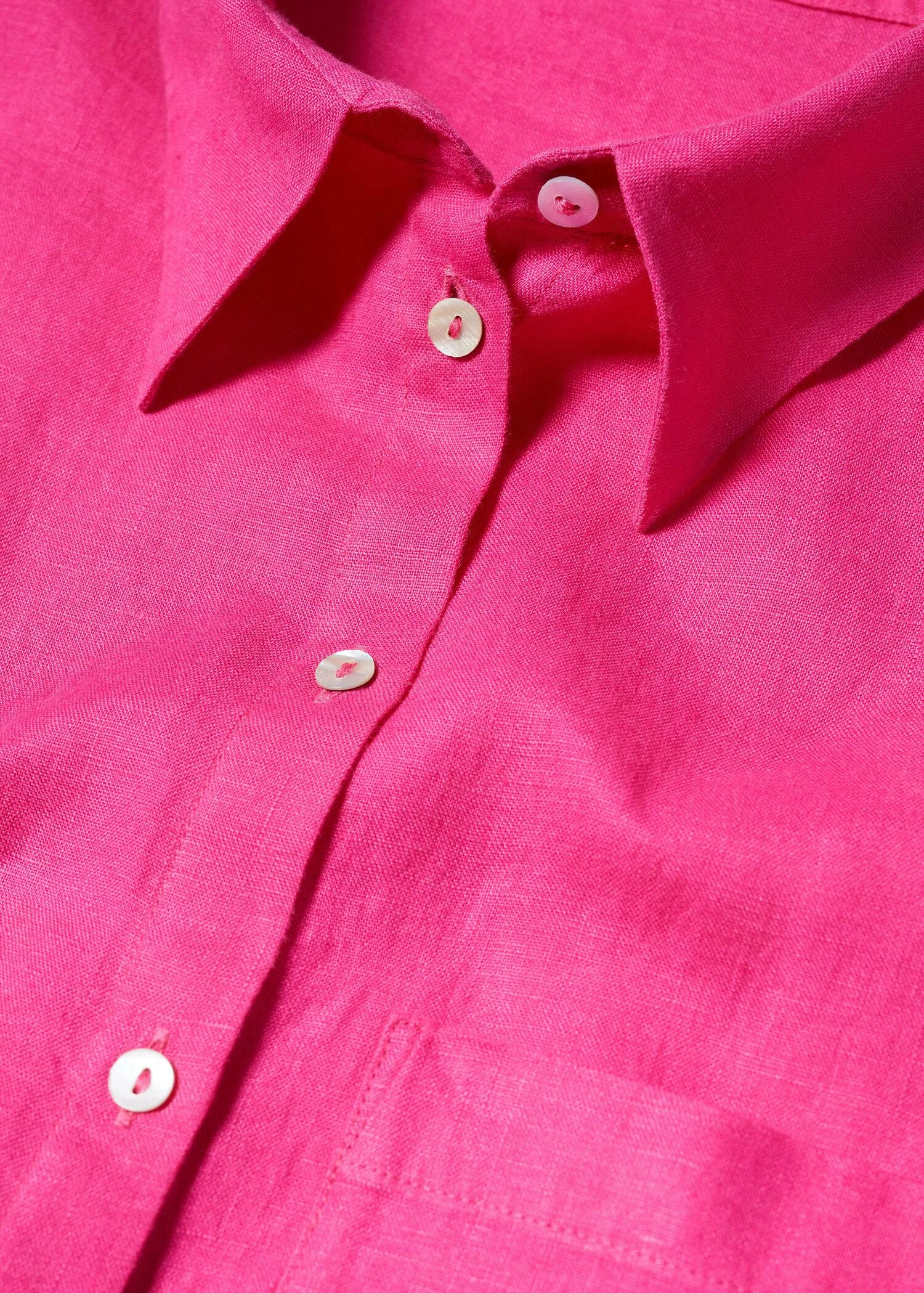 tissu 100 % lin, style oversize, col chemise, manches courtes retournees, poche plaquee, fermeture boutonnee sur le devant, bas arrondi, disponible plusComposition: 100% lin