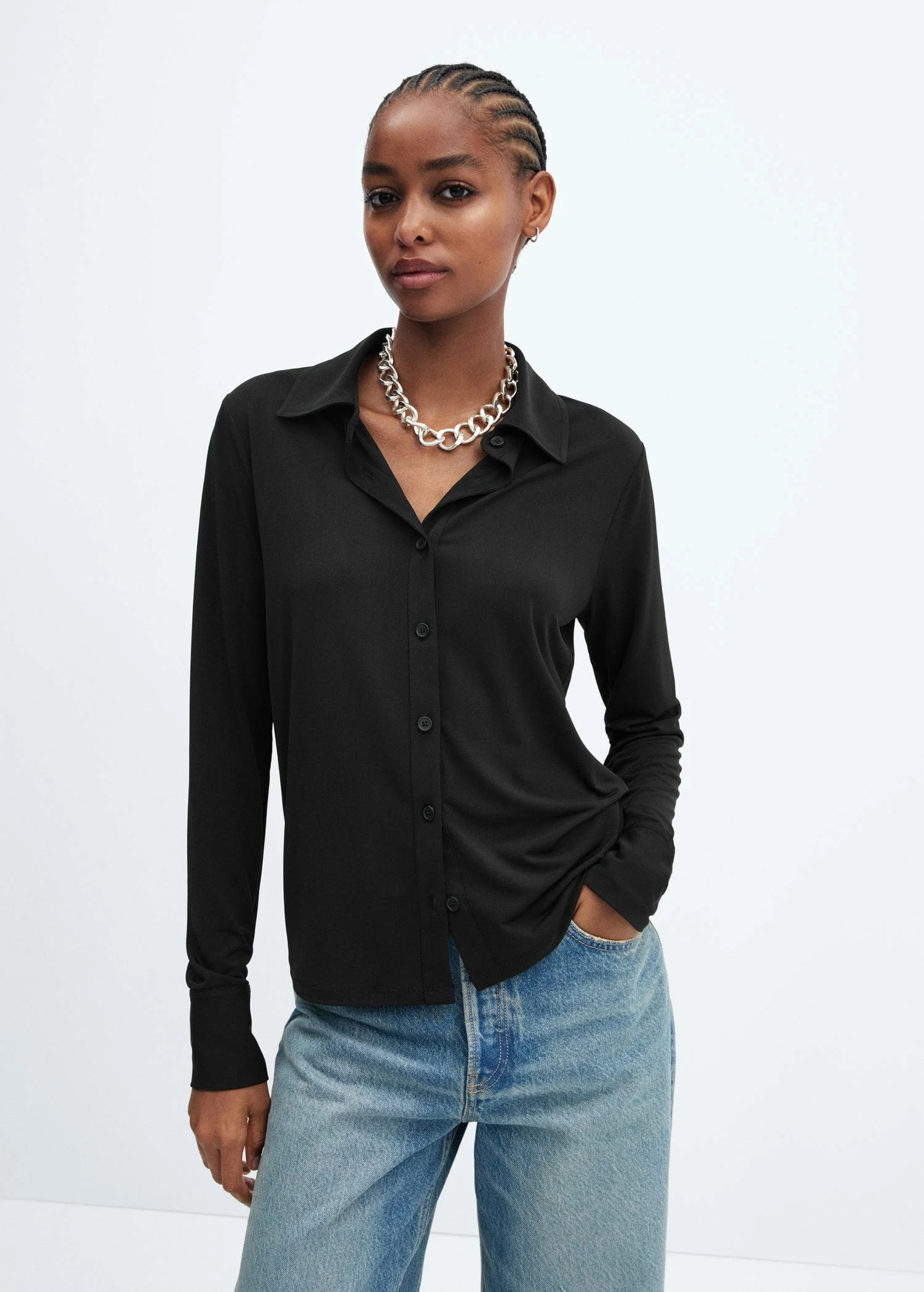 tissu en maille fine, tissu fluide, droit, col chemise, manches longues avec poignets boutonnes, fermeture a boutons sur le devantComposition: 94% polyester,6% elasthanne