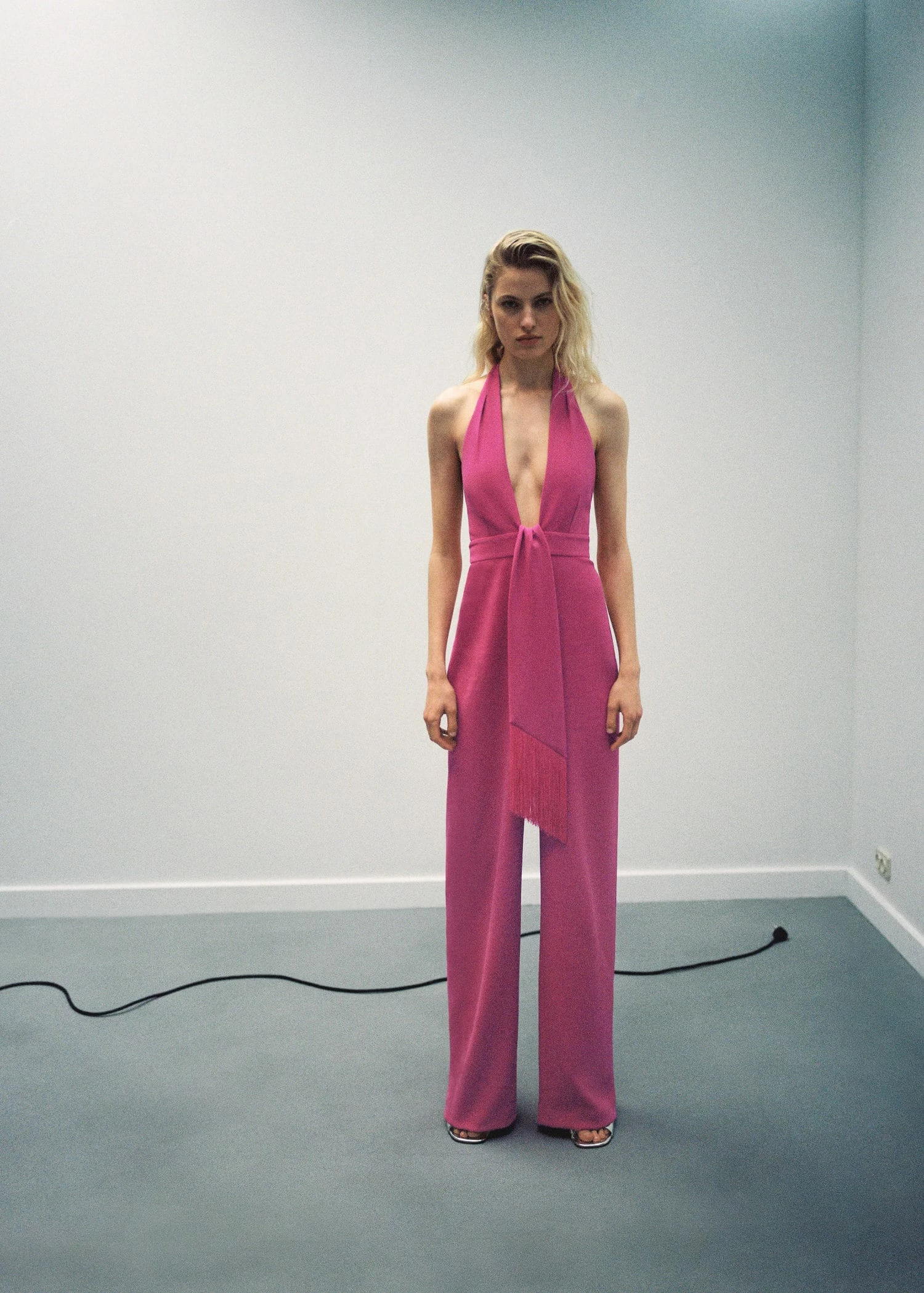 les combinaisons reviennent sur le devant de la scene cette saison. avec ses emmanchures americaines, son nœud a la taille et ses franges, cette combinaison est une option sophistiquee et tendance, parfaite pour les grandes occasions de cette saison, tissu fluide, ajuste, coupe longue, col echancre, bretelles larges, lien a nouer autour du cou, fermeture eclair a l’arriere, nœud a la taille, detail frange, fabrique au maroc, collection fetes et ceremonies, capsule : une collection de vetements en edition limitee, fabriques avec les meilleurs tissus et le plus grand soin en matiere de patrons, afin d’obtenir les meilleures finitions. cette collection exclusive est concue pour les evenements et les occasions les plus chics.Composition: 49% acetate,48% viscose,3% elasthanne. Franges: 100% viscose