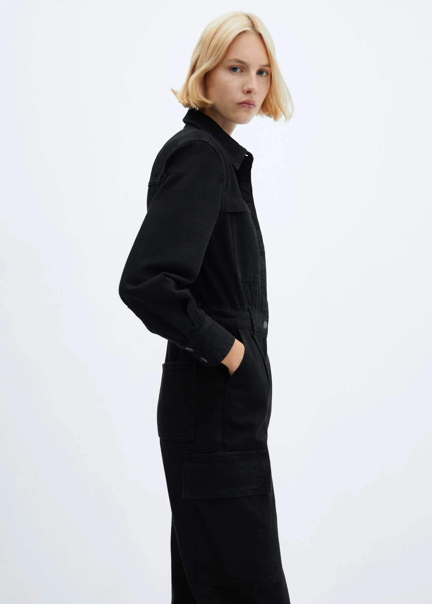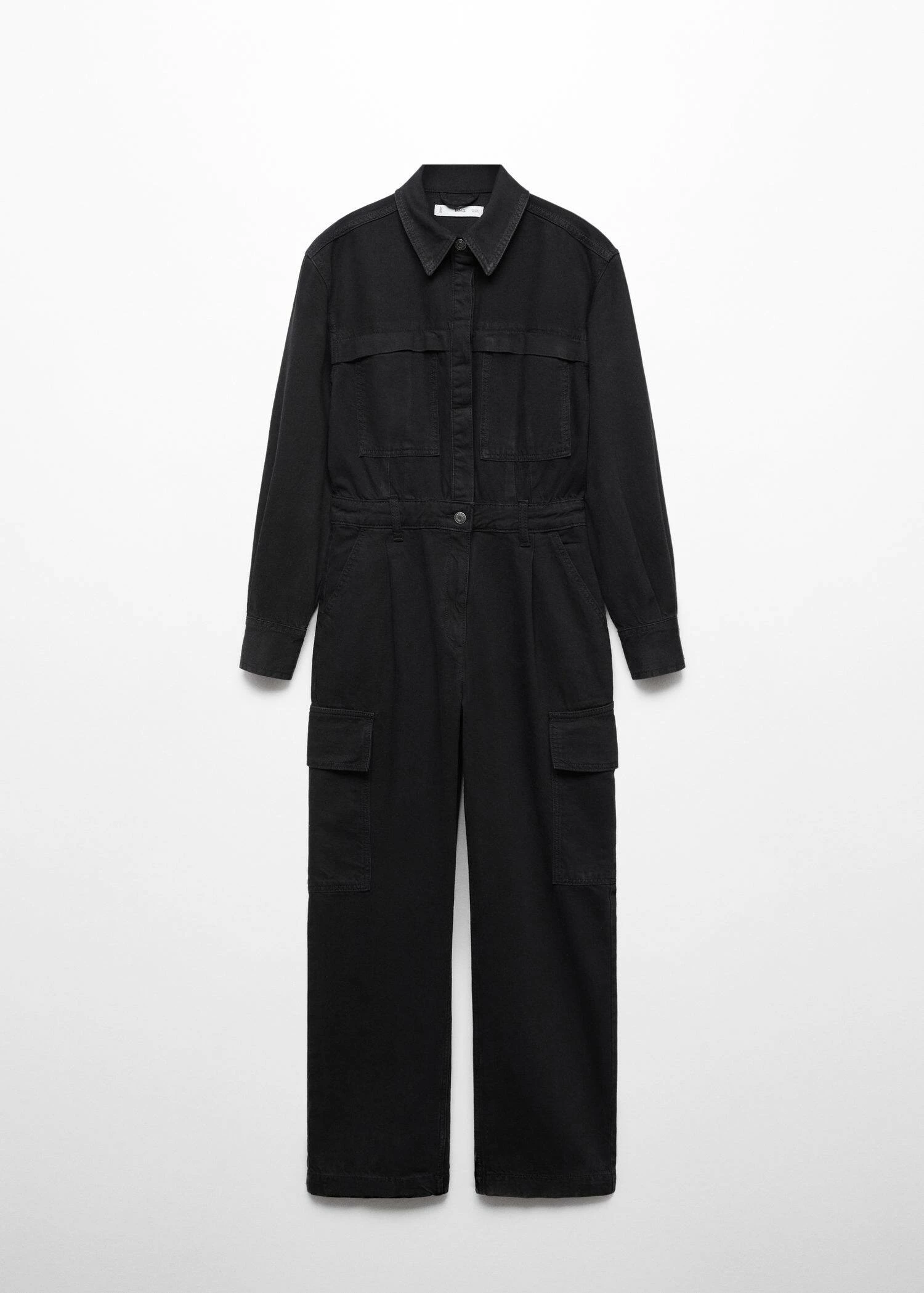tissu en coton de style jean, droit, coupe longue, col chemise, manches longues boutonnees, poche plaquee sur le devant, poches laterales, deux poches cargo, passants pour la ceinture, fermeture boutonnee sur le devant, fermeture eclairComposition: 100% coton