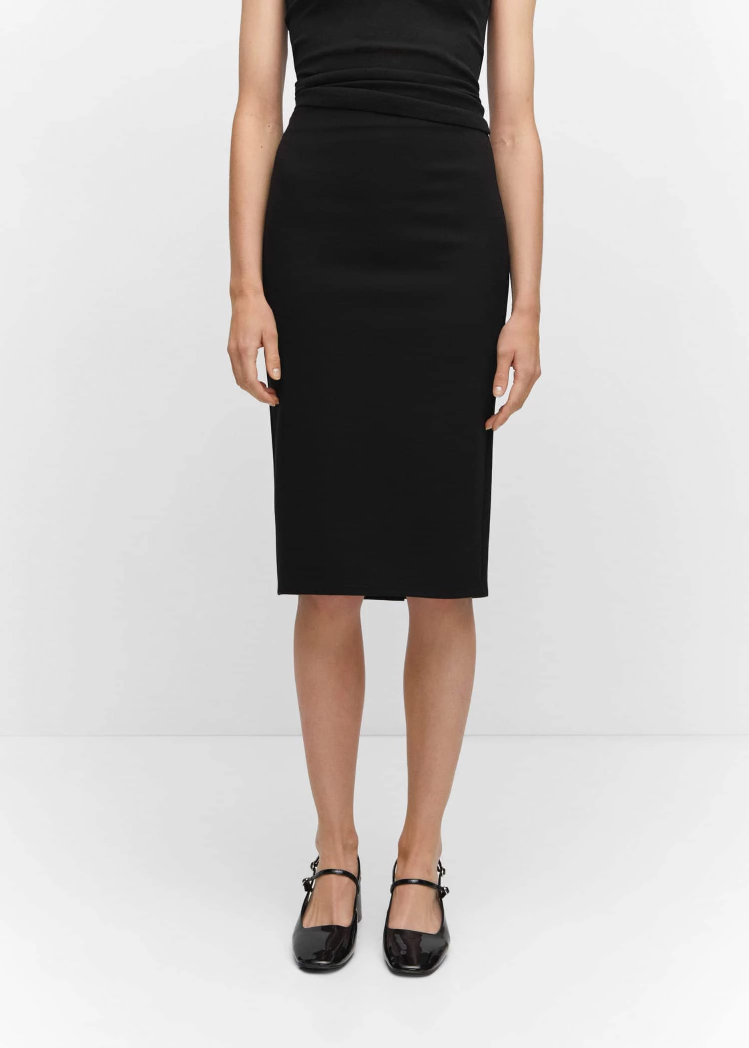 tissu fluide, crayon, coupe midi, taille haute, sans fermeture, detail d’ouverture au dos, disponible plusComposition: 67% viscose,29% polyamide,4% elasthanne