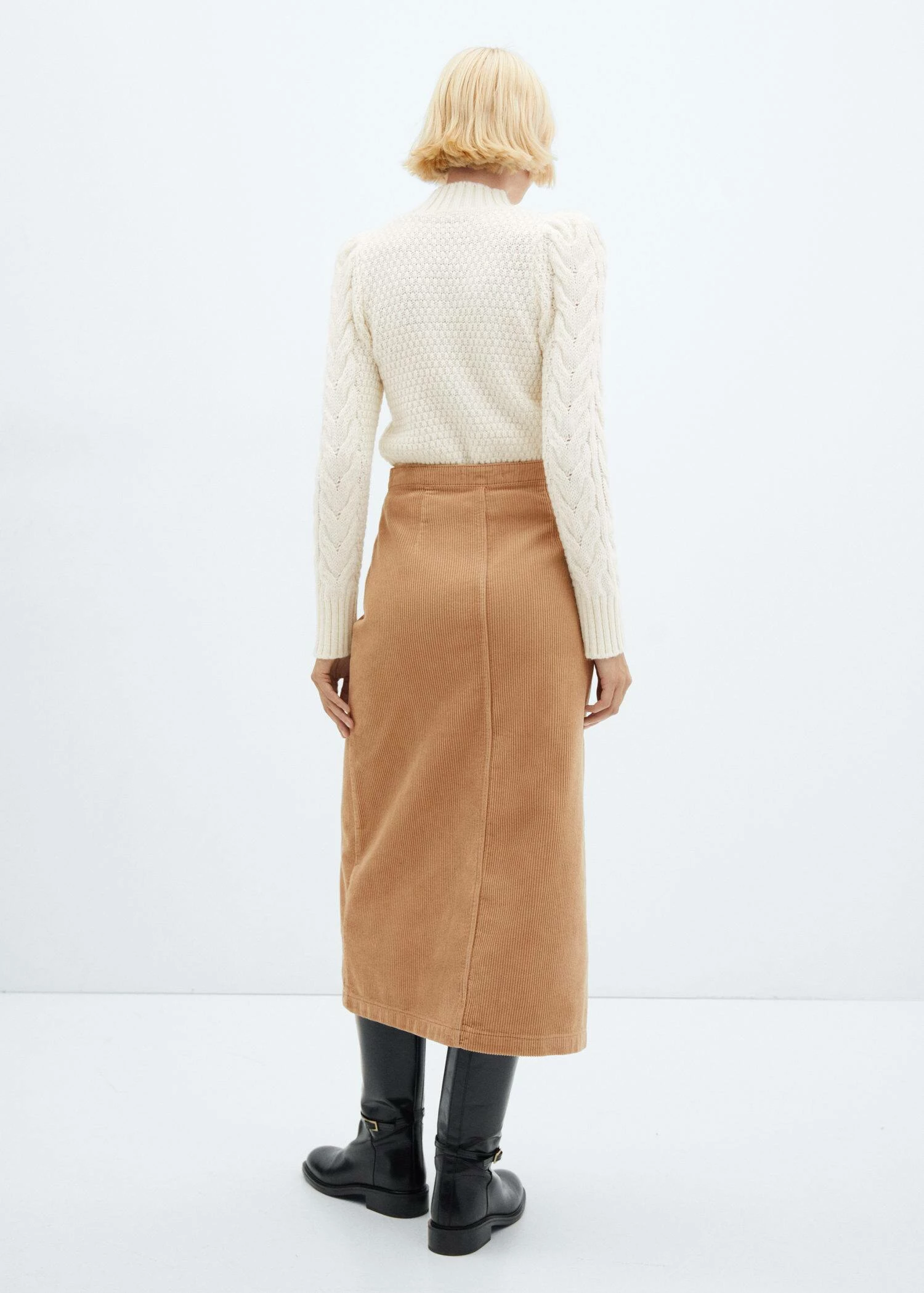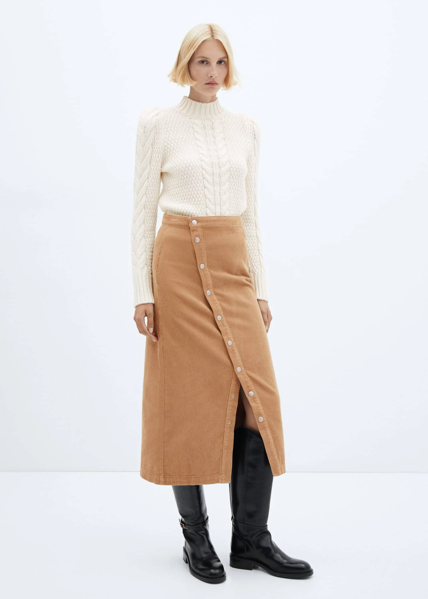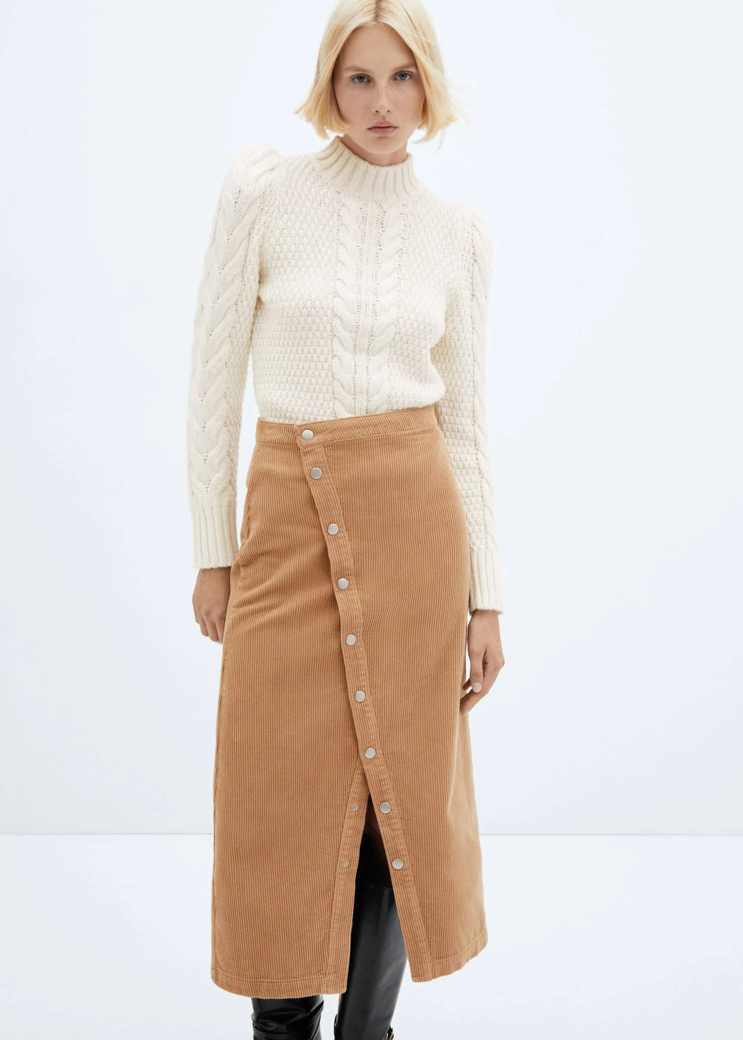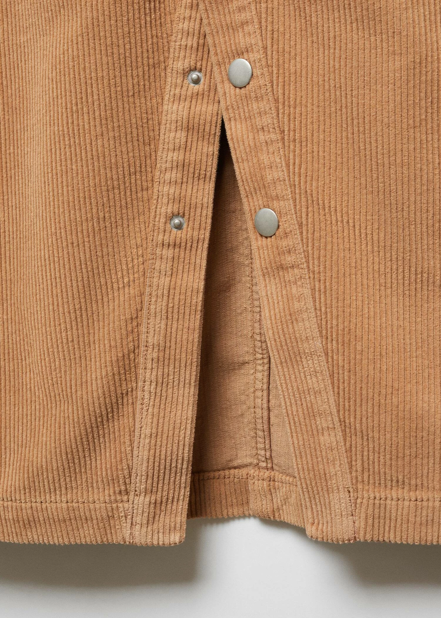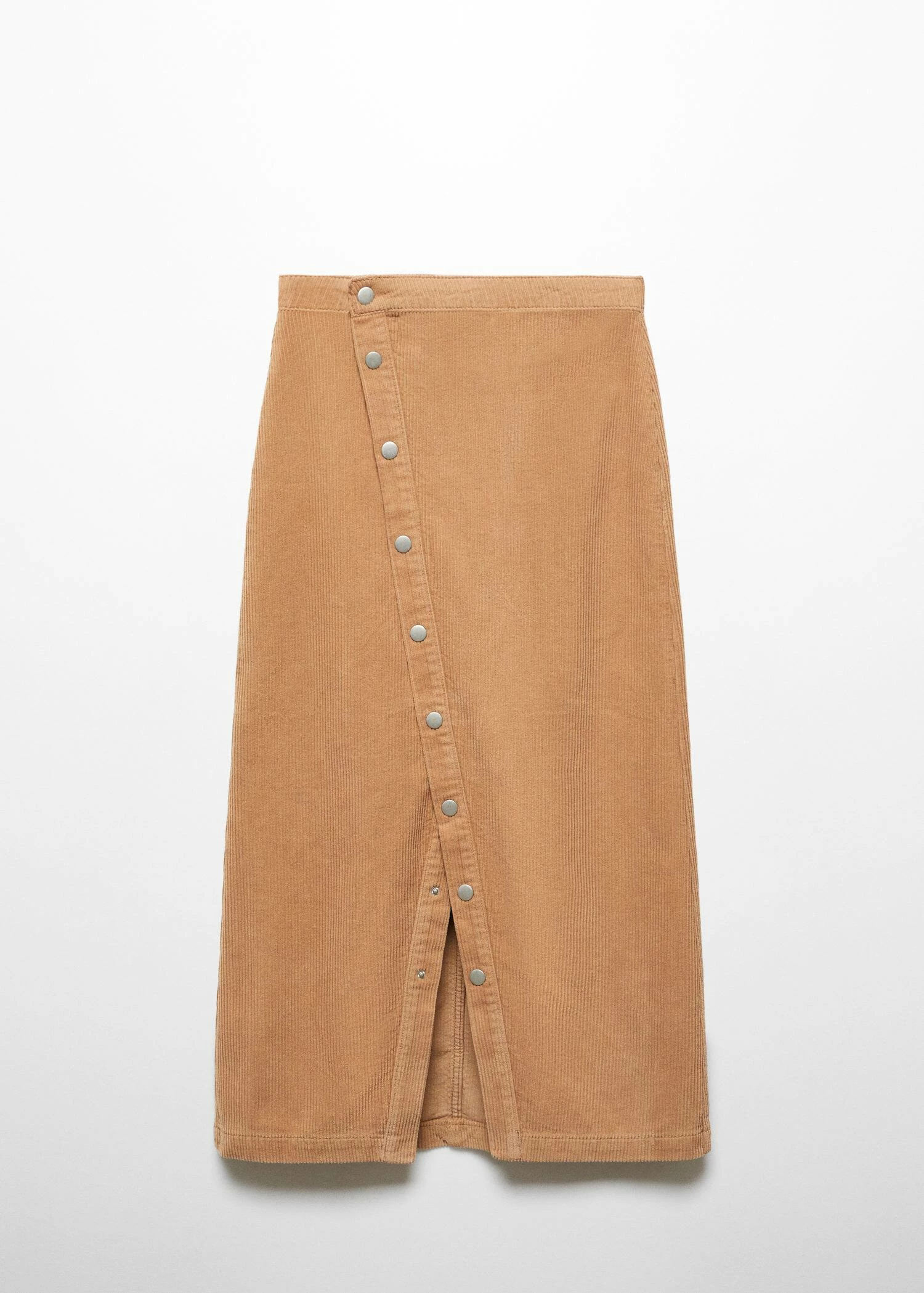 100 % coton, tissu en velours cotele, coupe midi, coupe asymetrique, taille haute, fermeture a l’avant a boutons-pression, ouverture en bas a l’avantComposition: 100% coton