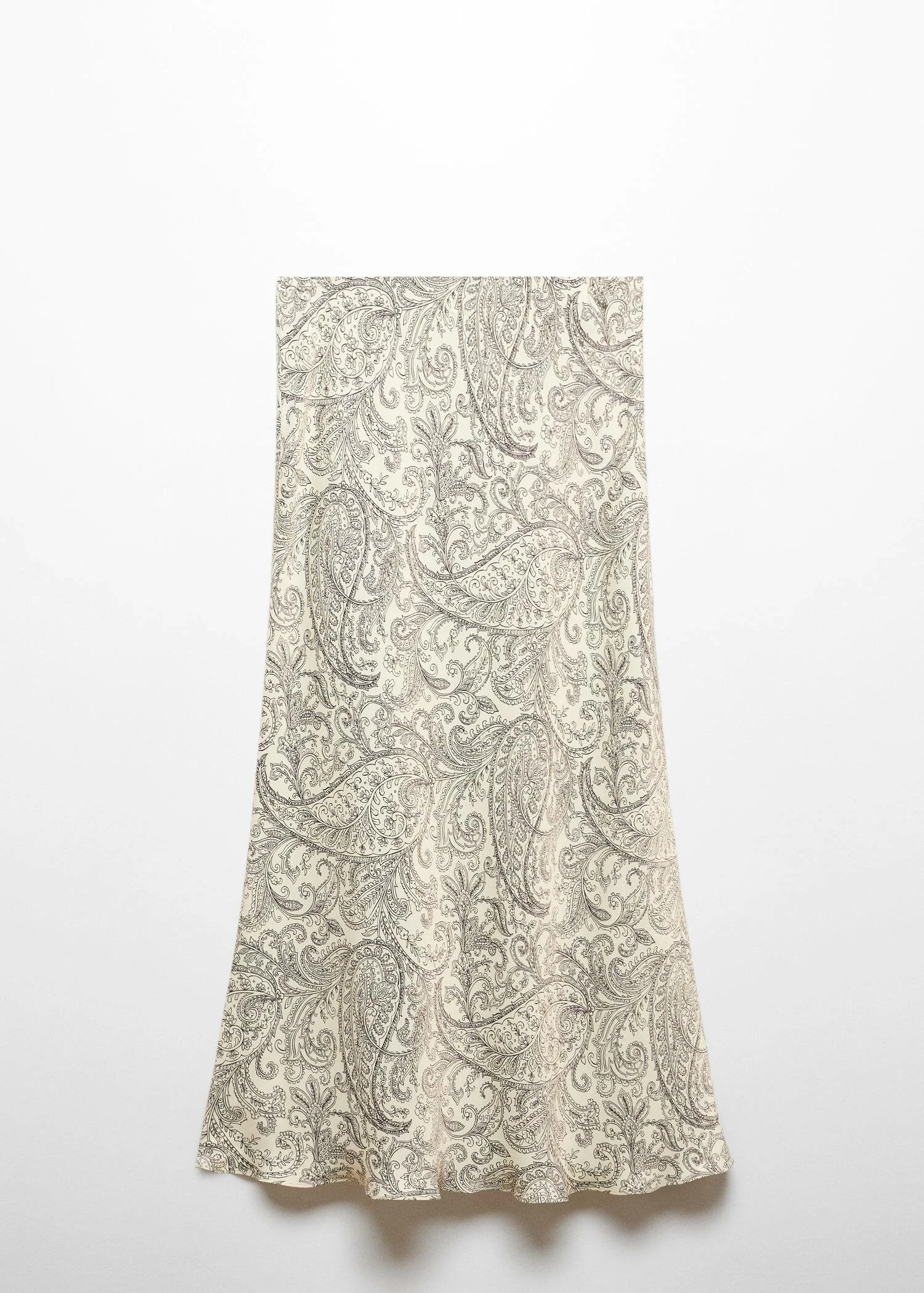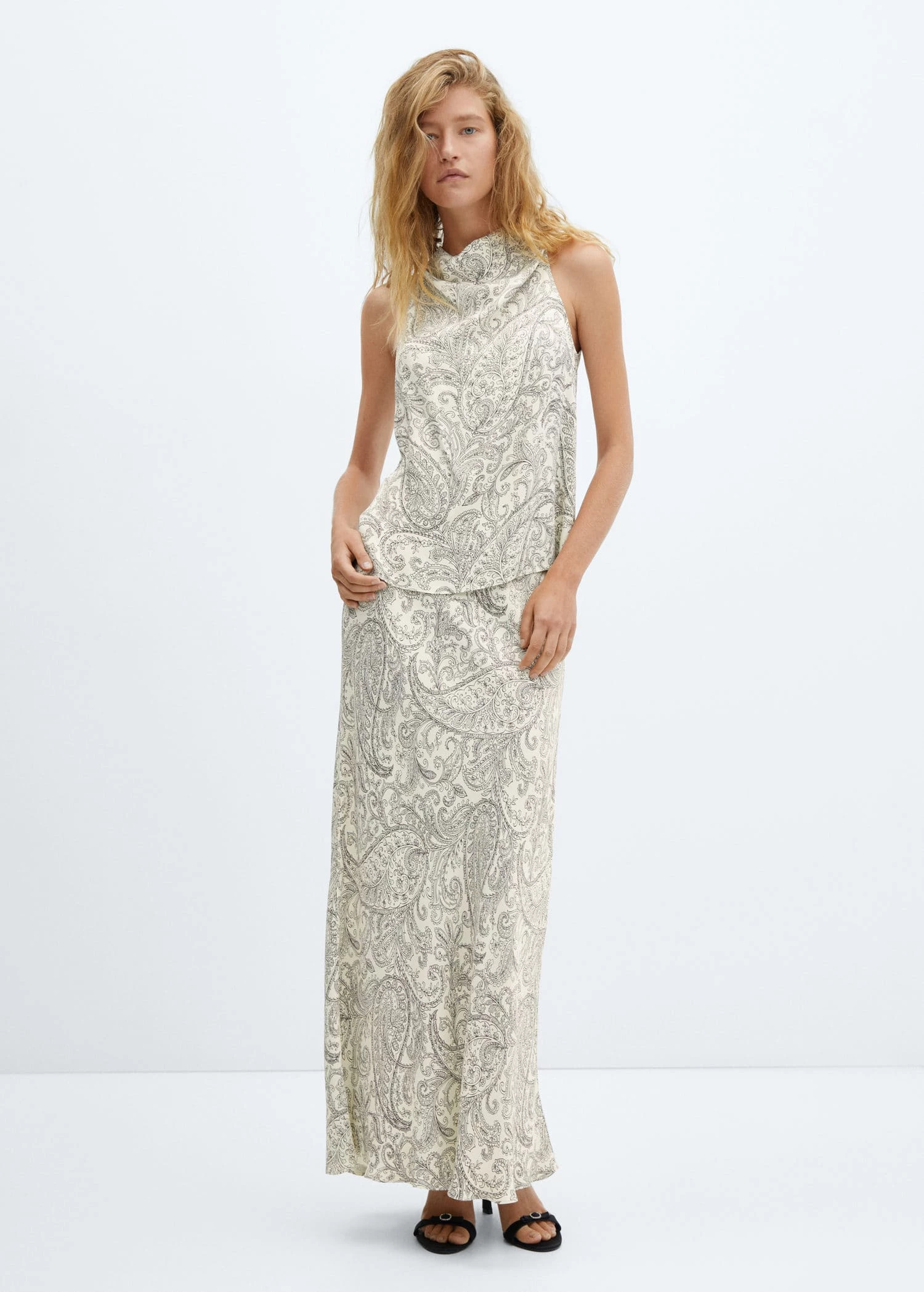 tissu fluide, coupe longue, evase, effet satine, imprime paisley, taille haute, taille elastiquee, sans fermeture, total lookComposition: 100% viscose