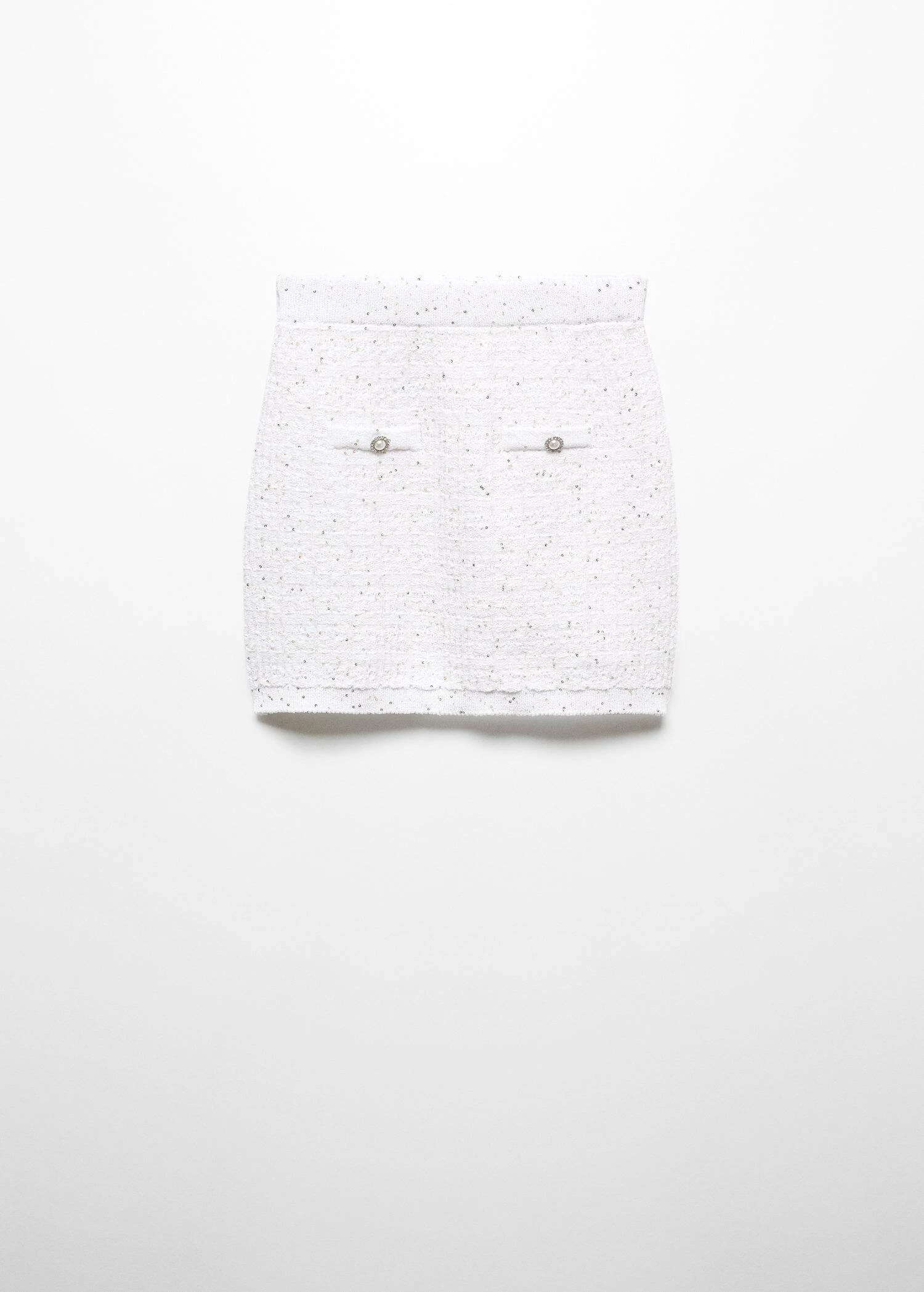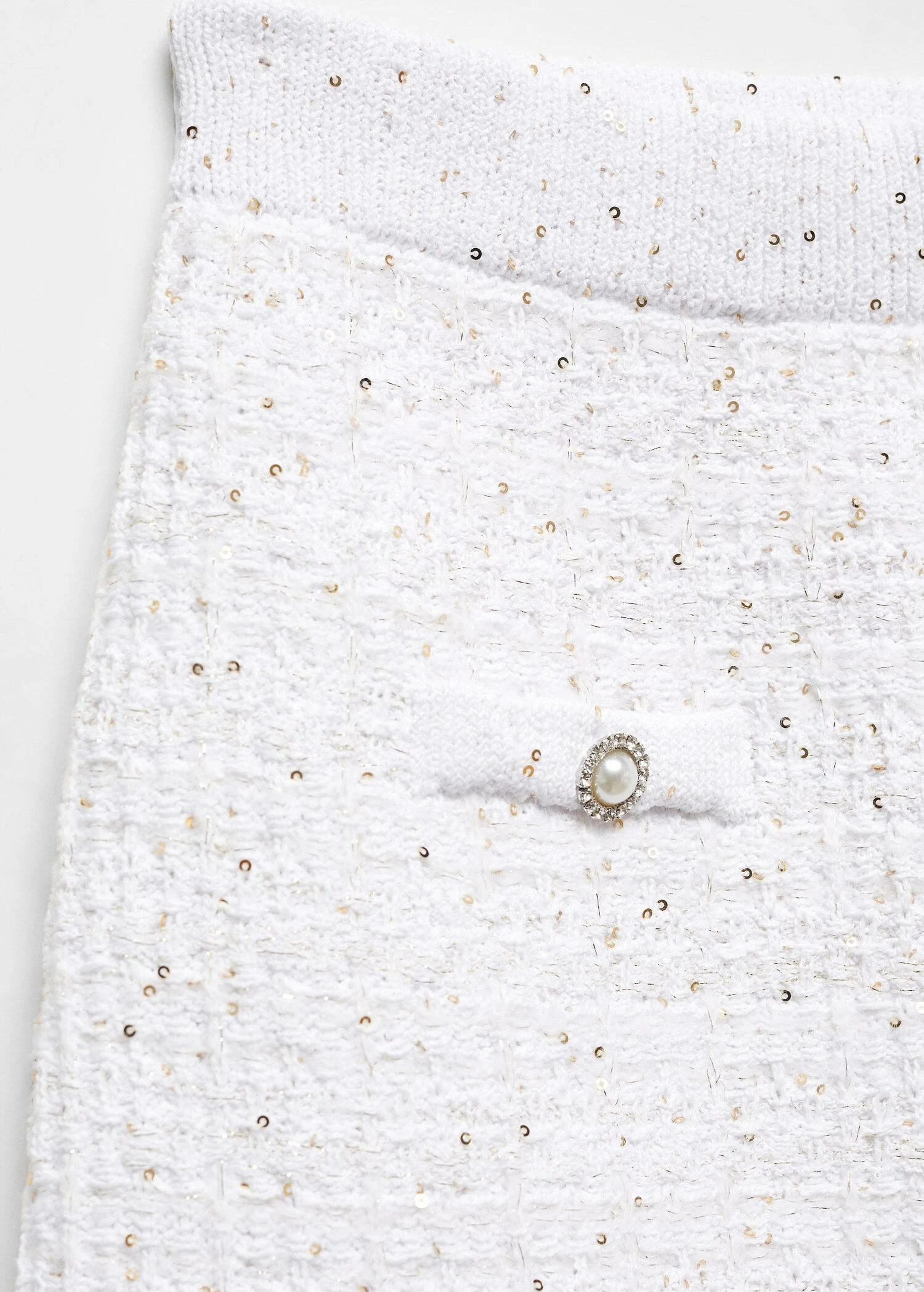 tissu en coton organique recycle melange, maille moyenne, coupe courte, taille elastique, deux poches passepoilees a l’avant, sans fermeture, boutons effet bijoux, detail en sequins, total look.Composition: 49% polyester,43% coton,7% acrylique,1% polyester avec revêtement de cuivre