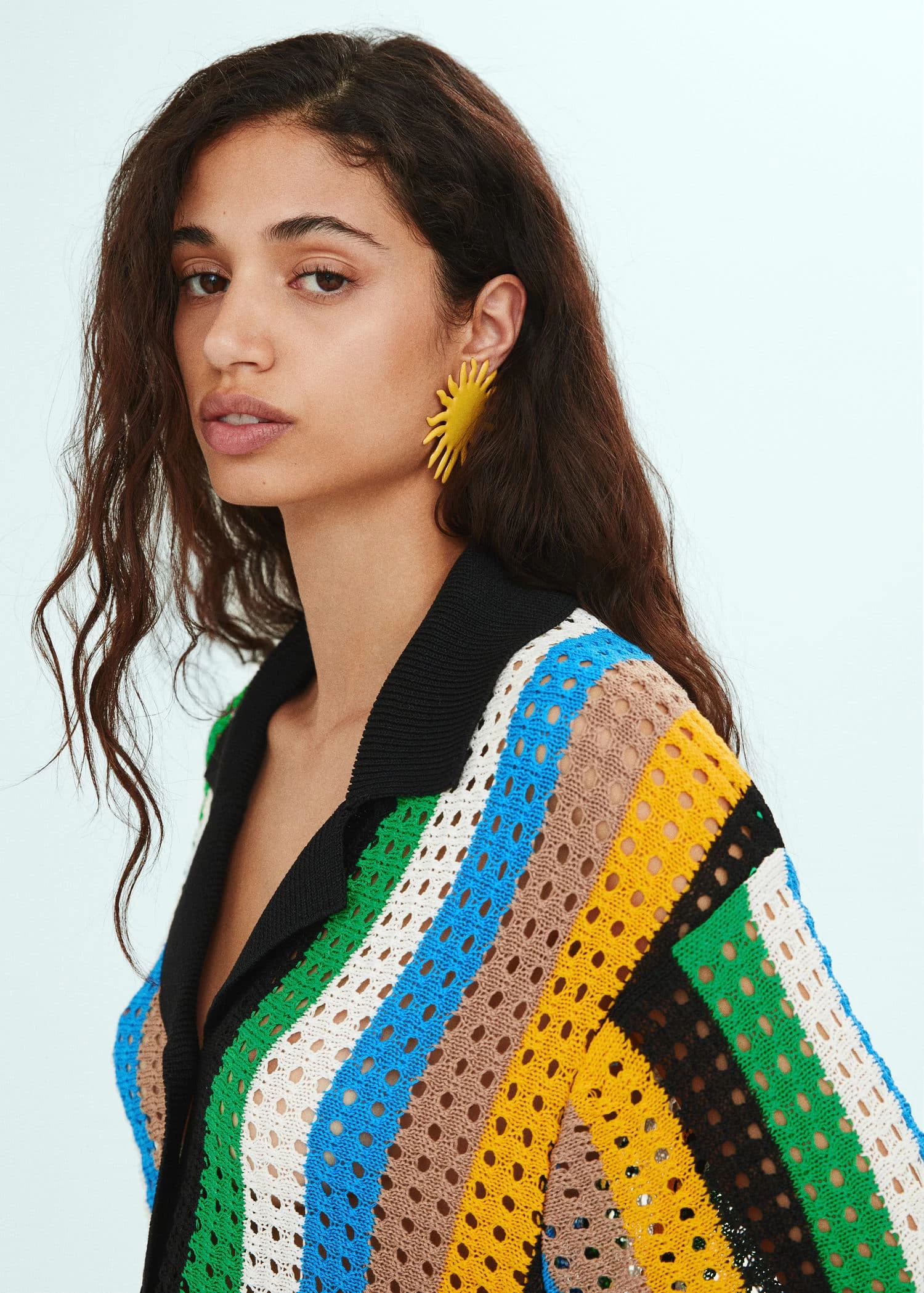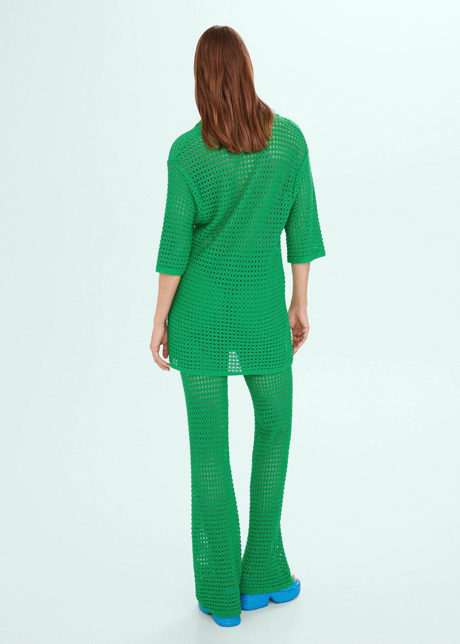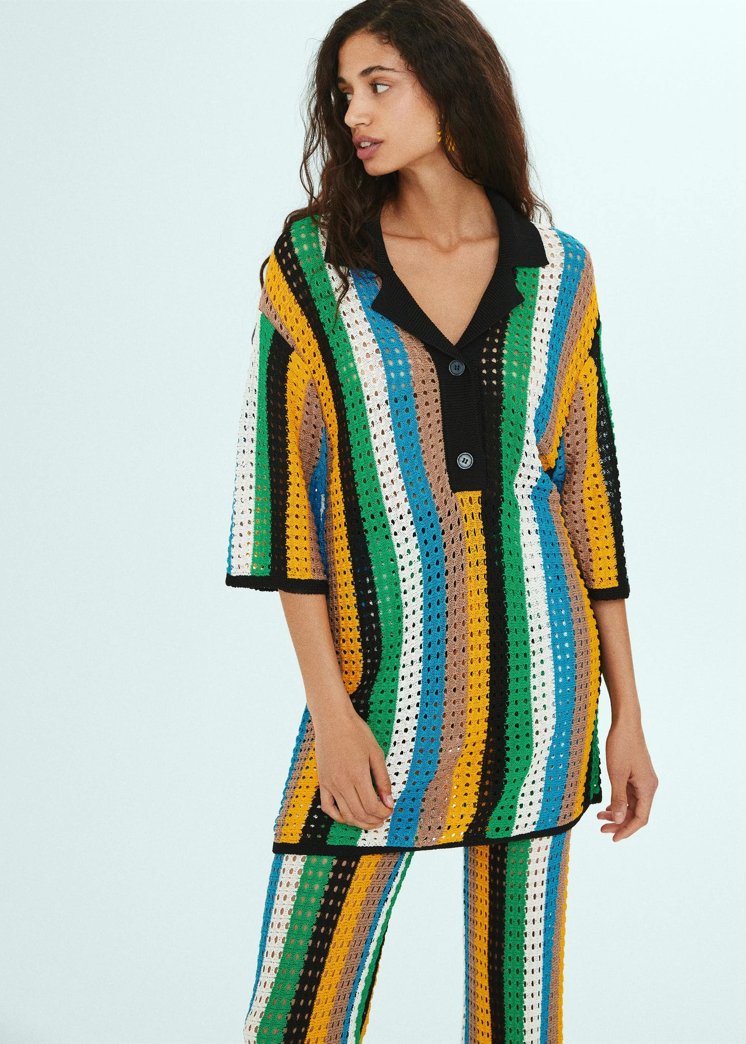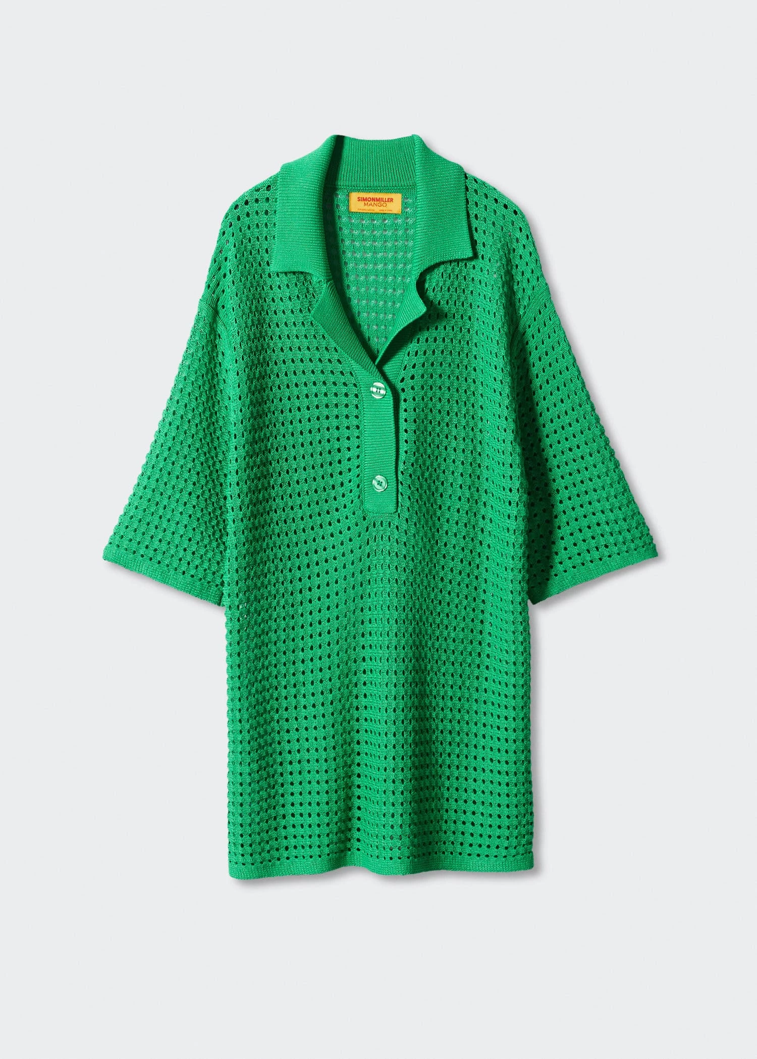 tissu en maille ajouree, coupe droite, coupe longue, col polo, manches trois quarts, fermeture boutonnee sur le devant, bords contrastants, total look, simonmiller mango : nous nous sommes associes a la marque de los angeles pour vous proposer une collection d’ete rafraichissante qui mele le meilleur des styles californien et mediterraneen. avec des tissus de qualite et des imprimes vibrants, les vetements de cette collaboration speciale debarquent dans votre dressing pour devenir vos favoris de l’ete.Composition: 69% viscose,31% polyester