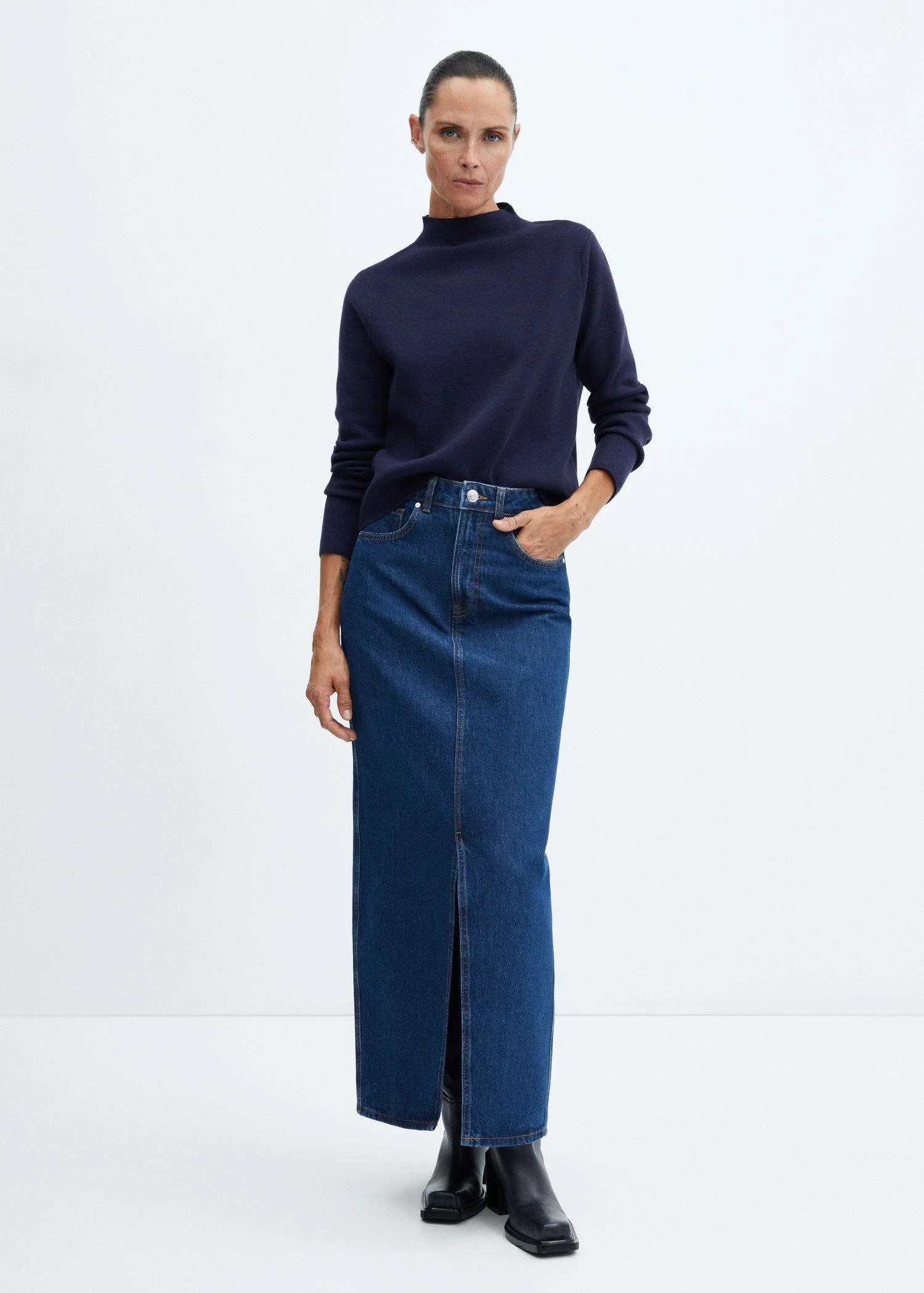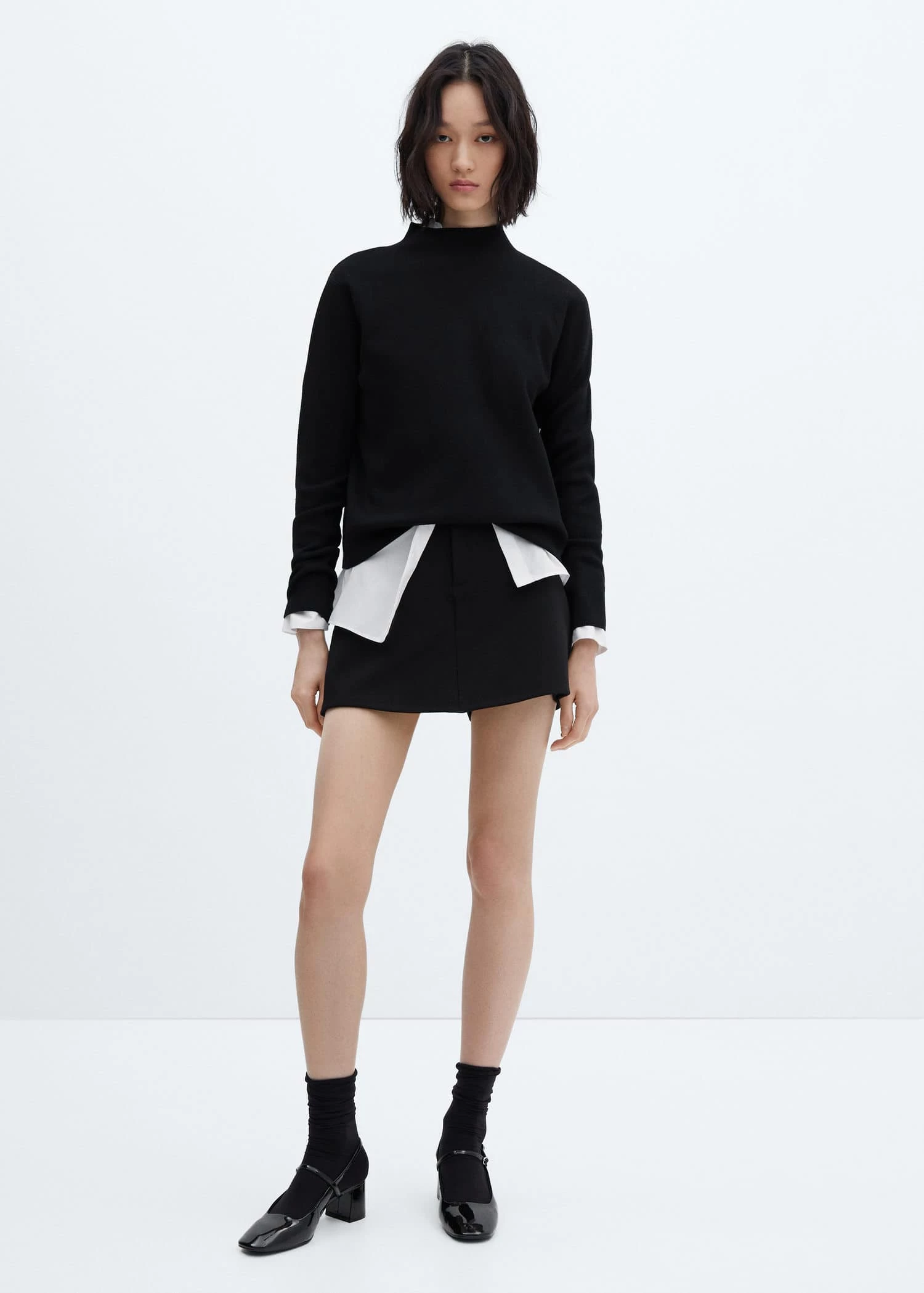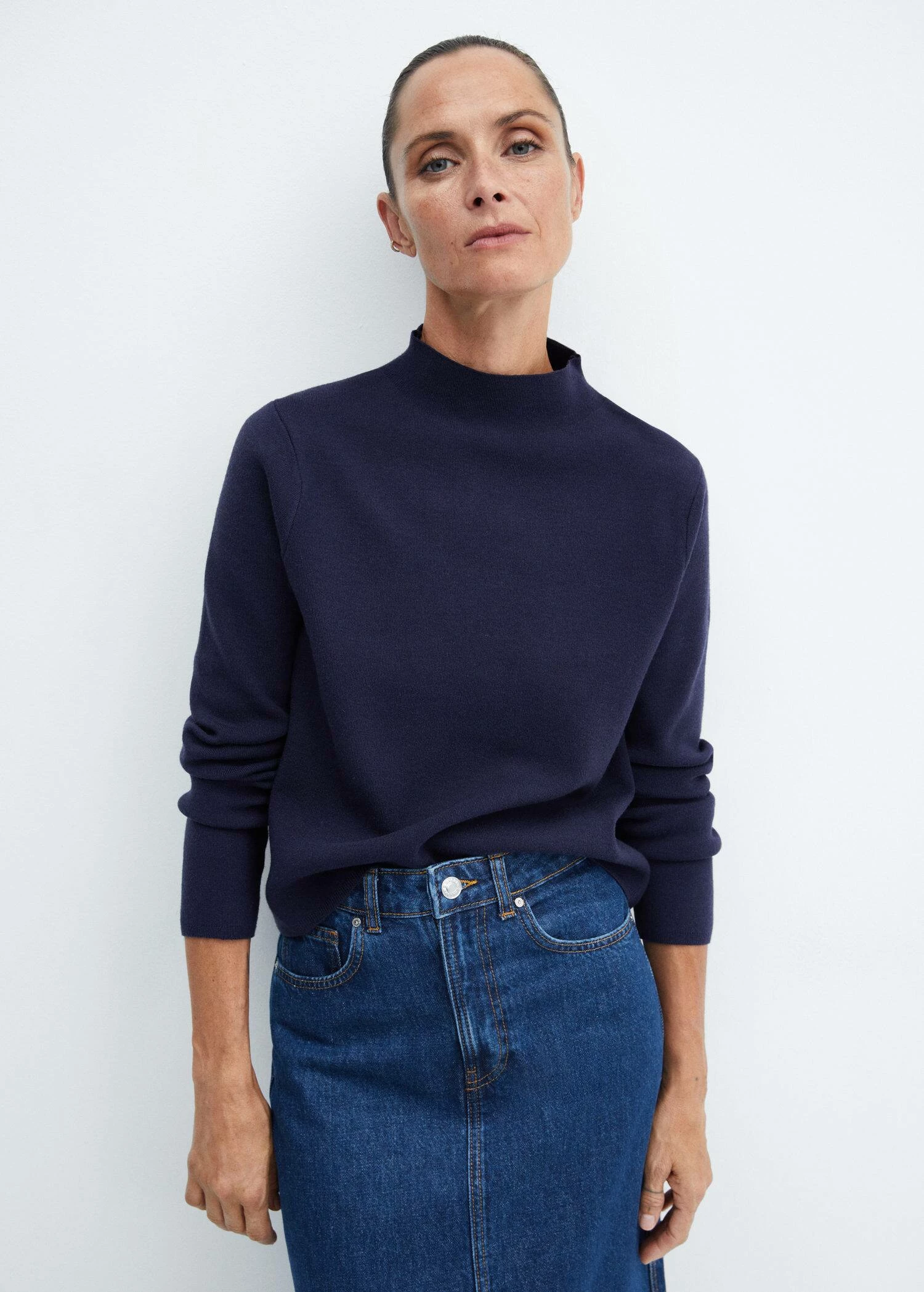 tissu en maille fine, coupe droite, col montant, manches longues, disponible plus, looks de bureau, la couleur bleu marine est une exclusivite en ligneComposition: 50% viscose,28% polyester,22% polyamide