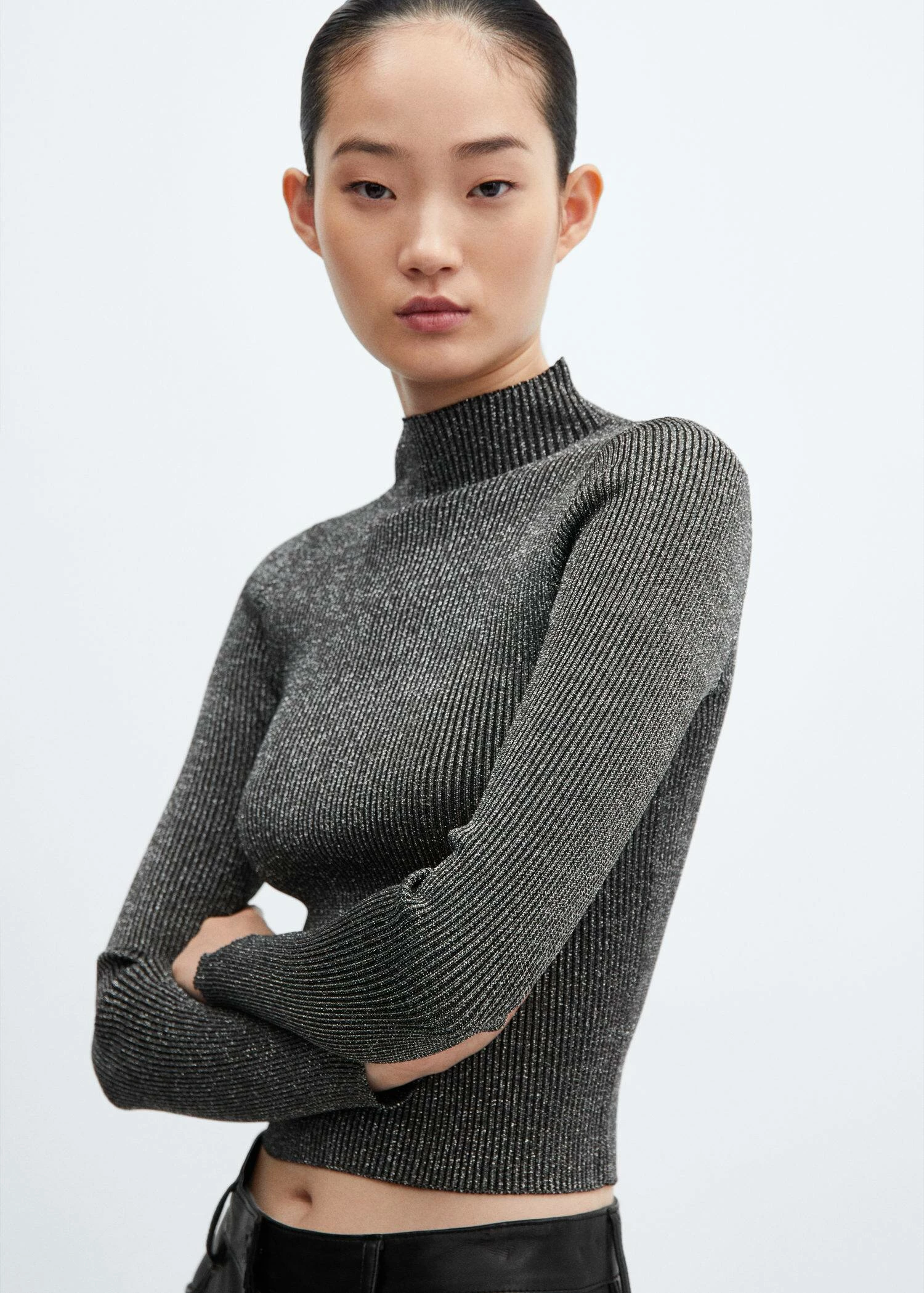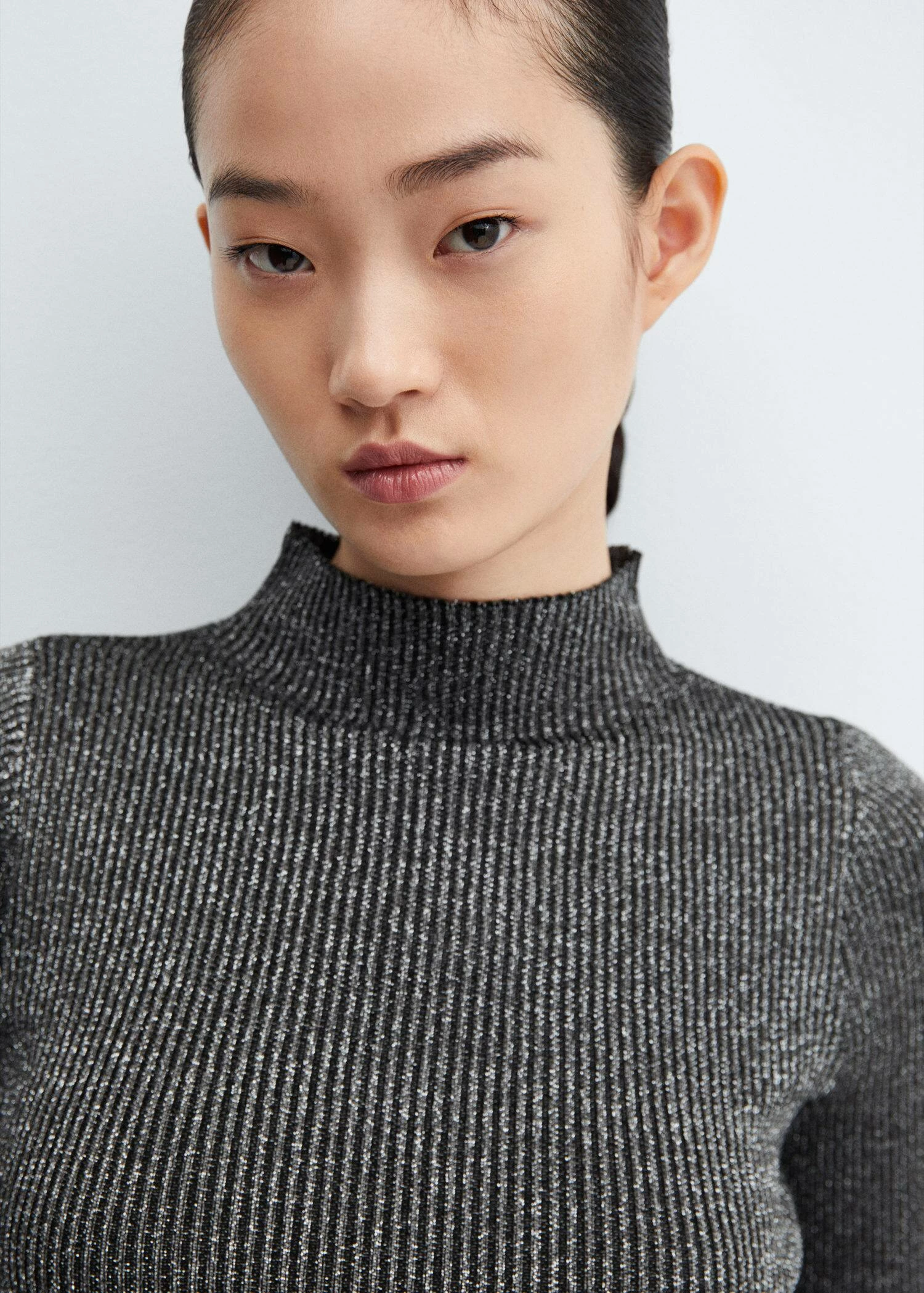 tissu lurex, tissu en maille fine, ajuste, col montant, manches longues, collection fetes et ceremonies.Composition: 100% polyester