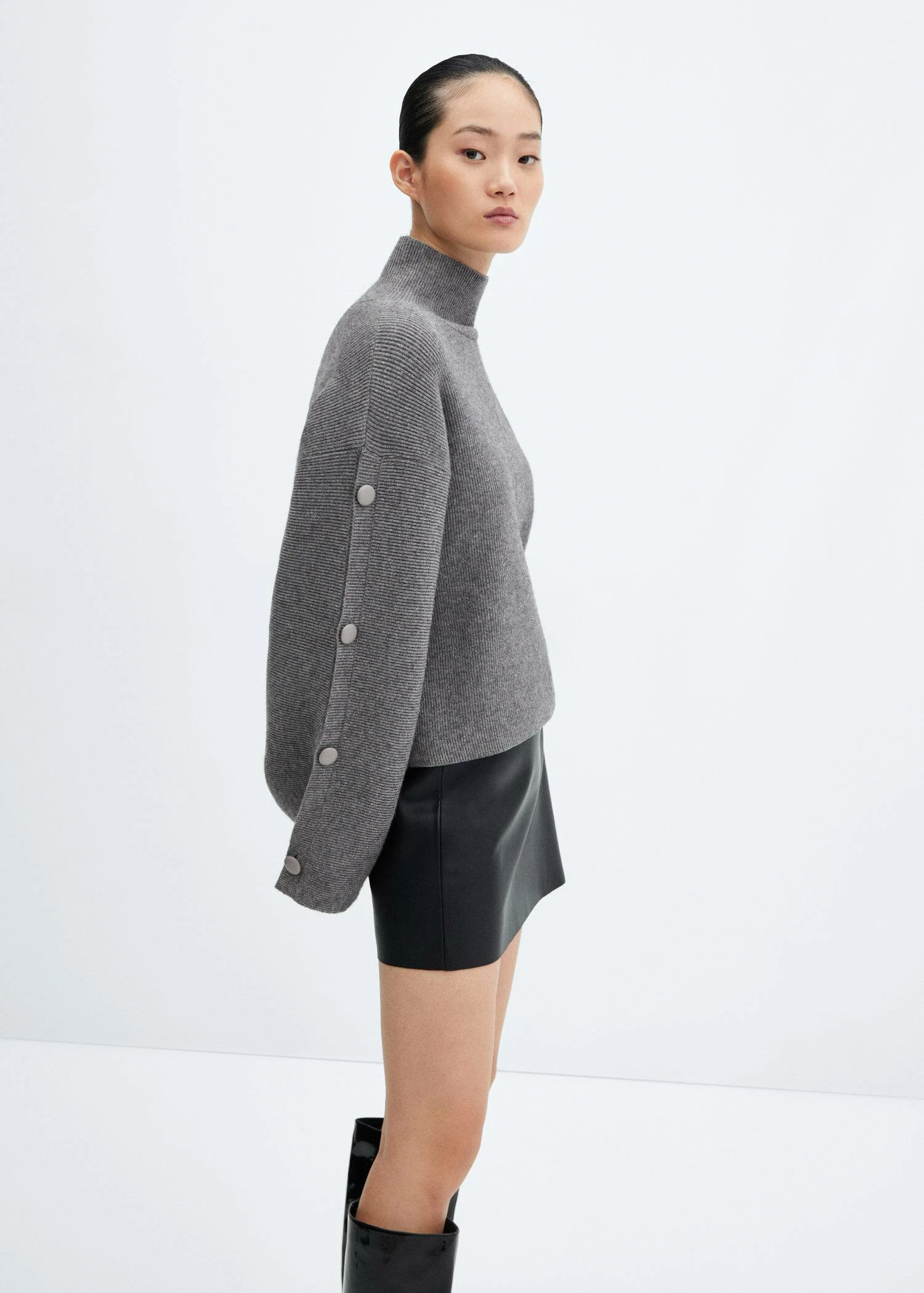 tissu en maille fine, coupe courte, style oversize, col montant, manches longues boutonnees, manches larges, sans fermeture, coutures decorativesComposition: 50% viscose,26% polyester,24% polyamide