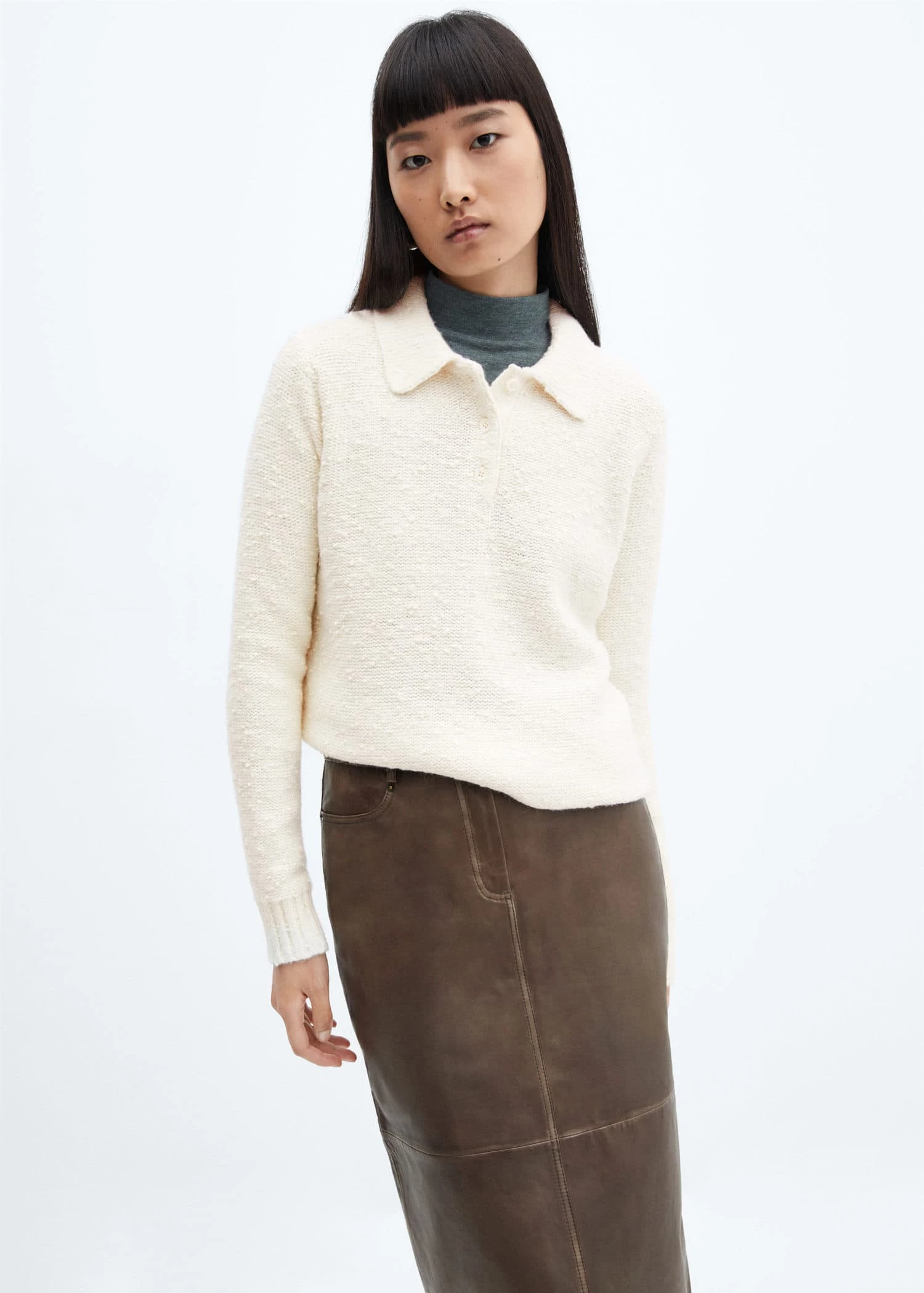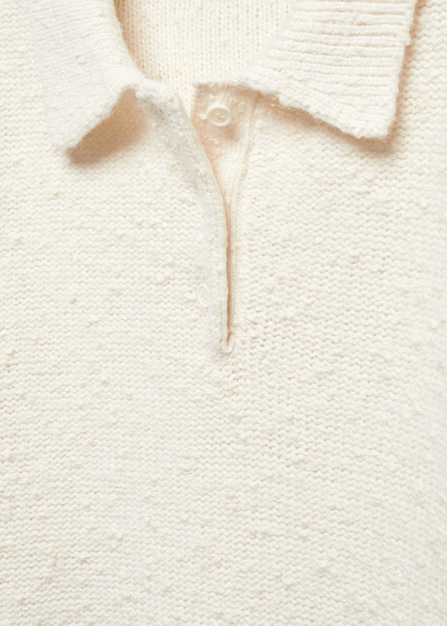 tissu de coton melange, tissu de laine melange, tissu en grosse maille, coupe droite, texture, col polo, manches longues, bords coteles au niveau du col, des manches et sur le basComposition: 52% polyester,44% coton,4% laine
