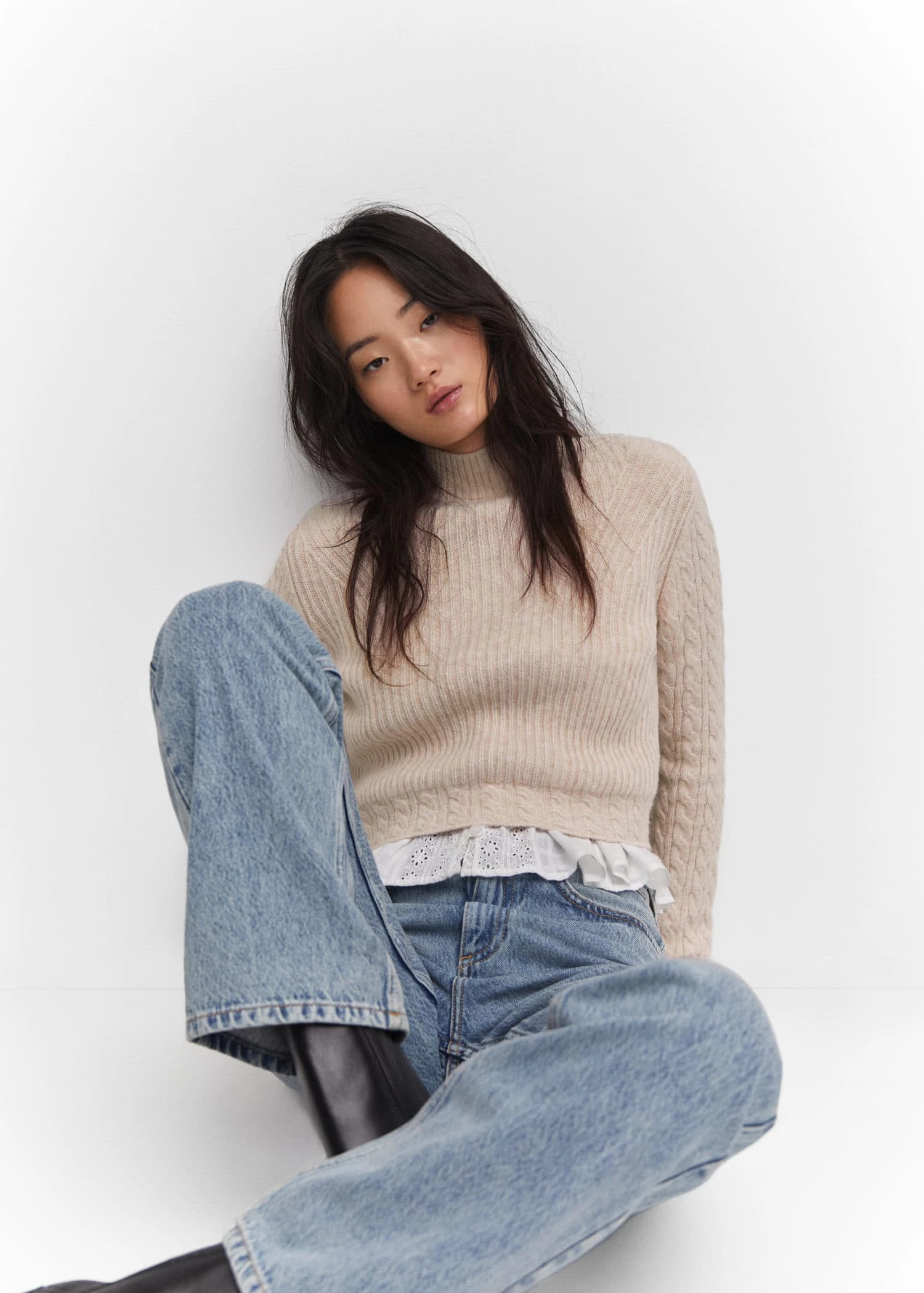 tissu en grosse maille, details tresses, droit, style crop, col montant, manches longues, bords cotelesComposition: 85% polyester,6% acrylique,6% polyamide,3% laine