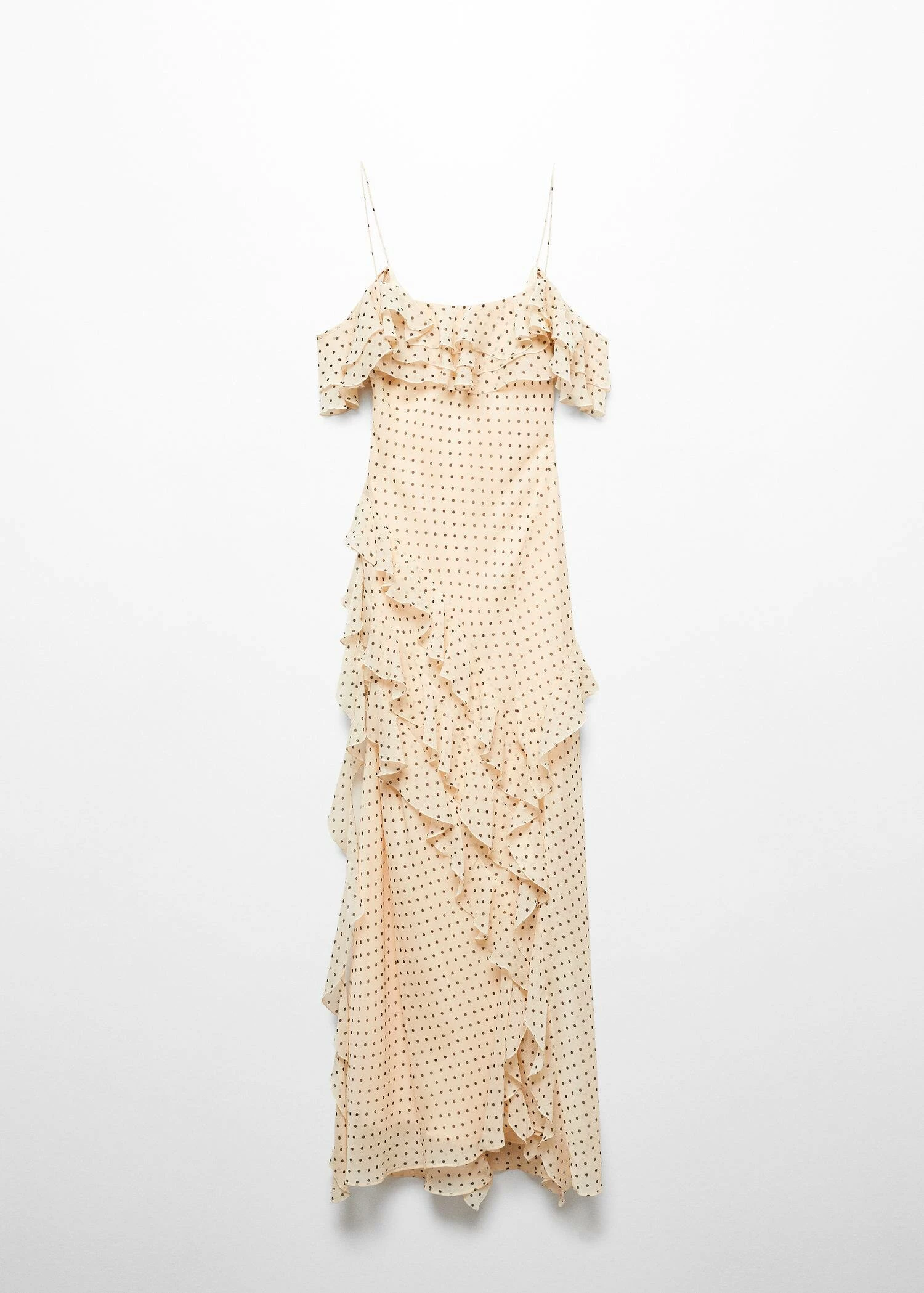 tissu en gaze, tissu fluide, imprime a pois, coupe longue, ajuste, col bateau, manches courtes, bretelles fines, encolure au dos, details volantes, fermeture eclair invisible sur le cote, ouverture en bas a l’avant, doublure, collection fetes et ceremoniesComposition: 100% polyester. Doublure: 100% polyester. Lisiere: 100% polyester