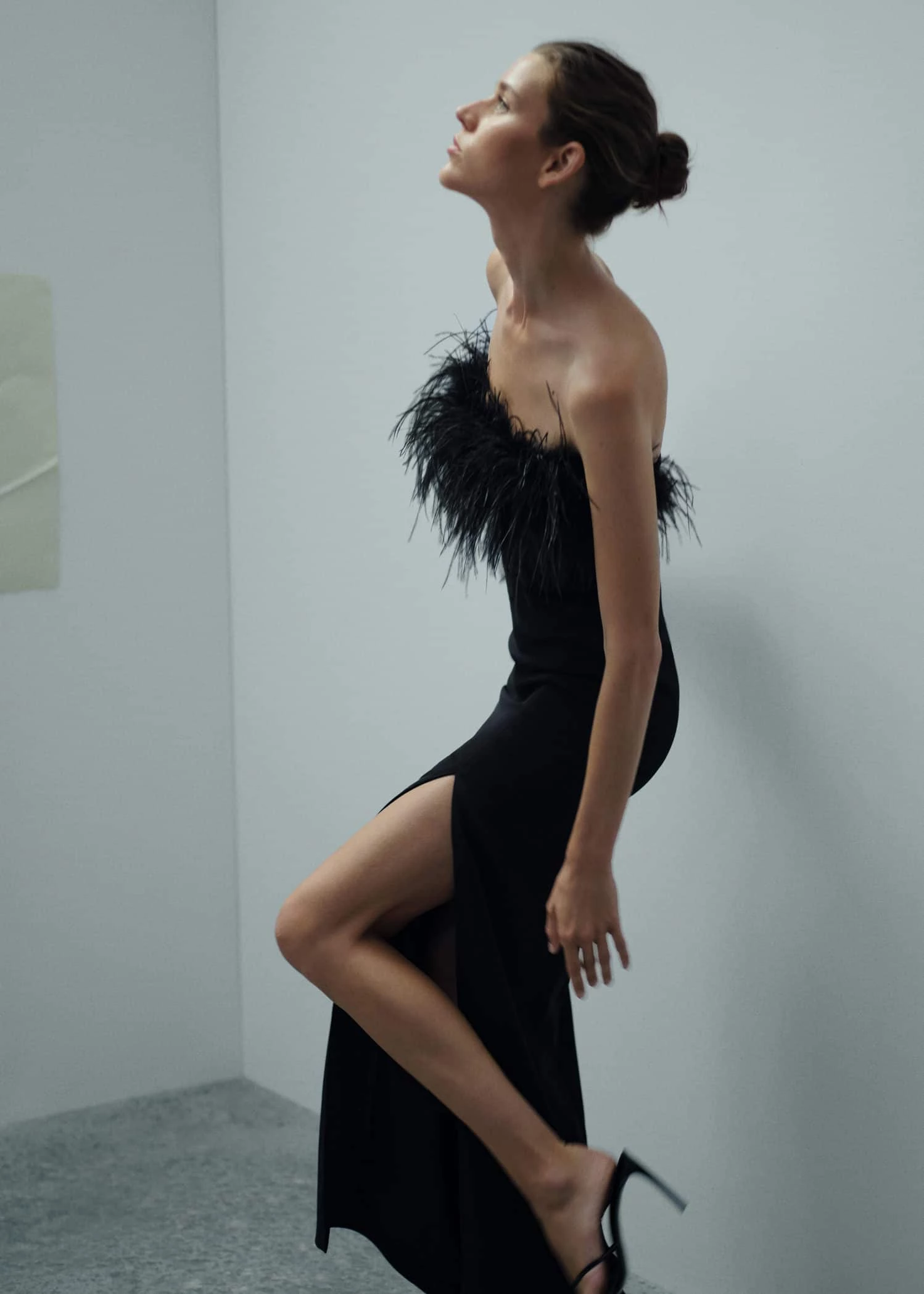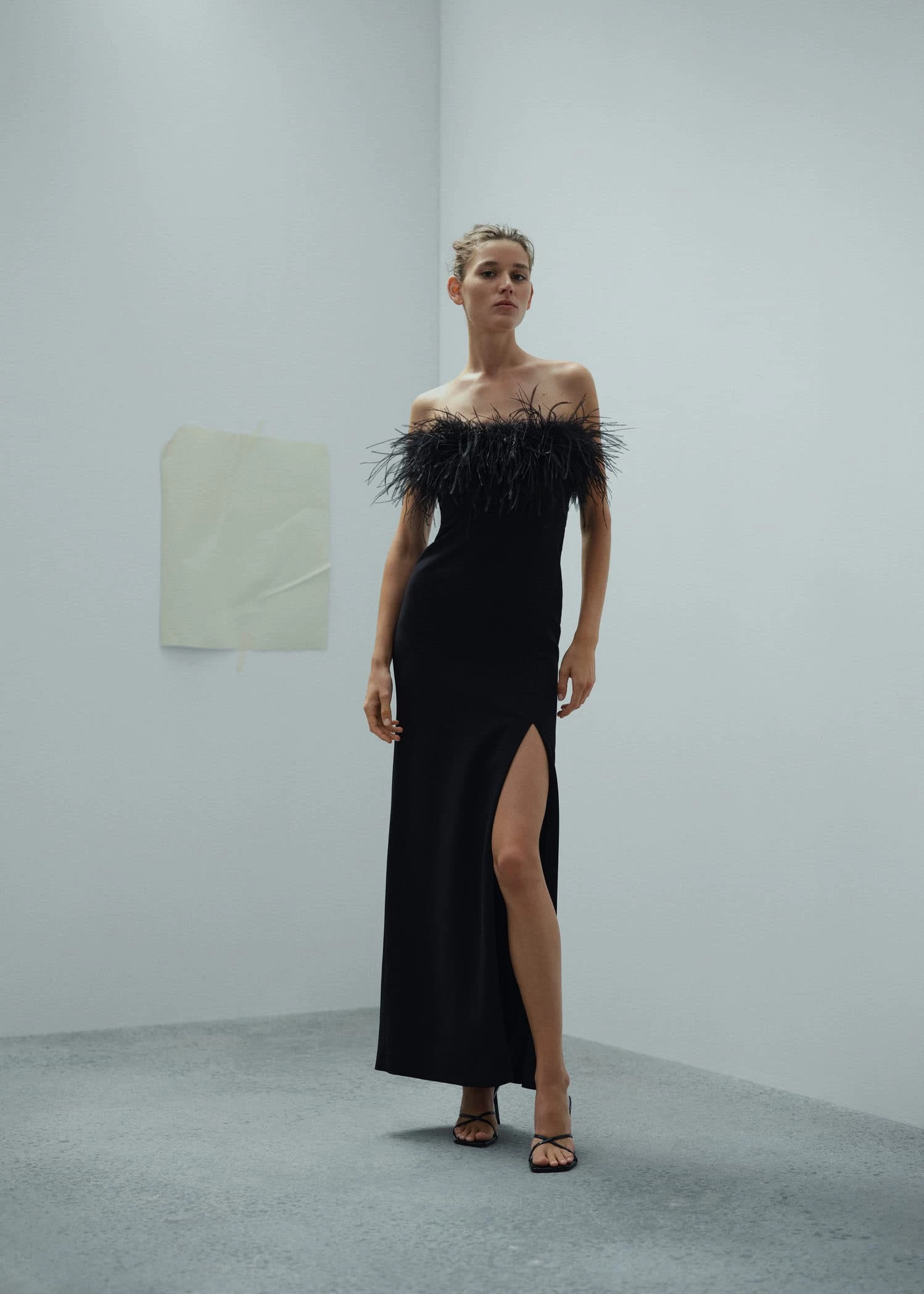 tissu fluide, coupe cintree, coupe longue, bustier, ornement en plumes, sans manches, fermeture eclair a l’arriere, doublure, fabrique au maroc, collection fetes et ceremonies, capsule : une collection de vetements en edition limitee, fabriques avec les meilleurs tissus et le plus grand soin en matiere de patrons, afin d’obtenir les meilleures finitions. cette collection exclusive est concue pour les evenements et les occasions les plus chics.Composition: 97% viscose,3% elasthanne. Doublure: 89% polyester,11% elasthanne