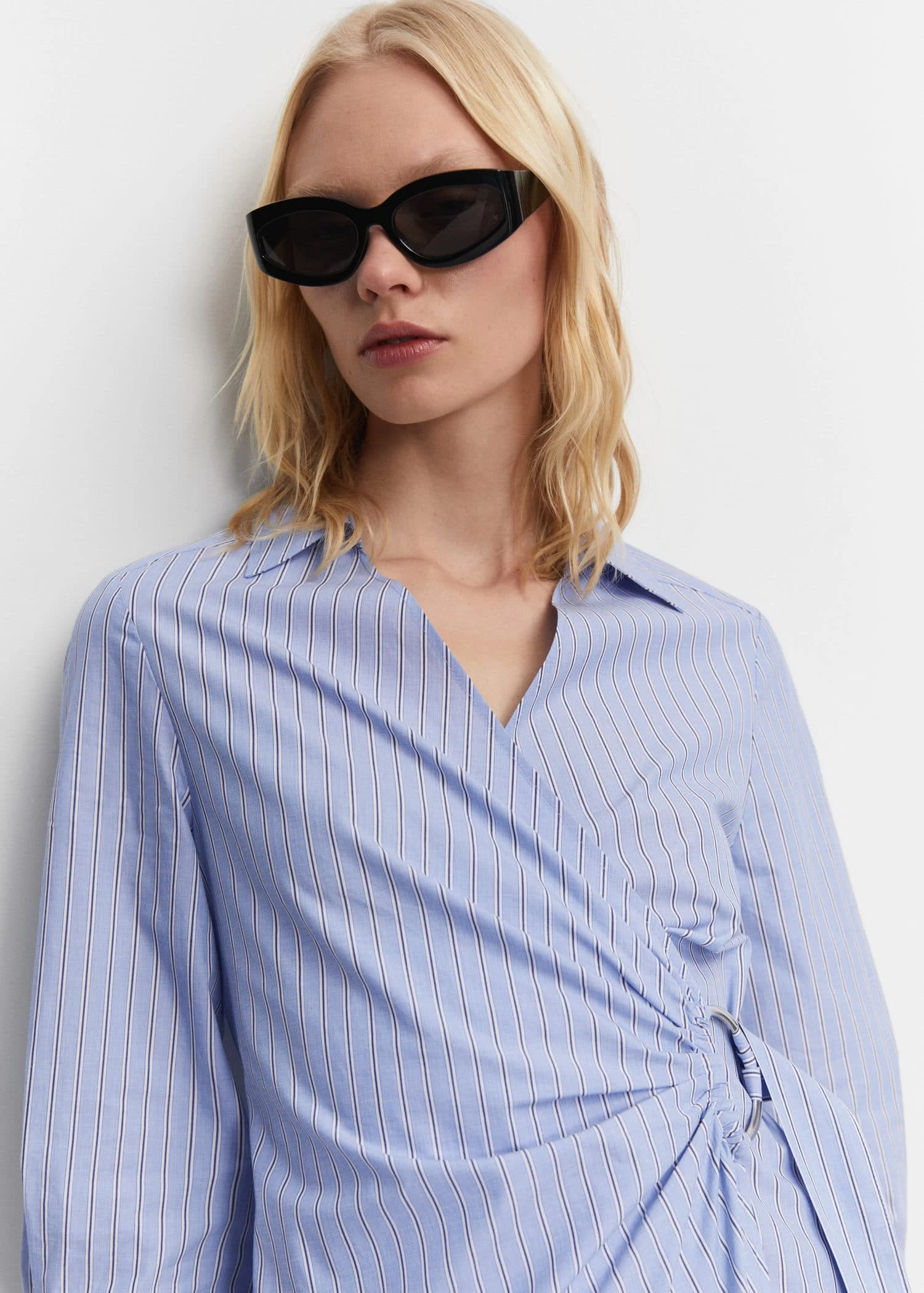 tissu 100 % coton, style chemisier, imprime rayures, croise, coupe midi, col chemise en v, col cache-cœur en v, manches longues boutonnees, fermeture a nœud reglable, detail anneau metalliqueComposition: 100% coton