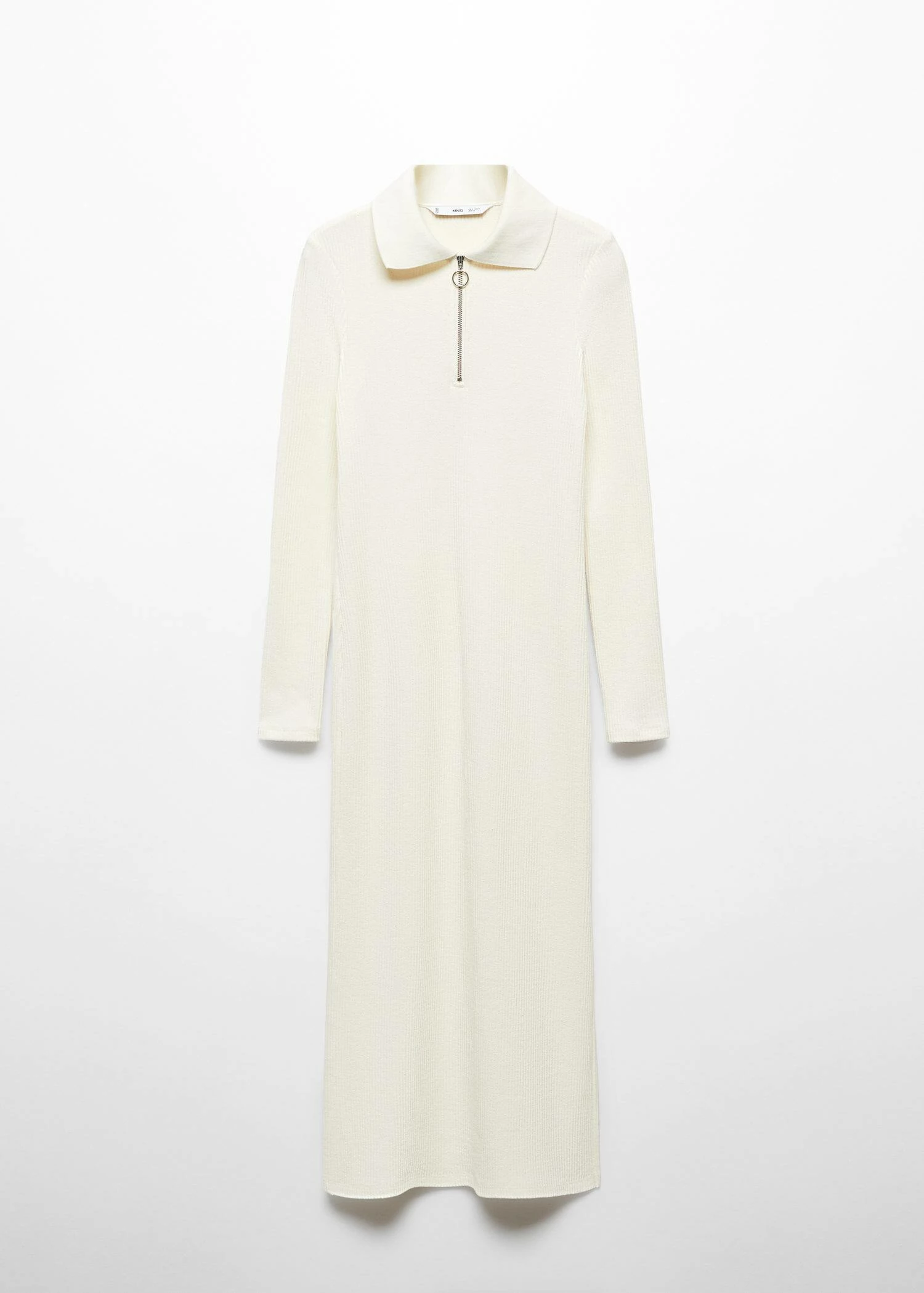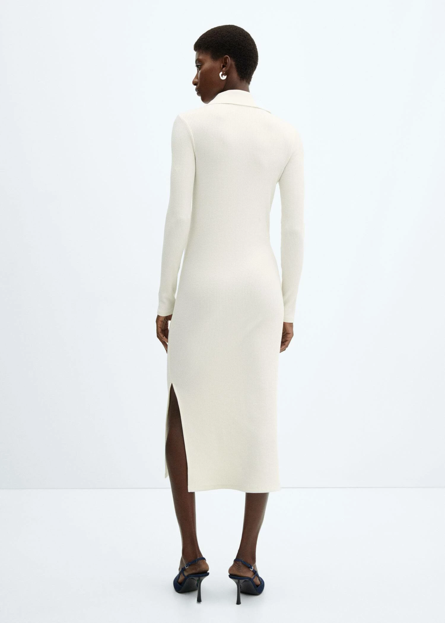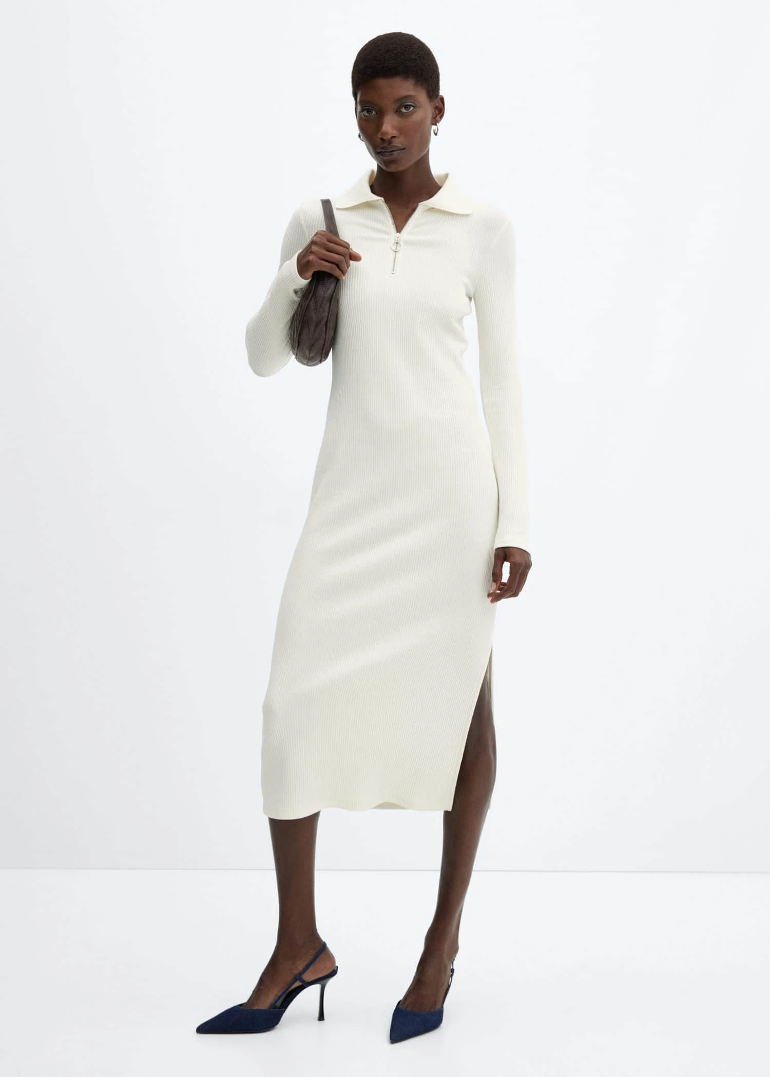 tissu en maille fine, coupe midi, ajuste, cotele, col polo a fermeture eclair, manches longues, sans fermeture, fente lateraleComposition: 52% polyester,44% coton,4% elasthanne. Col: 100% coton. Lisiere: 97% viscose,3% elasthanne