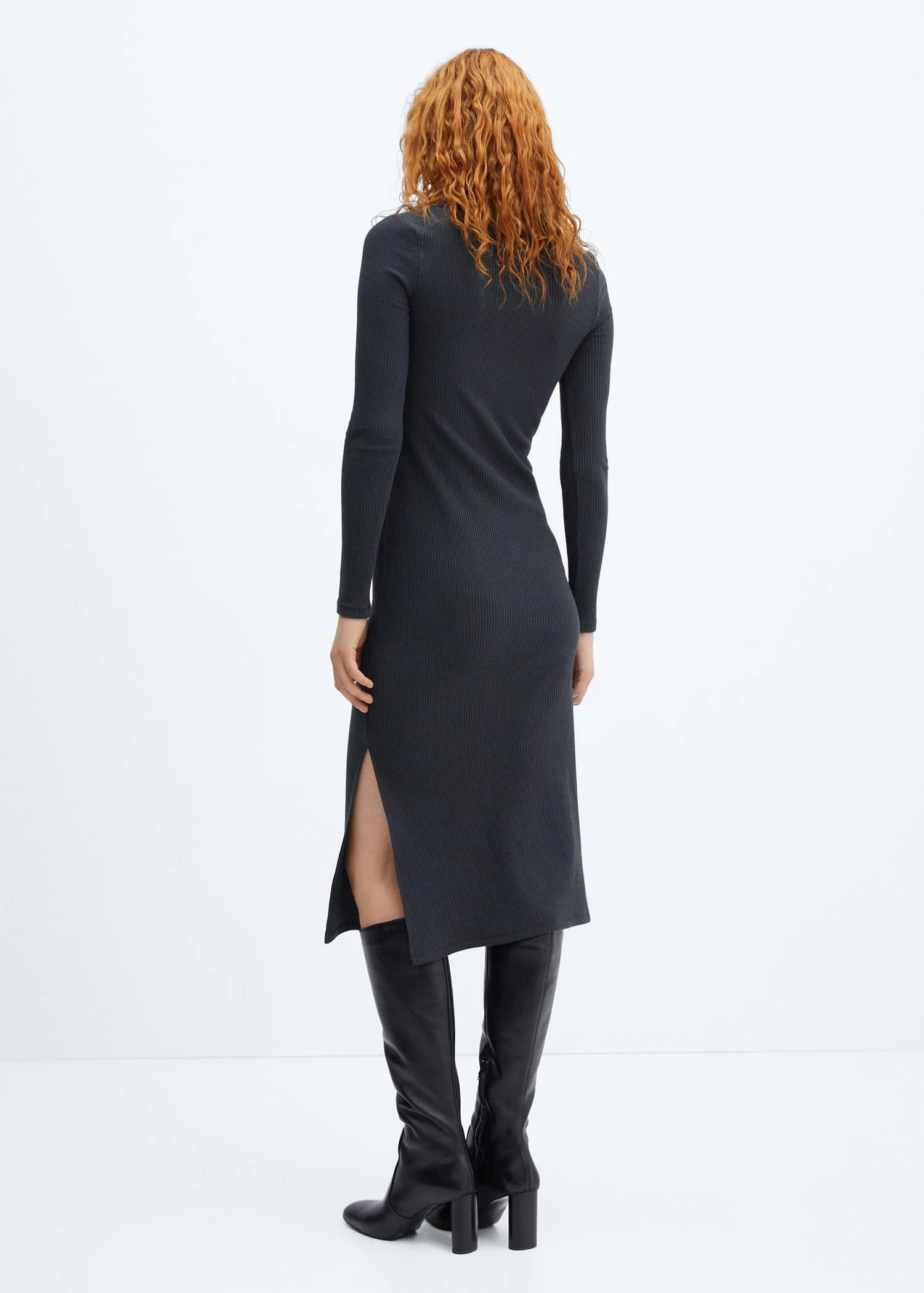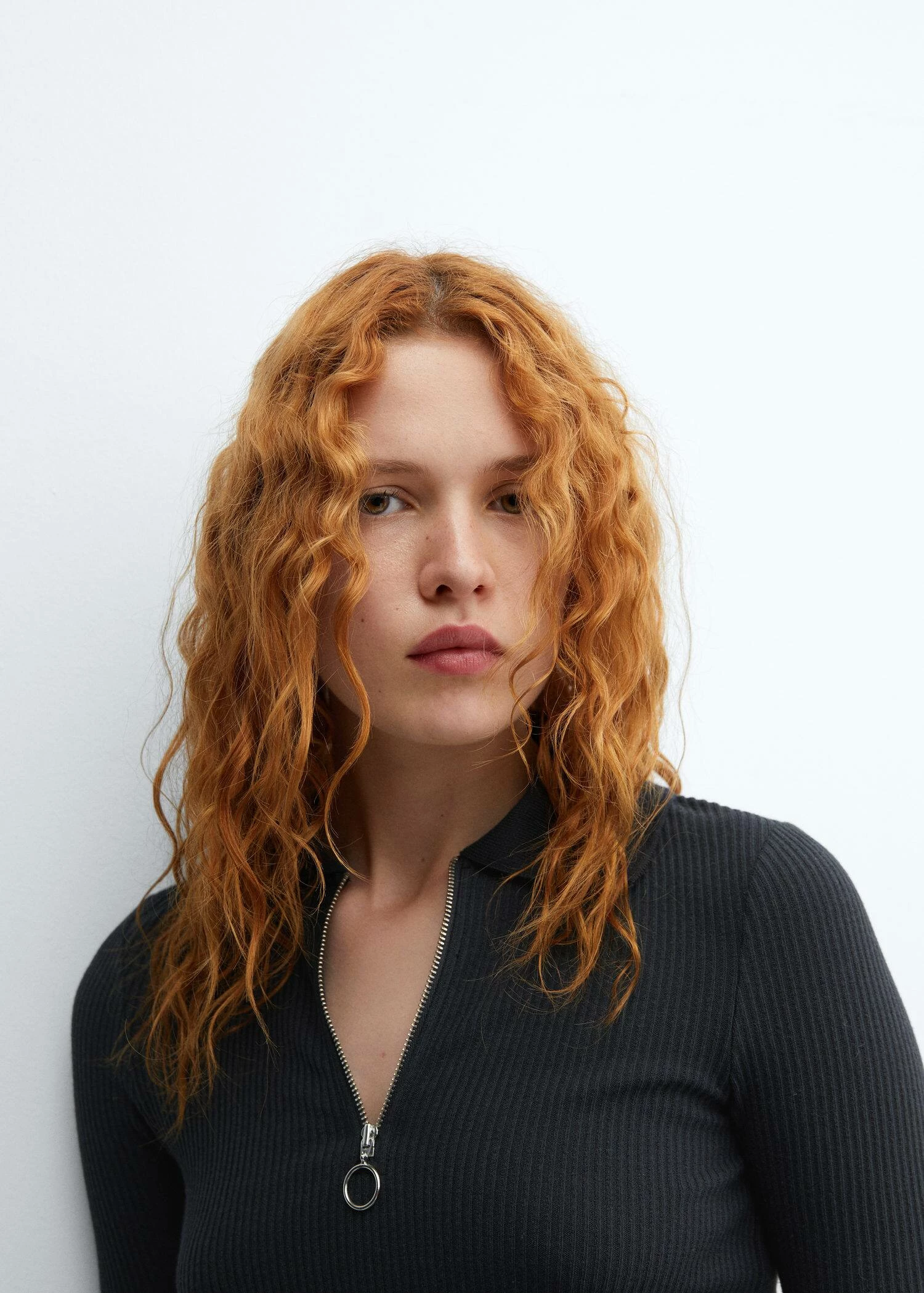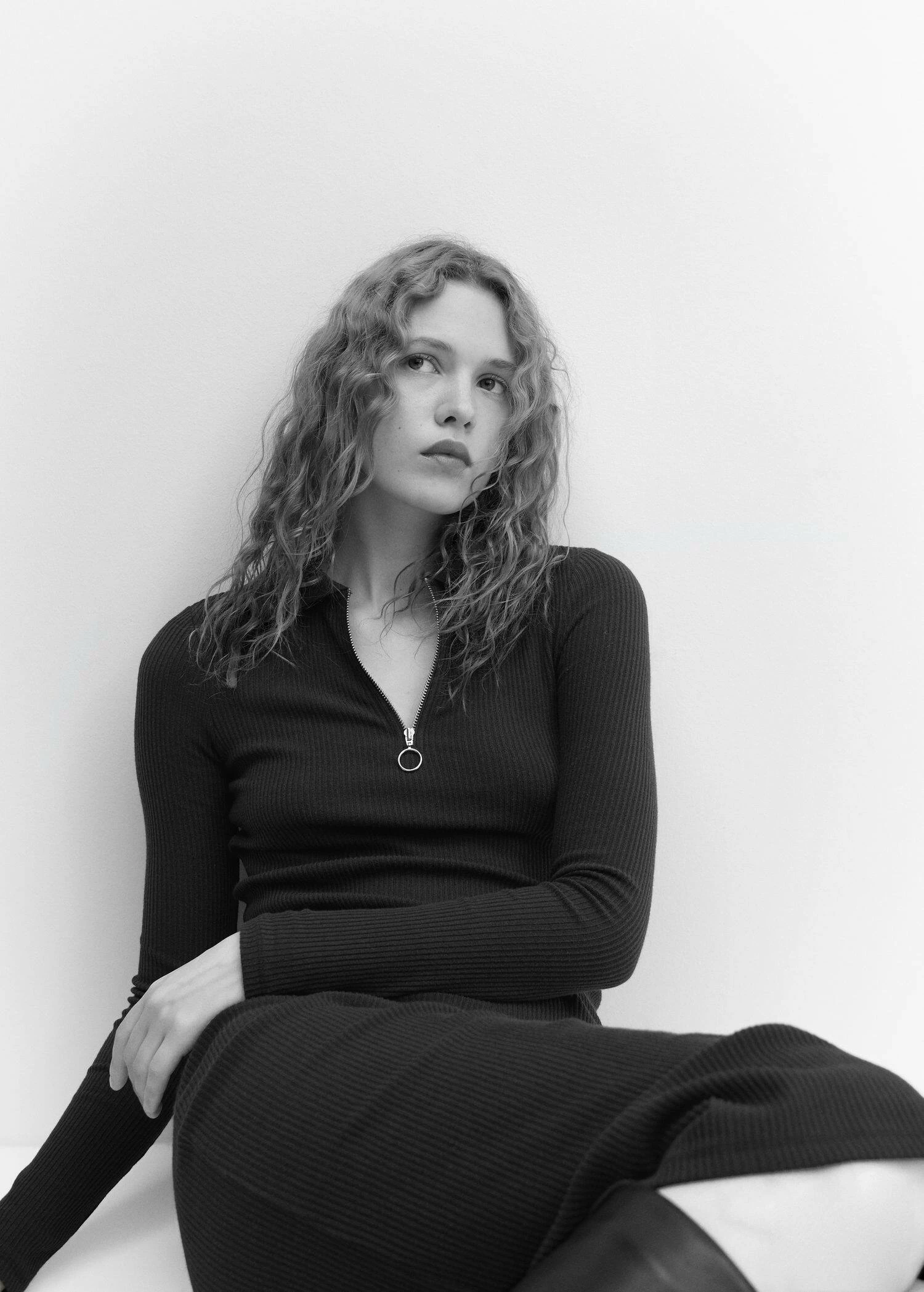 tissu en maille fine, coupe midi, ajuste, cotele, col polo a fermeture eclair, manches longues, sans fermeture, fente lateraleComposition: 52% polyester,44% coton,4% elasthanne. Col: 100% coton. Lisiere: 97% viscose,3% elasthanne