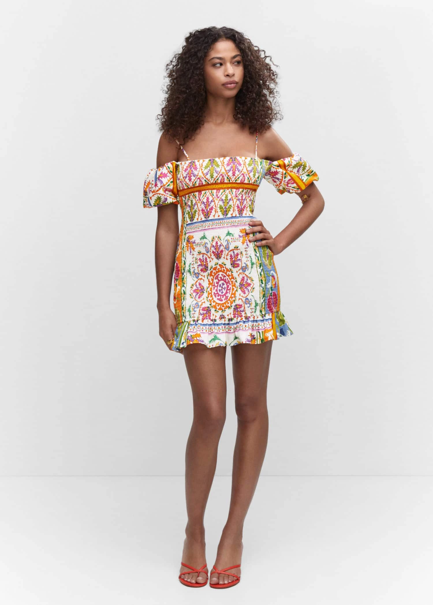 tissu 100 % coton, ajuste, imprime, fronce elastique, coupe courte, col droit, bretelles fines, manches courtes bouffantes, sans fermetureComposition: 100% coton