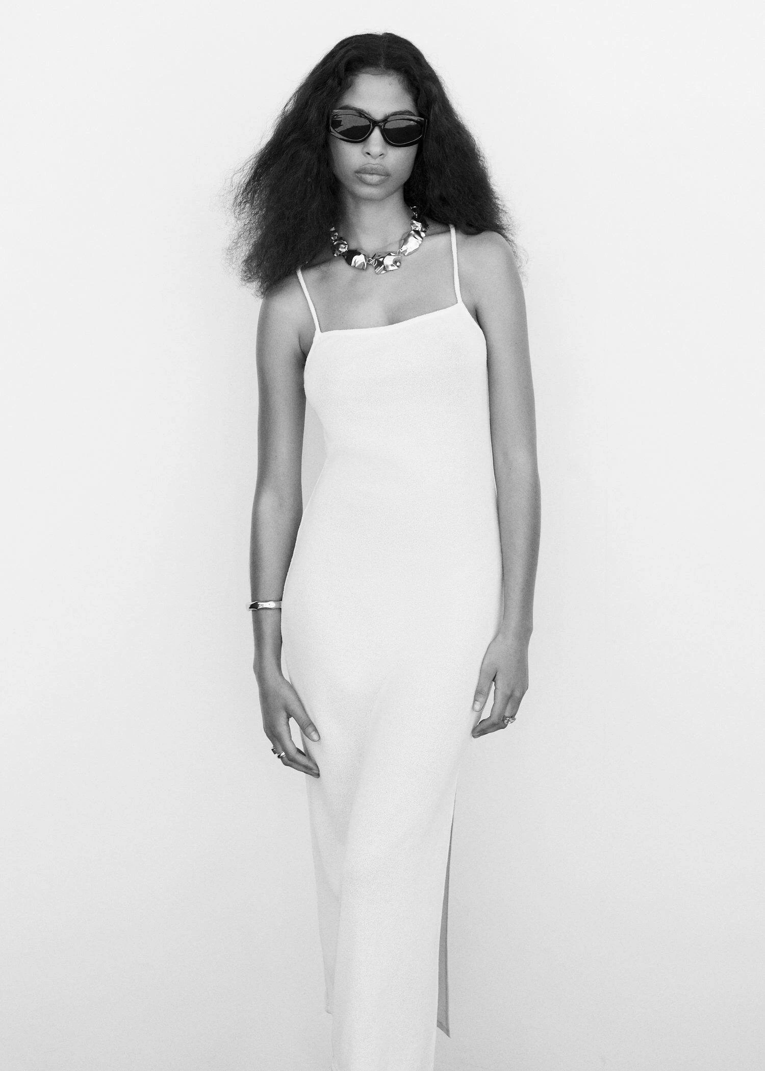 tissu en maille fine, tissu semi-transparent, ajuste, coupe midi, col droit, bretelles fines, bretelles croisees dans le dos, fente laterale, sans fermeture, saison des festivalsComposition: 94% polyester,6% elasthanne