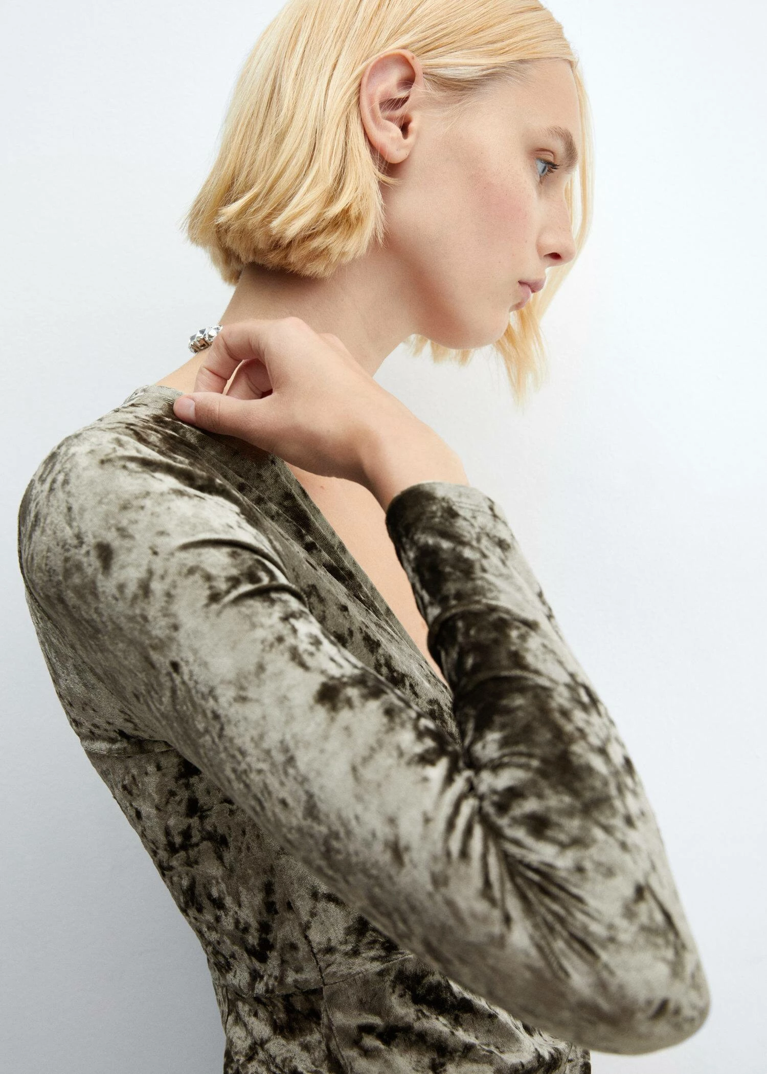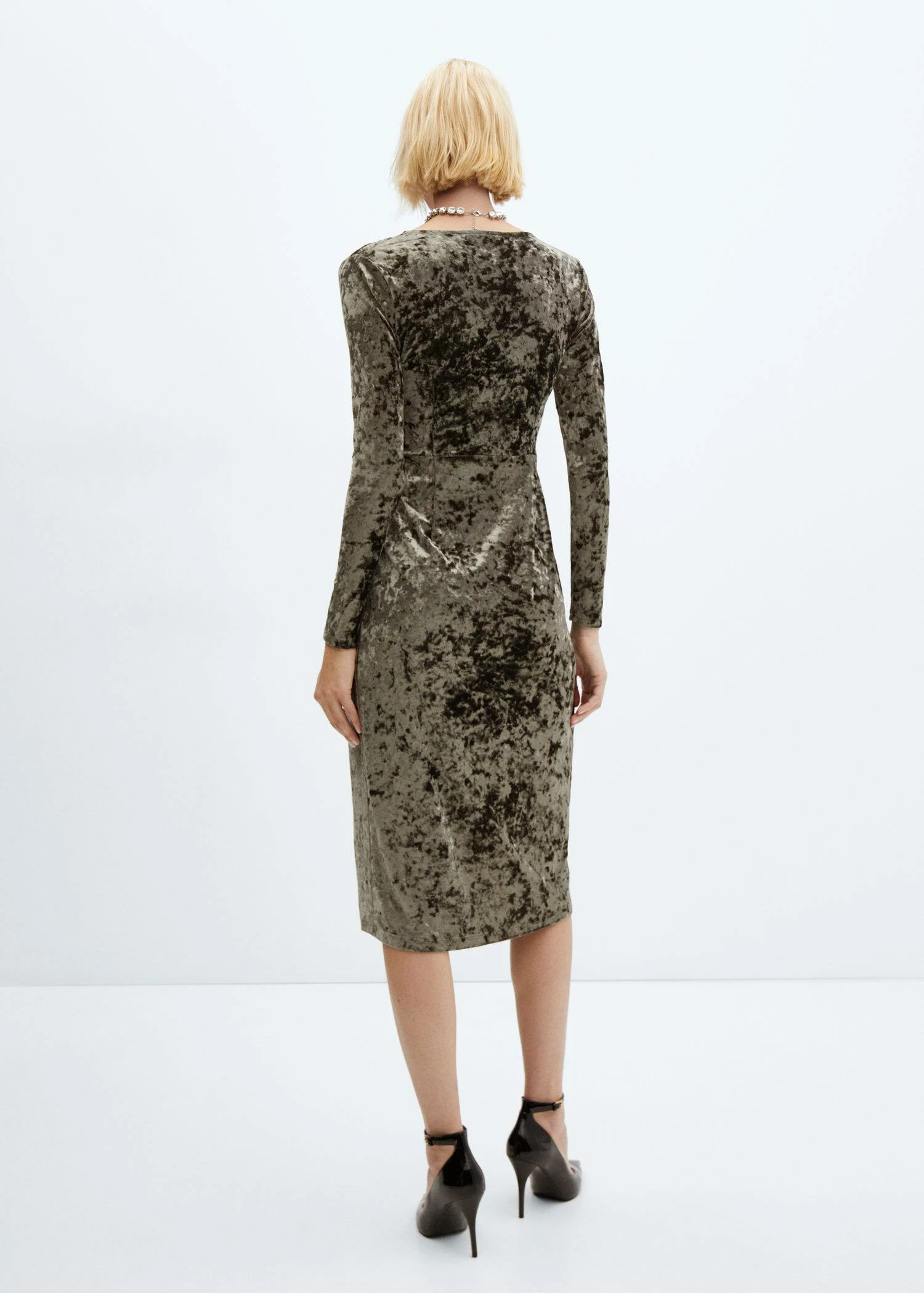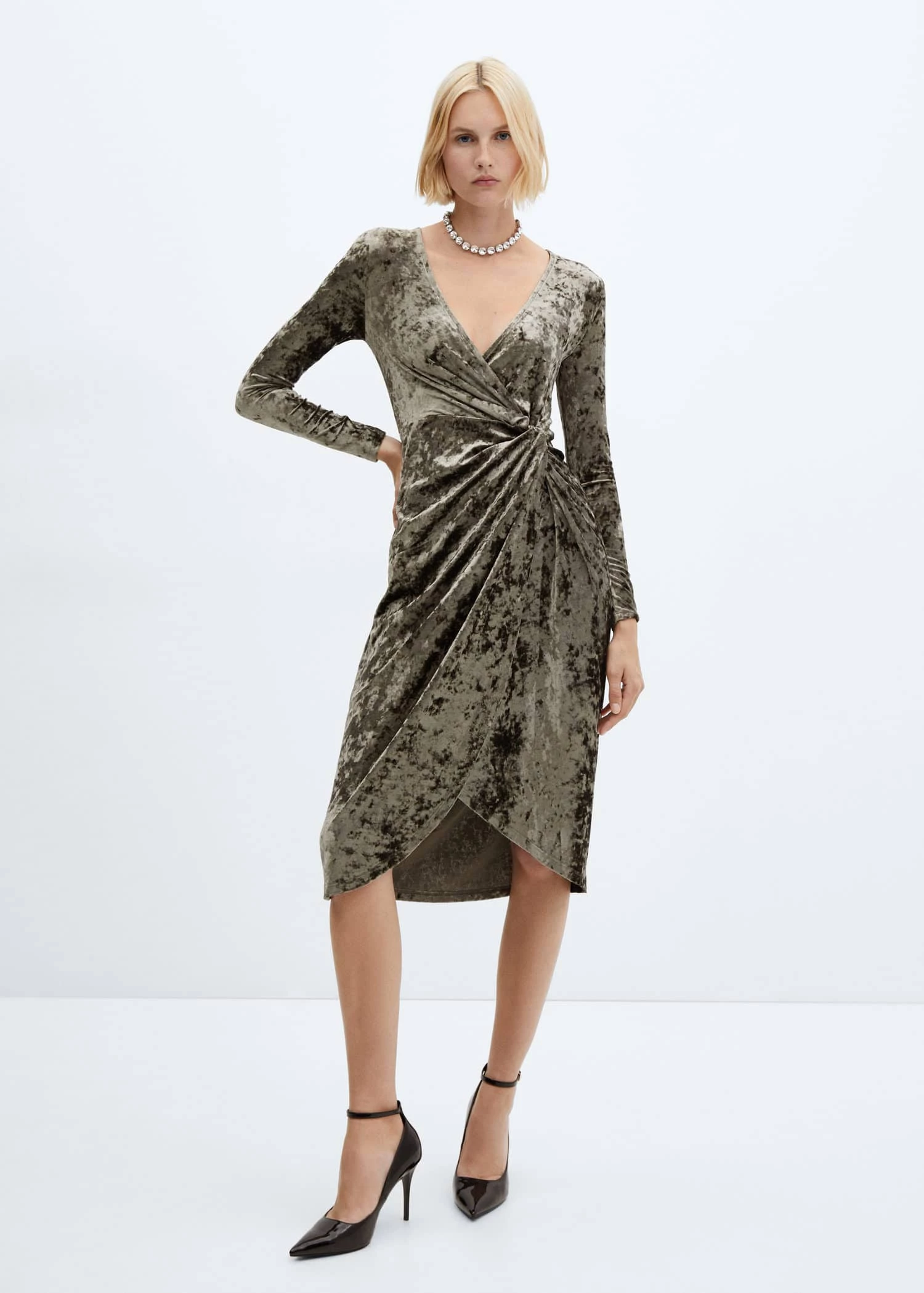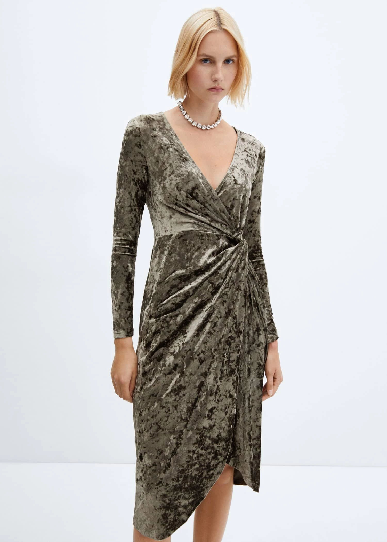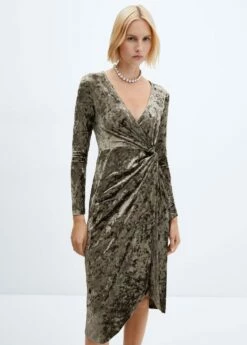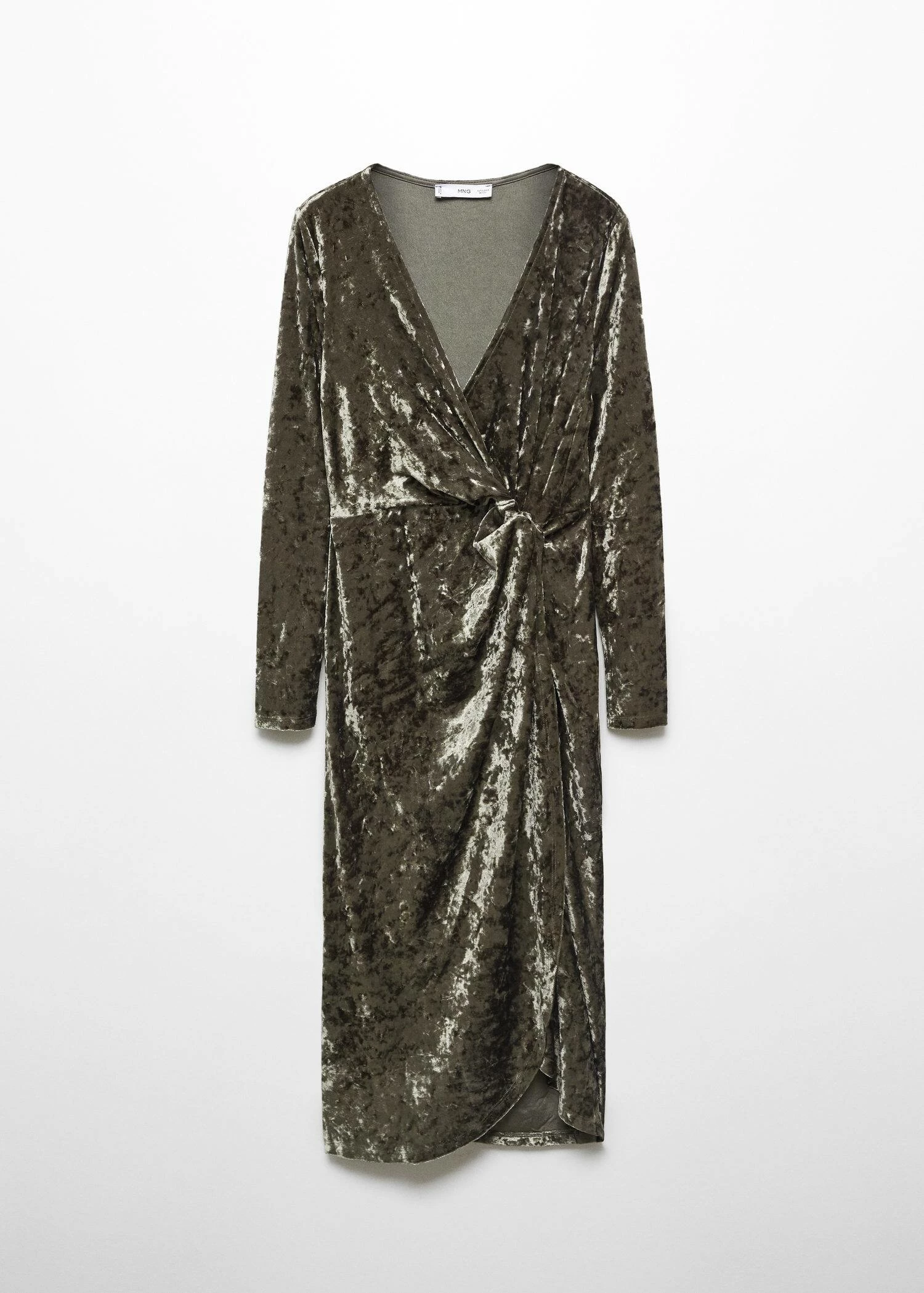 tissu en velours, coupe midi, croise, col en v, manches longues, sans fermeture, detail nœud, collection fetes et ceremonies.Composition: 95% polyester,5% elasthanne
