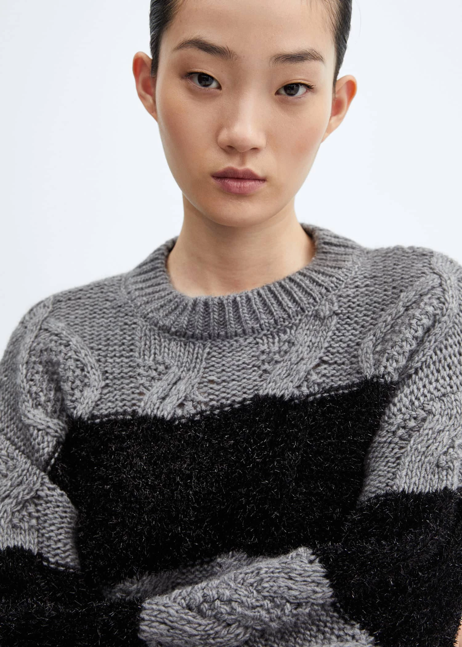 tissu de laine melange, tissu en grosse maille, maille torsadee, coupe courte, coupe droite, imprime rayures, col rond, manches longues, bords coteles au niveau du col, des manches et sur le basComposition: 48% acrylique,26% polyester,21% polyester avec revêtement de cuivre,5% laine
