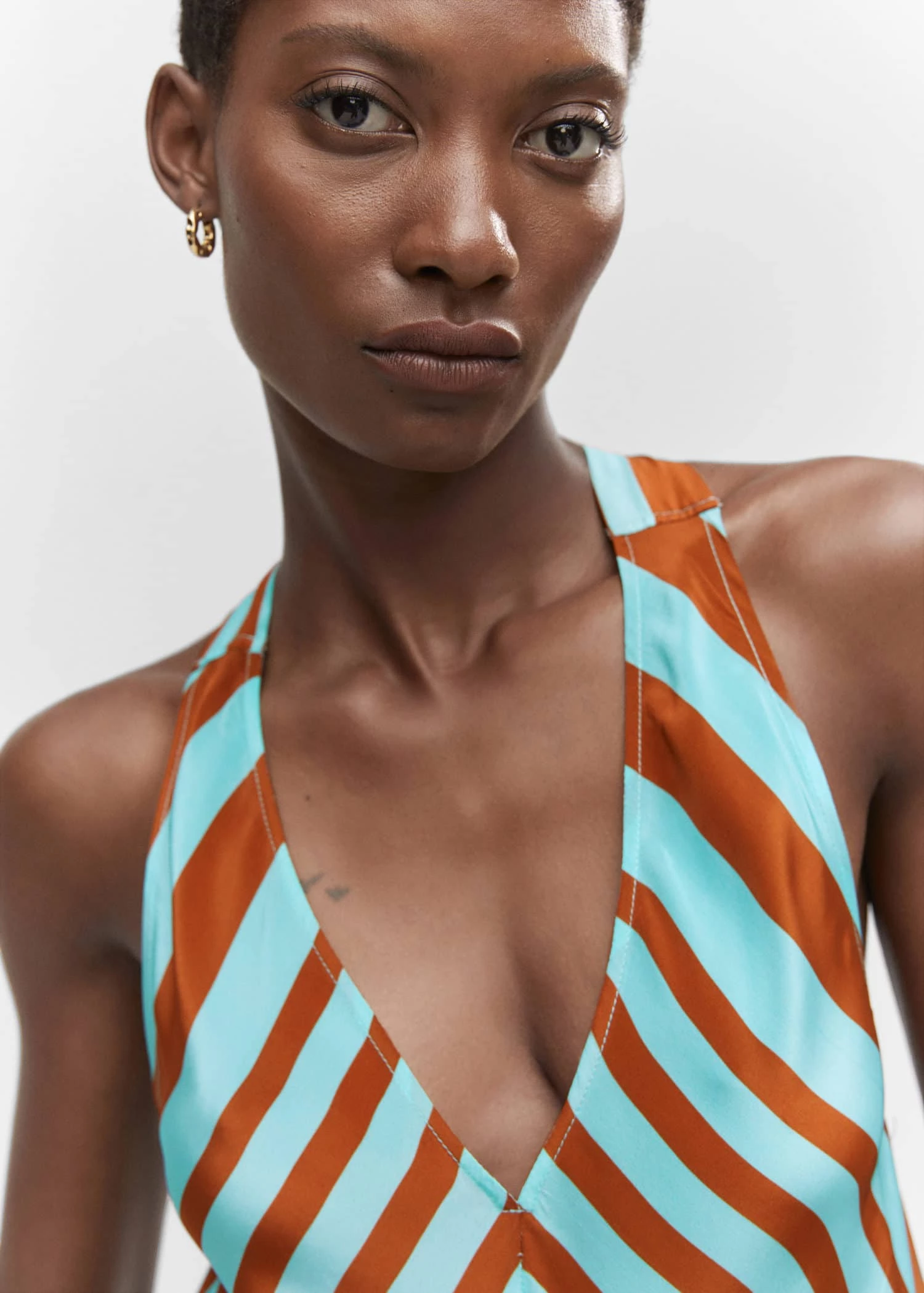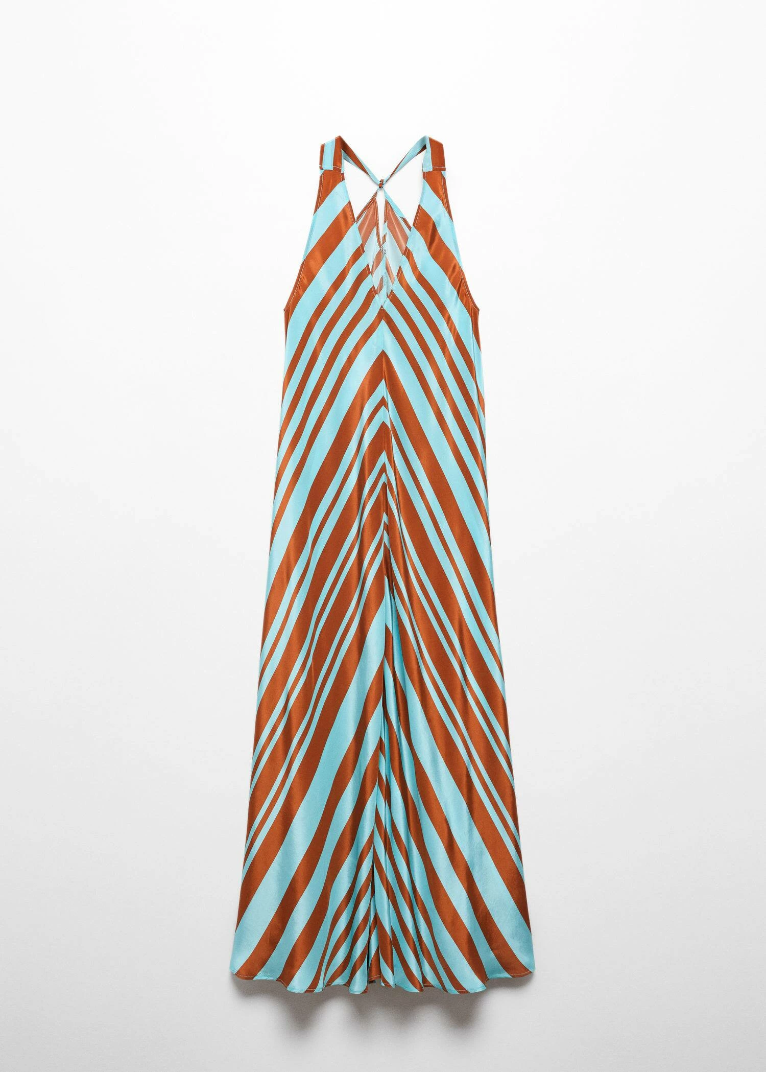tissu satine, tissu fluide, imprime rayures, coupe longue, evase, col en v, bretelles larges croisees dans le dos, detail nœud, sans fermeture, collection fetes et ceremoniesComposition: 100% viscose