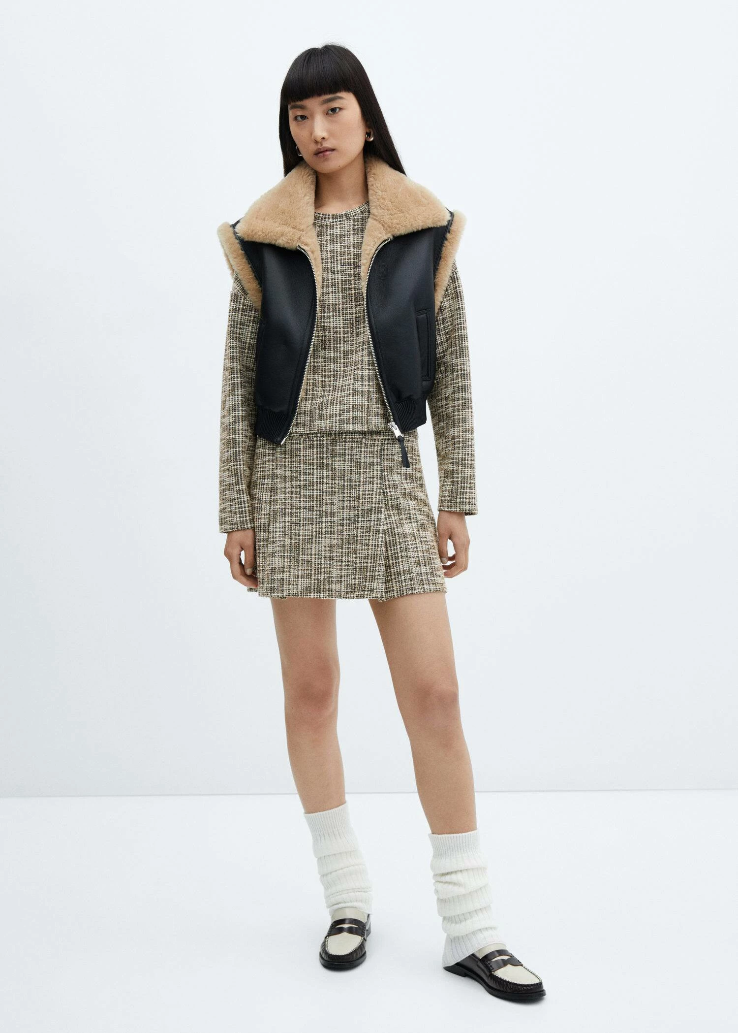 tissu de coton melange, tissu tweed, coupe courte, coupe droite, imprime jaspe, col rond, manches longues, total lookComposition: 82% polyester,16% coton,1% elasthanne,1% polyester avec revêtement de cuivre. Lisiere: 100% viscose
