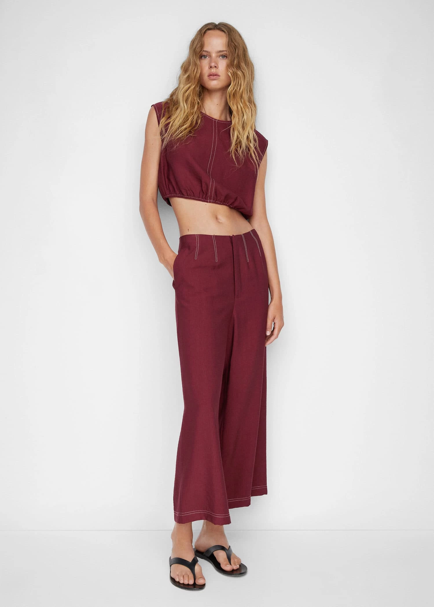 tissu fluide, forme bouffante, style crop, col rond, sans manches, bouton de fermeture a l’arriere, coutures decoratives contrastantes, total lookComposition: 86% viscose,14% polyamide