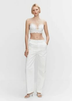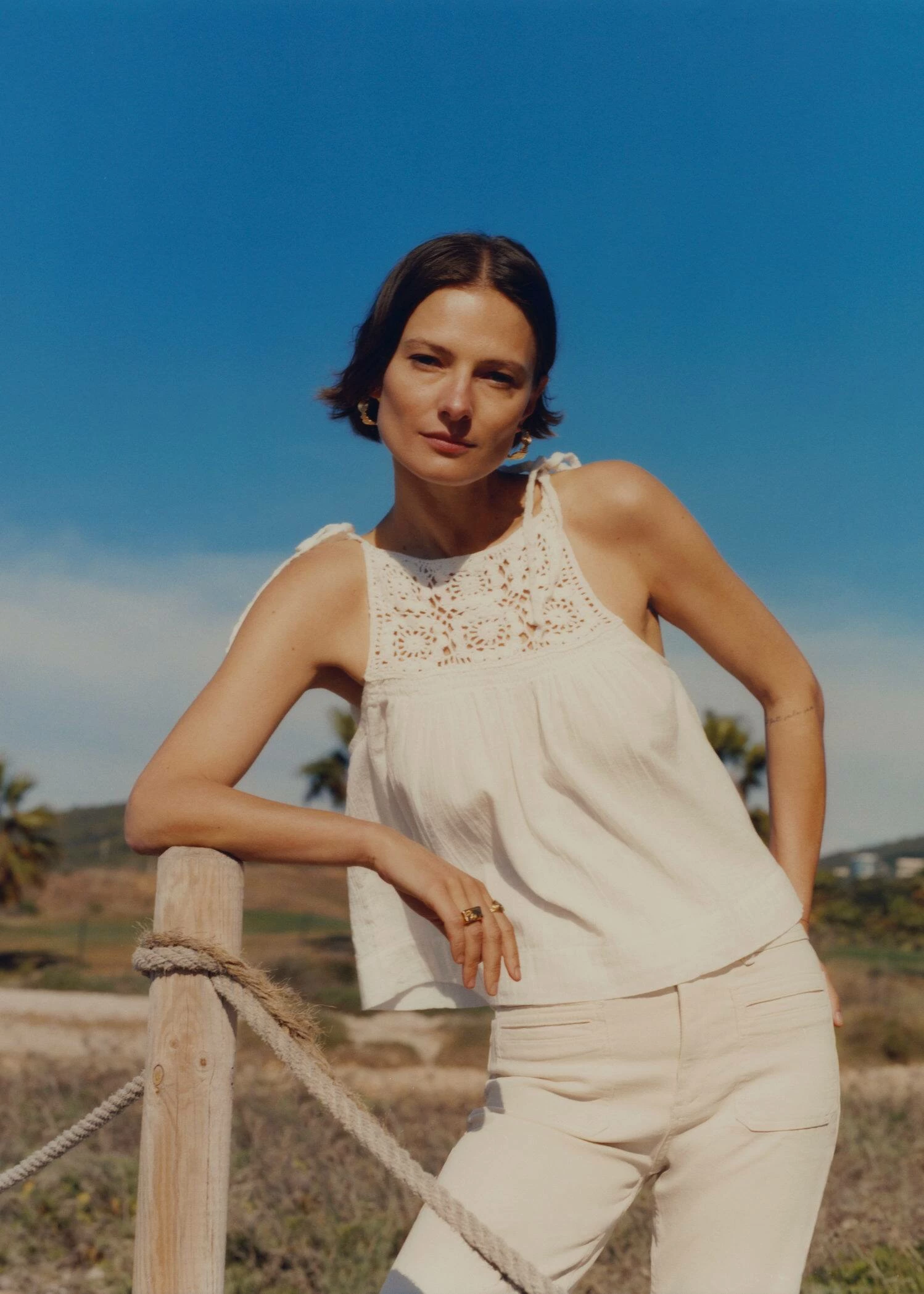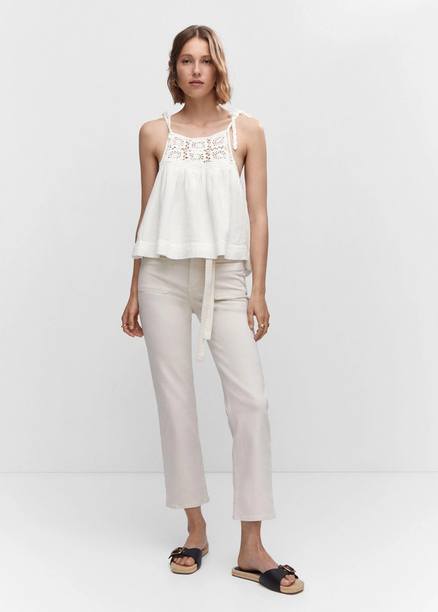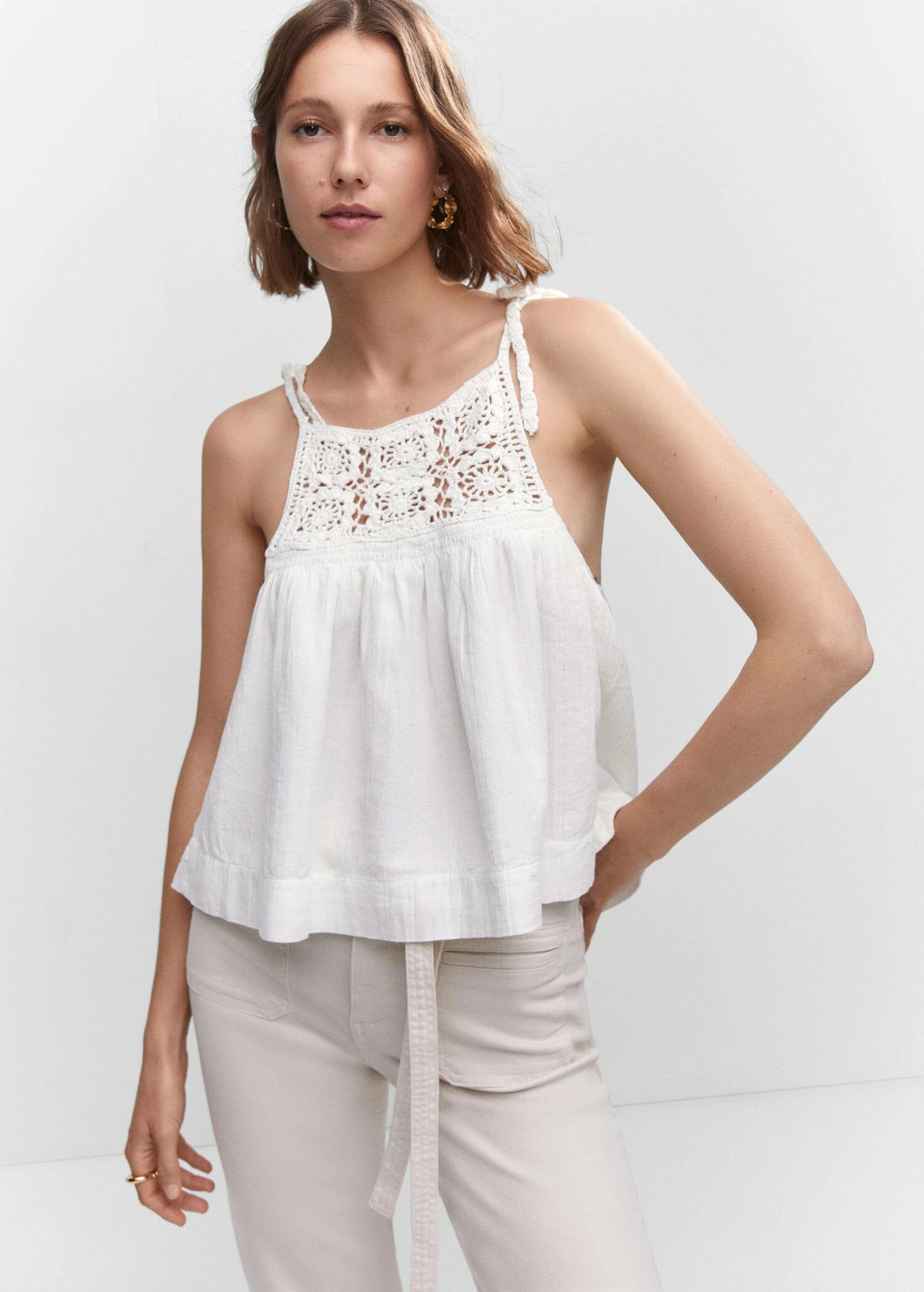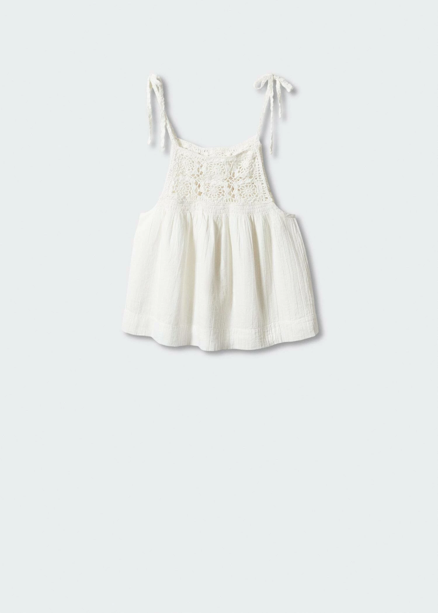 mini me, tissu 100 % coton, tissu en crochet, tissu fluide, coupe droite, style crop, col rond, fines bretelles avec fermeture a nœud, ce vetement est egalement disponible dans la collection kids girl. Composition: 100% coton. Doublure: 100% coton. Empiècement: 100% coton