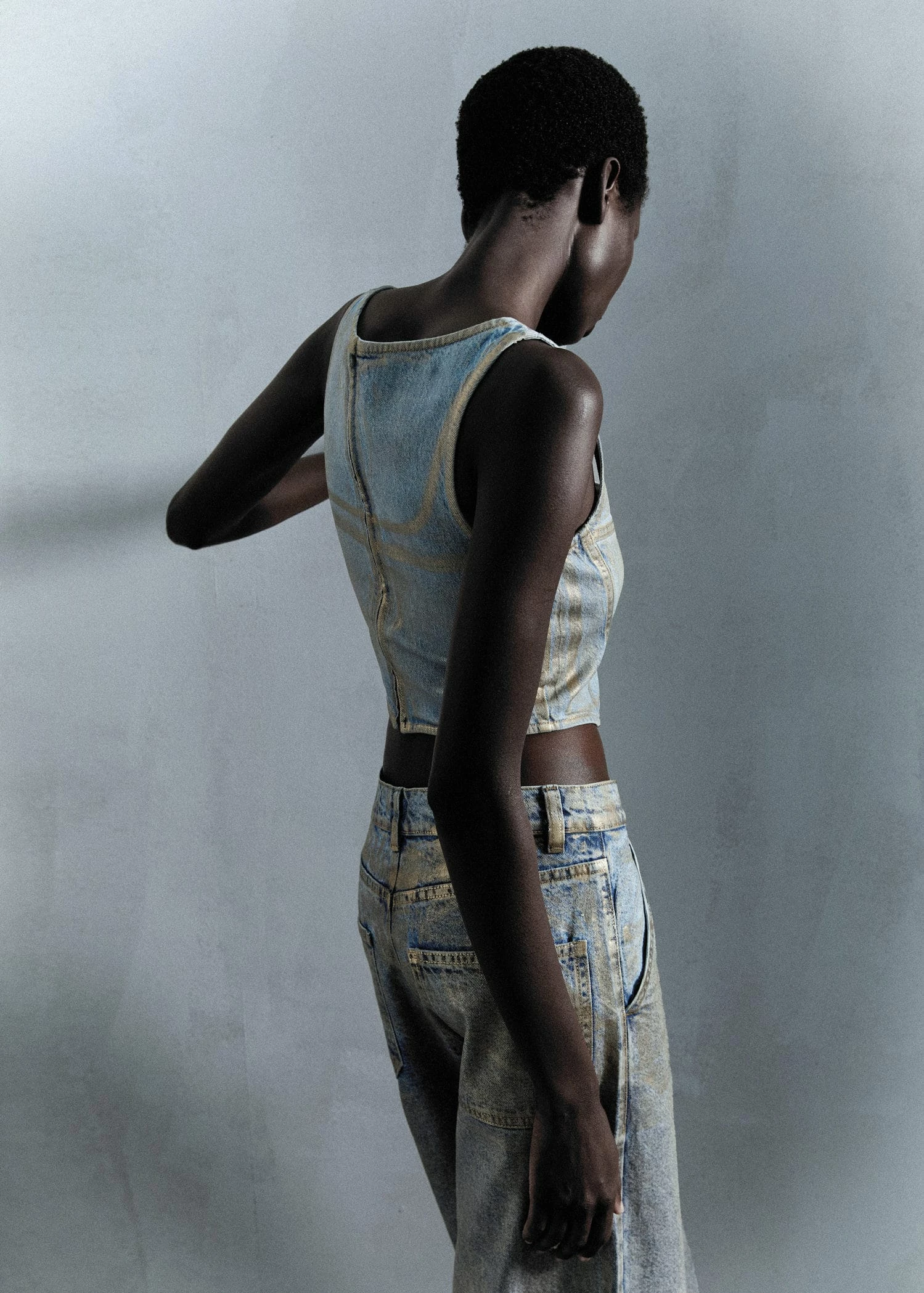 tissu en coton de style jean, ajuste, style crop, style corset, finition metallisee, sans manches, bretelles larges, fermeture eclair a l’arriereComposition: 100% coton