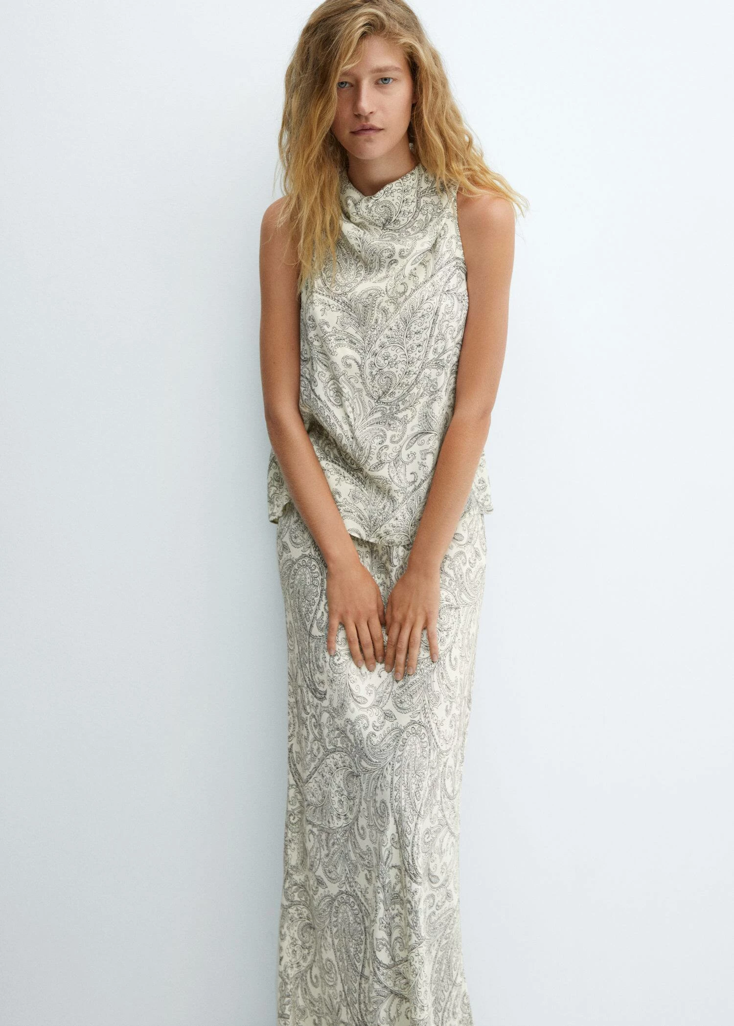 tissu fluide, coupe droite, effet satine, imprime paisley, emmanchures americaines, col drape, sans manches, fermeture crochet a l’arriere, total lookComposition: 100% viscose