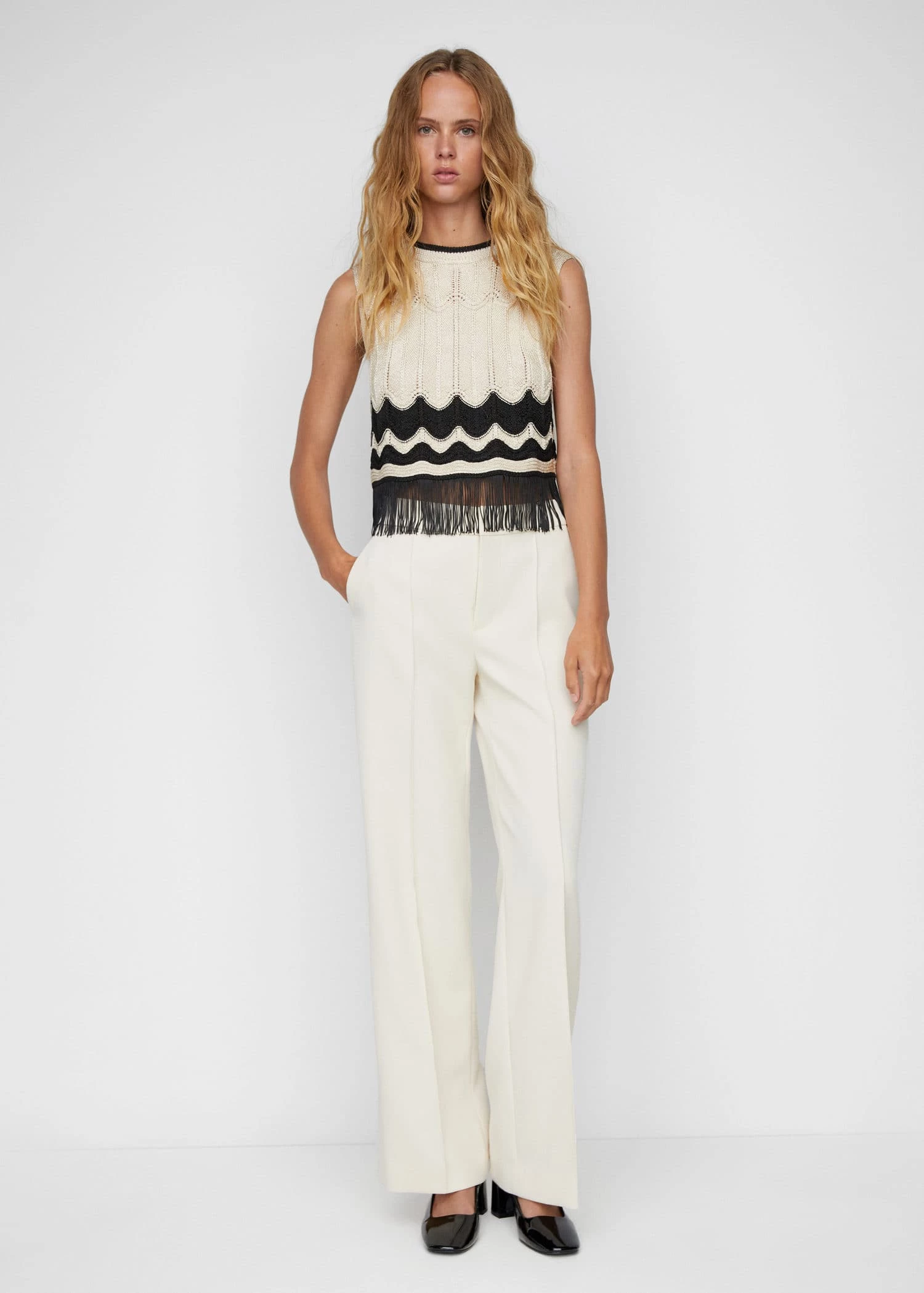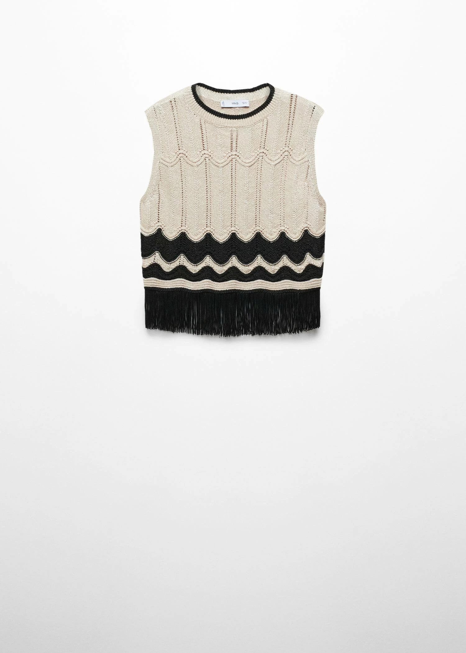 tissu en maille fine, coupe droite, style crop, bicolore, col rond, sans manches, bord frange, sans fermetureComposition: 60% polyester,40% polyester recyclé