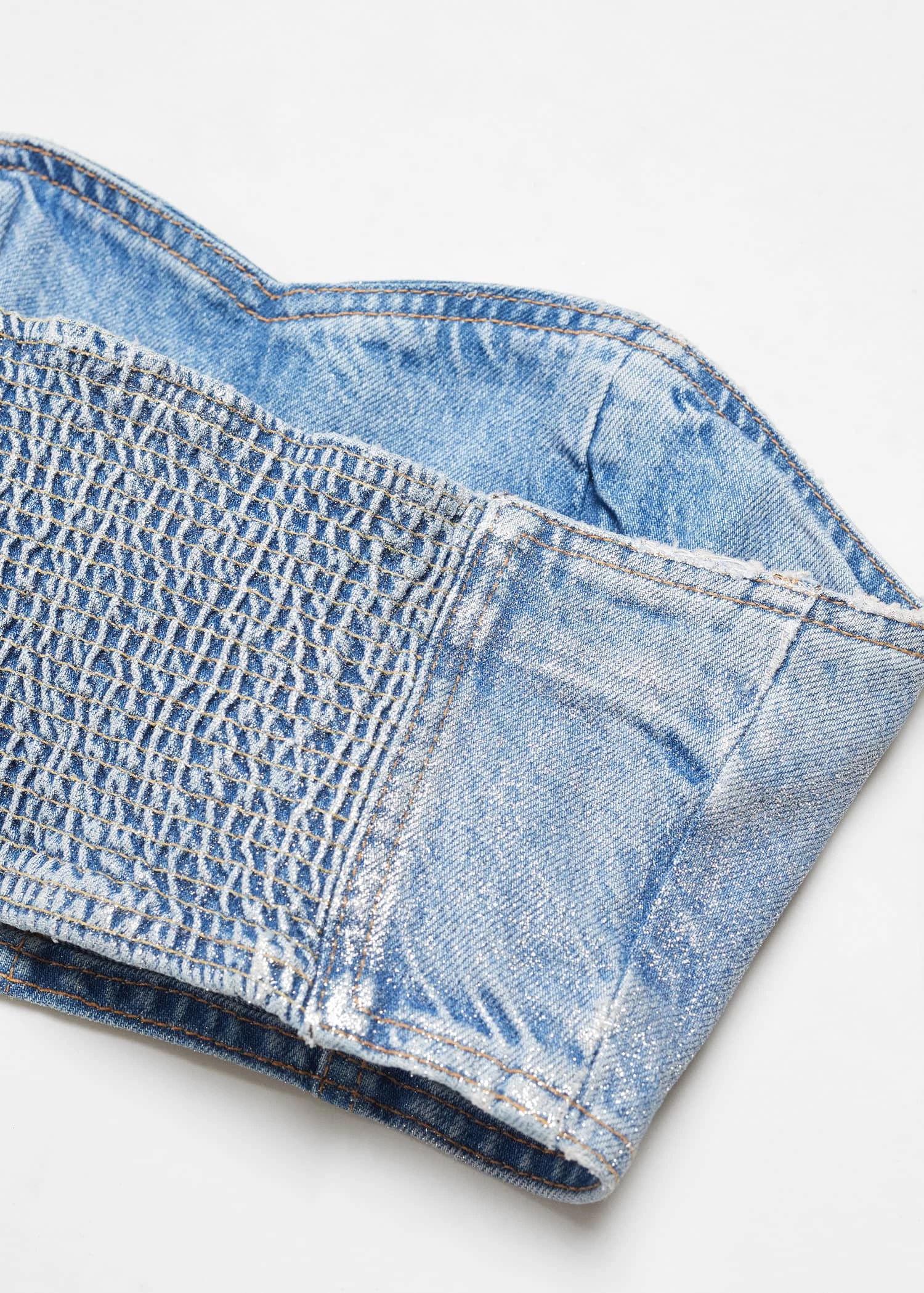 tissu en coton de style jean, tissu en coton organique recycle melange, tissu brillant, style corset, ajuste, style crop, sans manches, fronce elastique, sans fermeture, detail paillete, total look, saison des festivalsComposition: 80% coton,20% coton recyclé